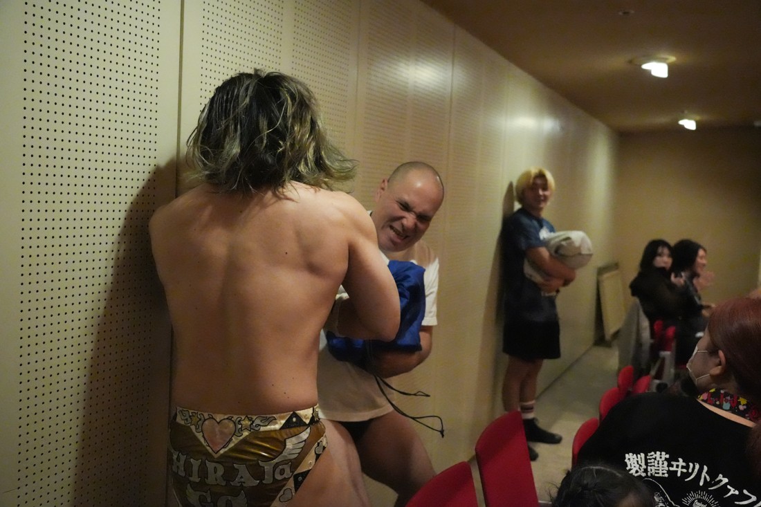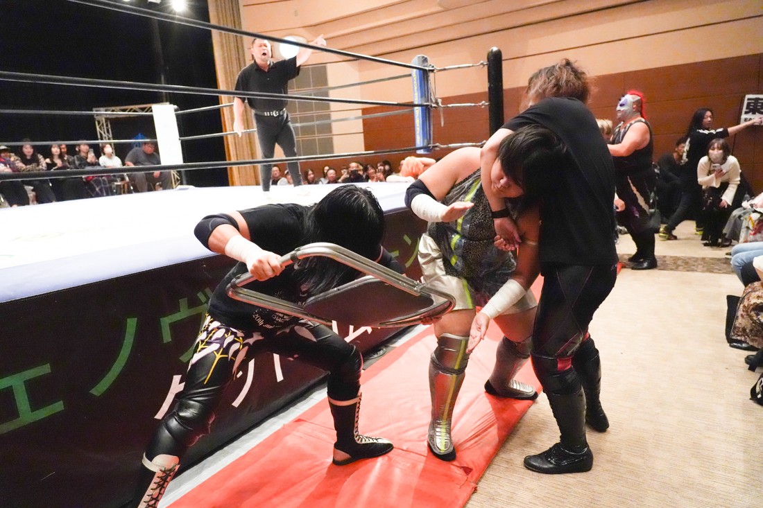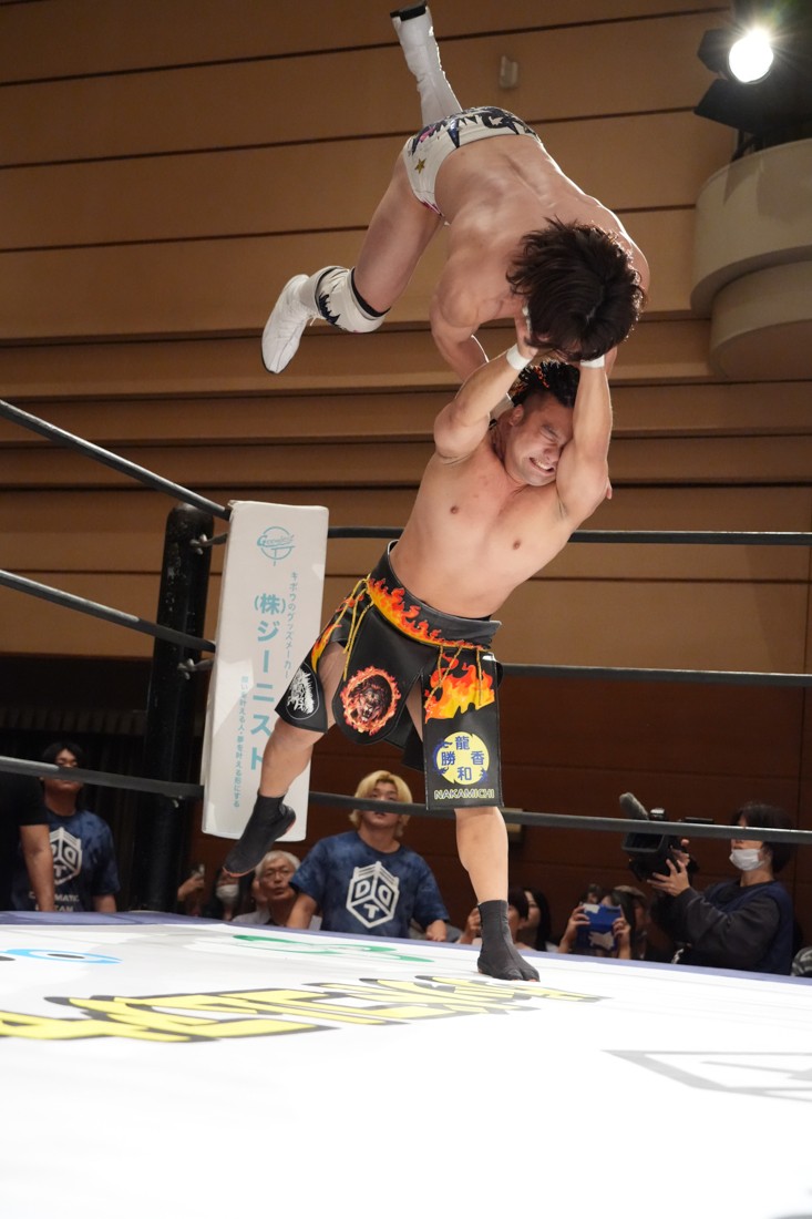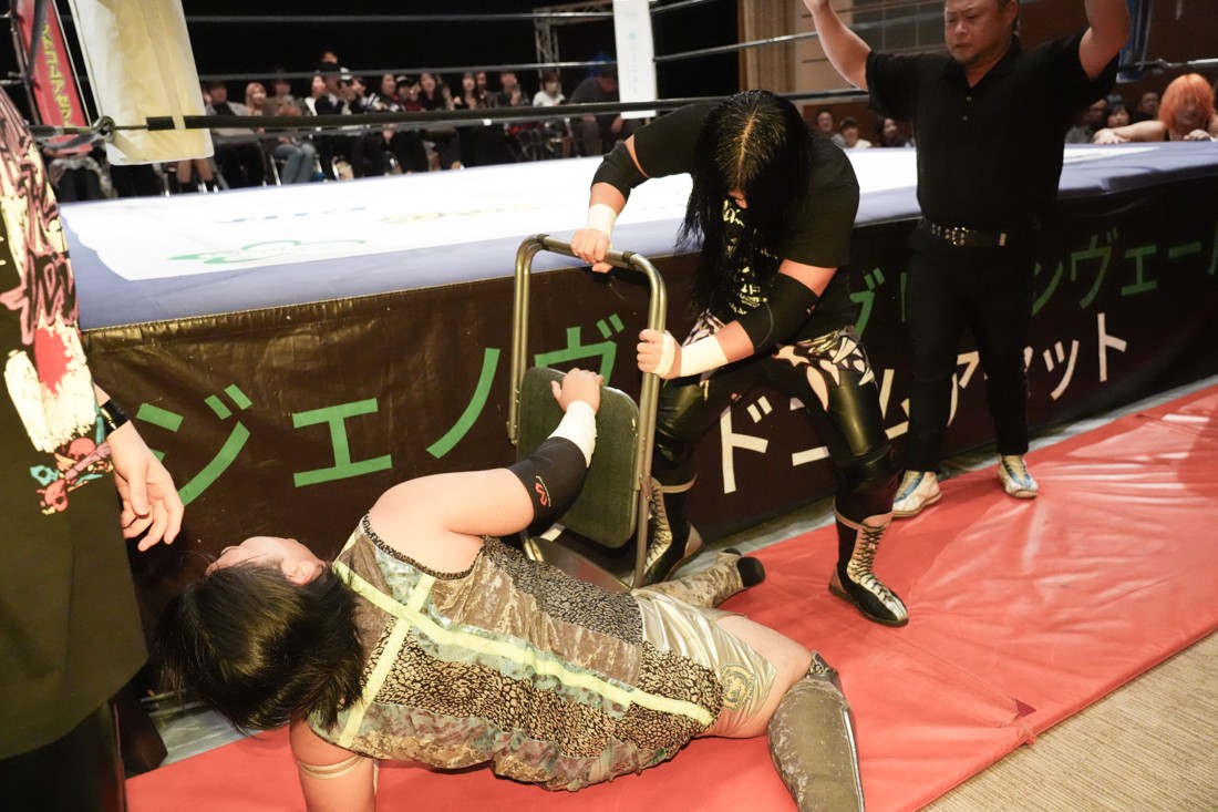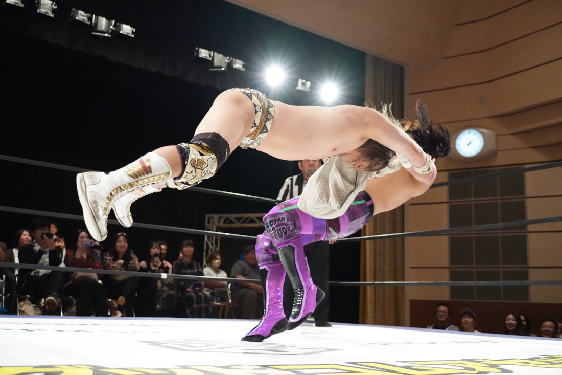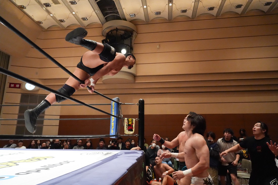 The Apex対策としてヘビー級に転向したMAOに対し、飯野は「ようこそヘビー級へ!」と言いながら体重の乗ったチョップやエルボーを叩き込む。MAOも真っ向から対抗し、ラリアットは何度も相打ちに。さらに飯野がThe Apexエルボーを狙ったところで、S.L.C.のKIMIHIROがエプロンに上がって「I am The Apex! Yeah!」と飯野のお株を奪っていく。怒った飯野はKIMIHIROに逆水平チョップを叩き込むと、ジワジワとMAOをパワーで追い詰めていく。