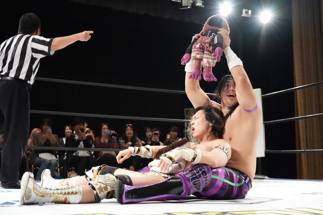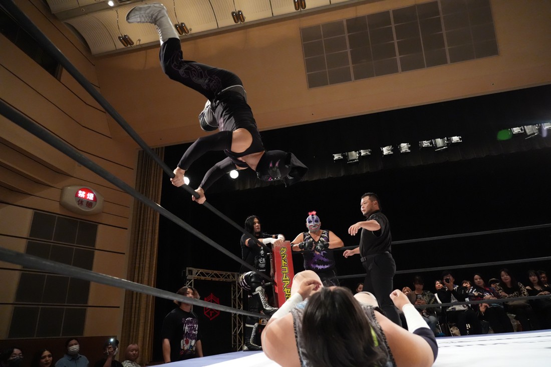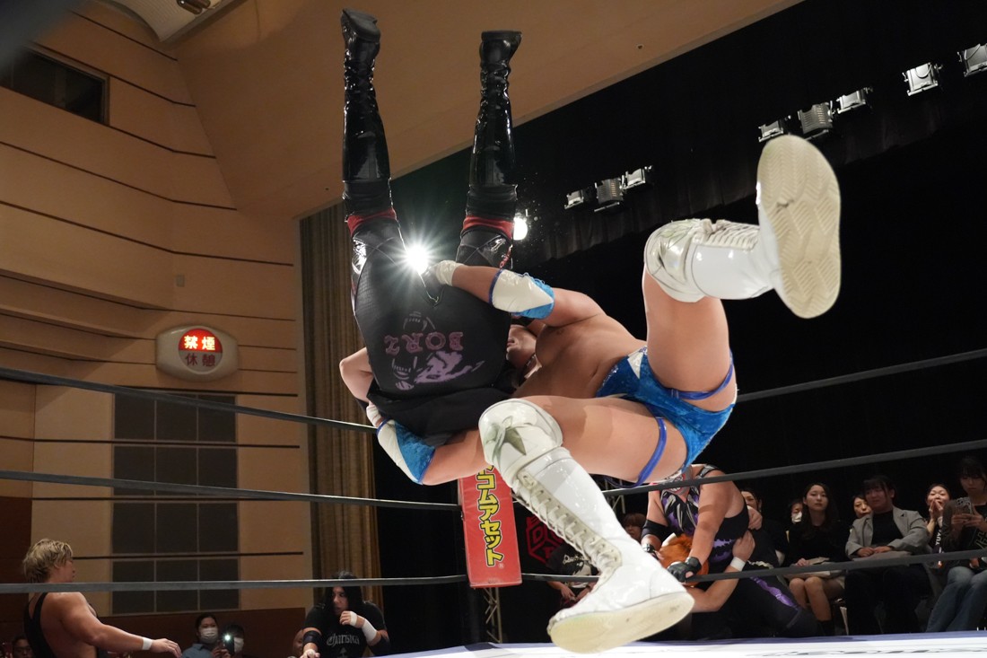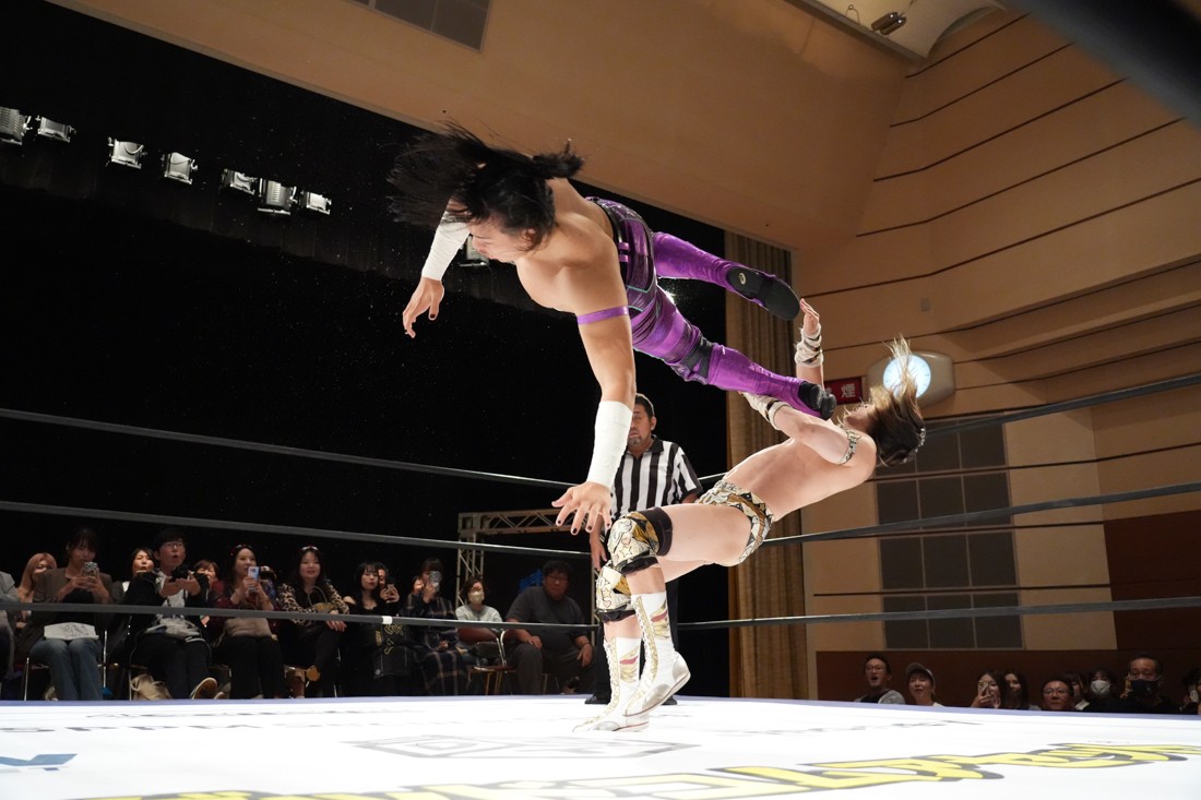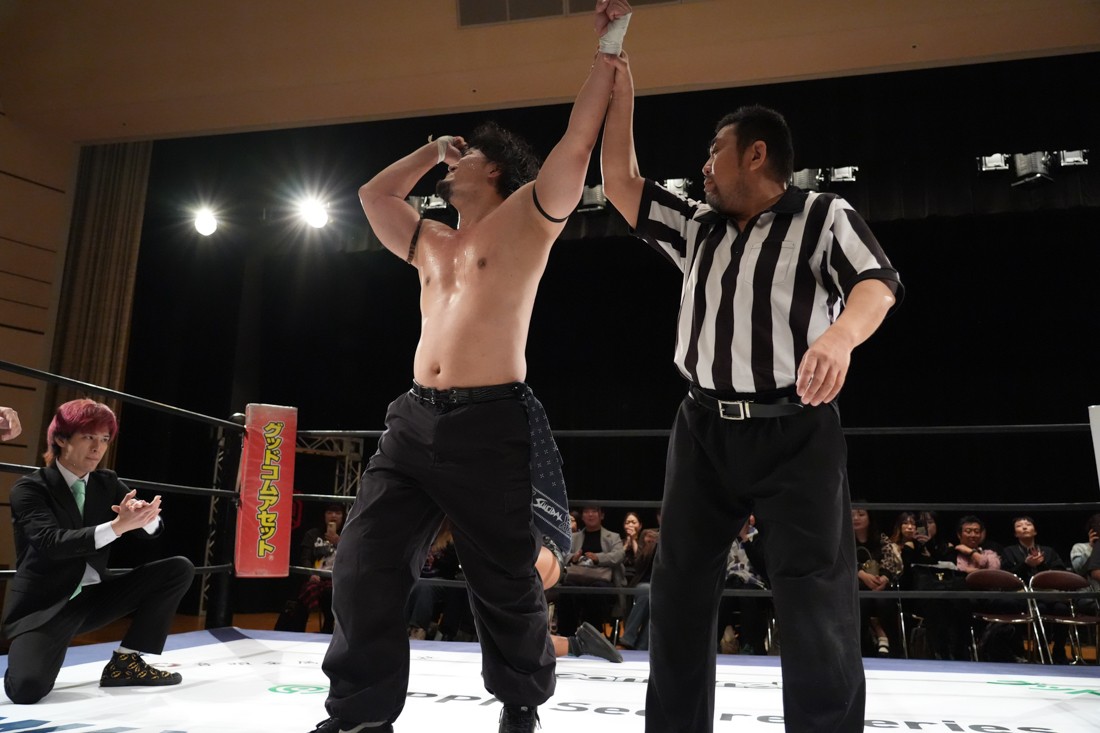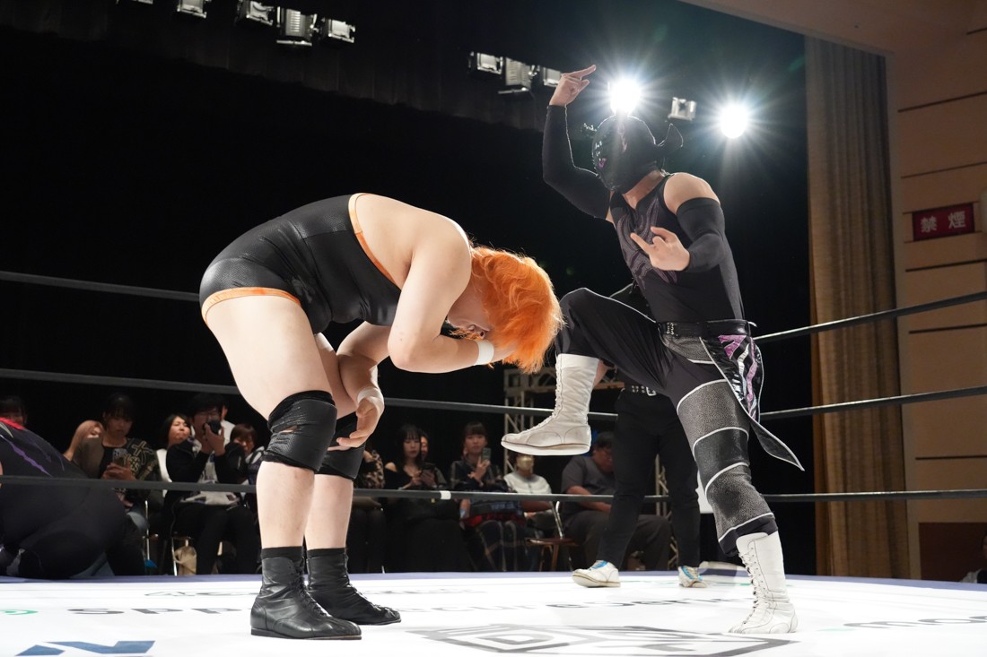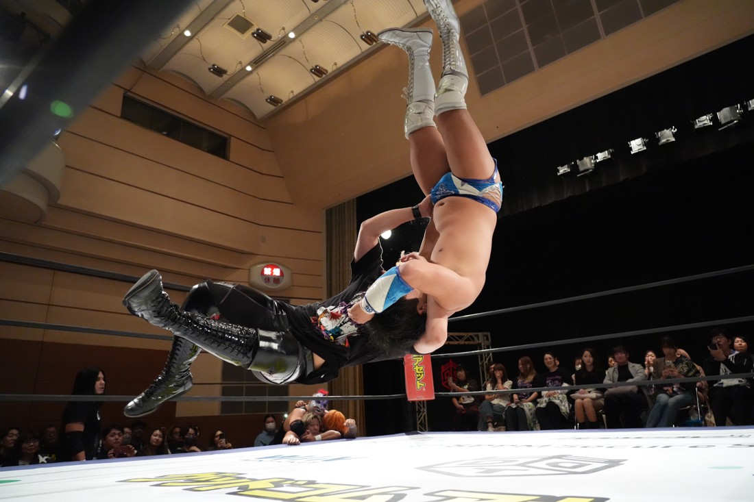 しかしMAOは飯野の顔面に何発も掌底を叩き込むと、会場のステージに一旦出てからリングに向かってダッシュ。走高跳の要領でロープを飛び越えて飯野にカッターを決めた。最後は飯野のスピアをジャンプしてかわすと、“外道クラッチからブリッジするやつ”を決めて3カウント。