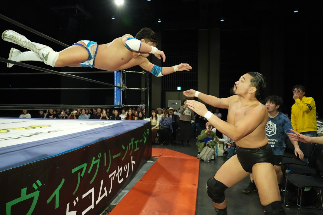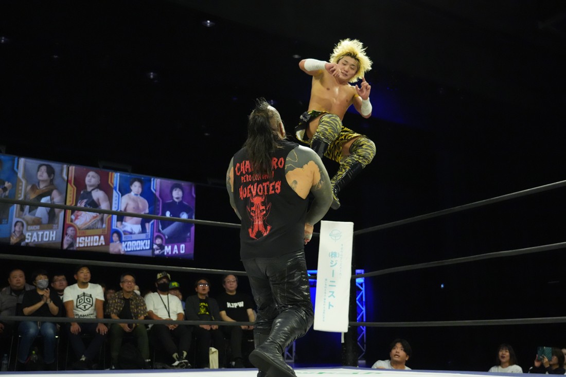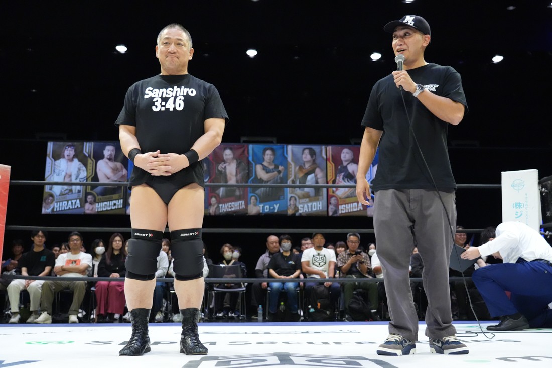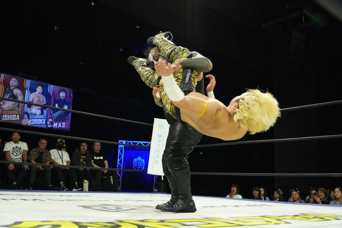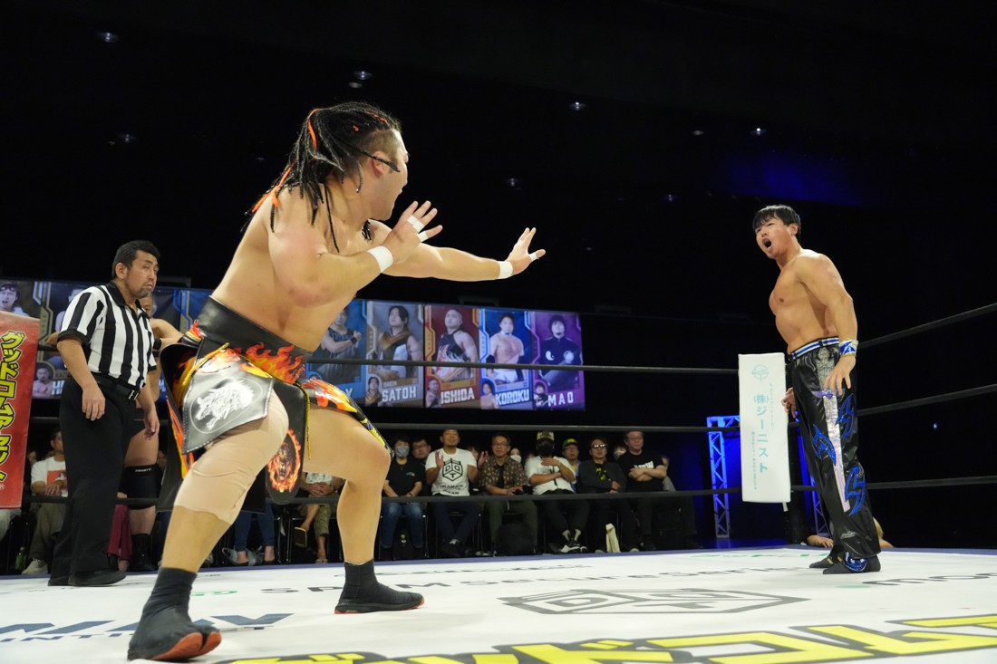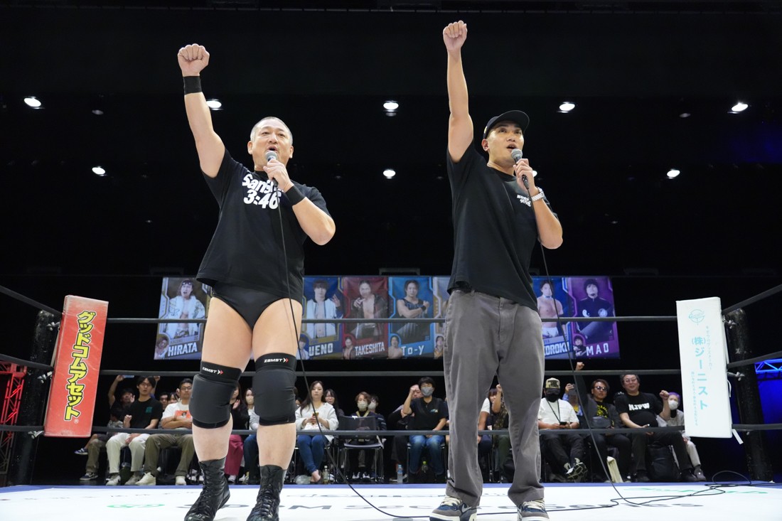 観客の「イシダ」コールを煽ってからTAKESHITAがマイクを渡すと、石田は「僕が想像つかないくらいTAKESHITAさんは強くて、立っているのがやっとなんですけど。TAKESHITAさんみたいなレスラーになれるように、僕はコツコツコツコツ頑張っていきたいと思います!」と言ってから、「地元の八代で年に1回やって、熊本市内でも年に1回、熊本で年に2回やるのが目標なんです!」と今後の目標を掲げた。