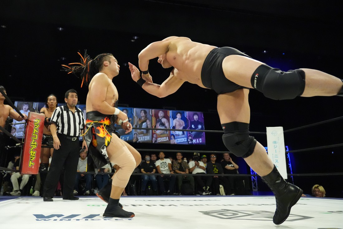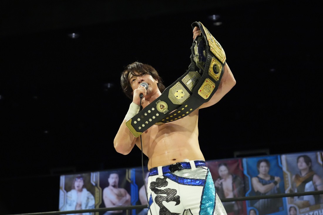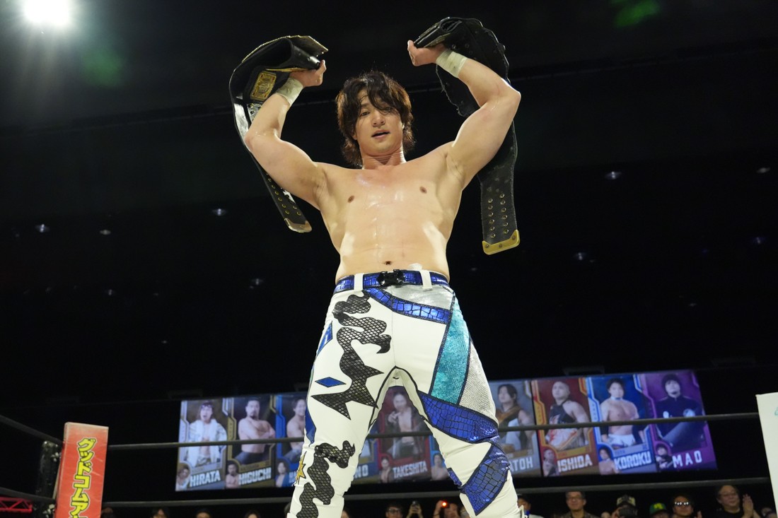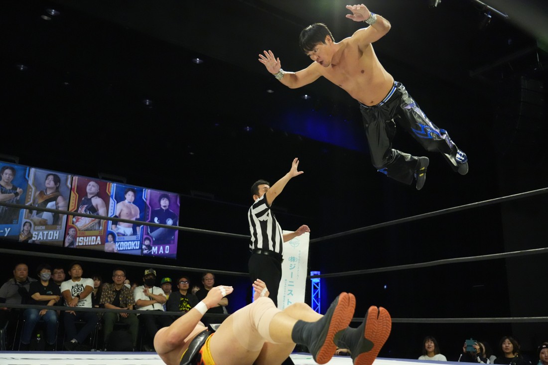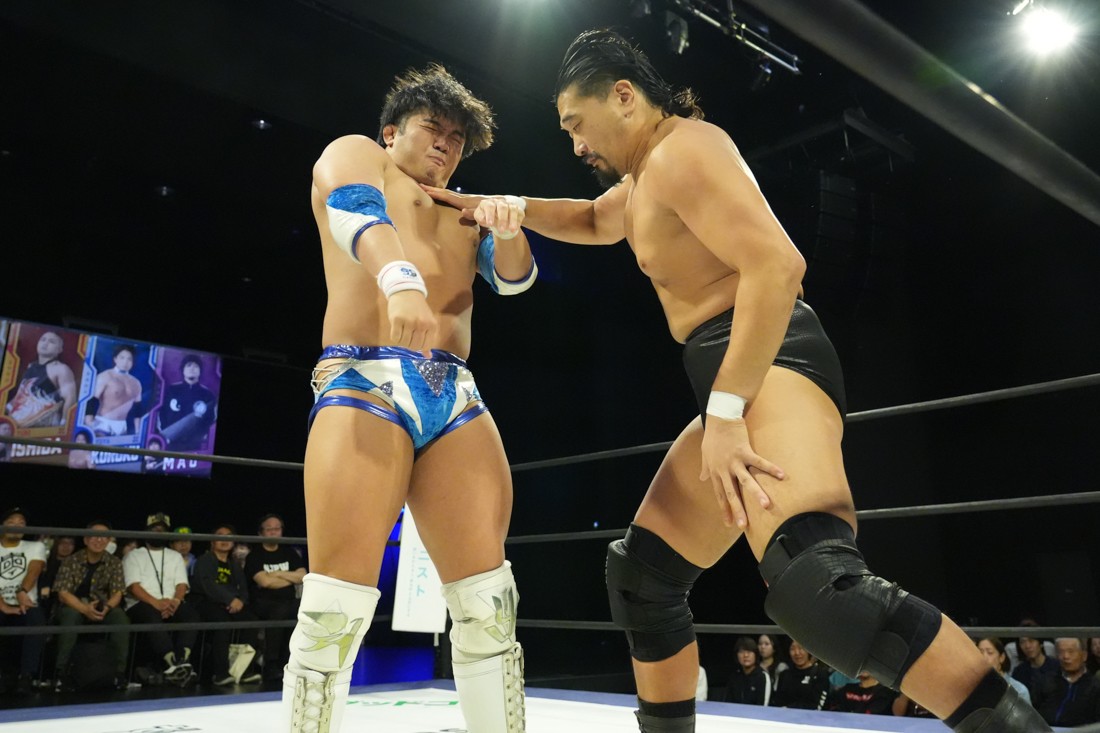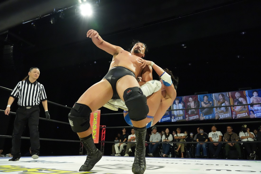 観客の「イシダ」コールを煽ってからTAKESHITAがマイクを渡すと、石田は「僕が想像つかないくらいTAKESHITAさんは強くて、立っているのがやっとなんですけど。TAKESHITAさんみたいなレスラーになれるように、僕はコツコツコツコツ頑張っていきたいと思います!」と言ってから、「地元の八代で年に1回やって、熊本市内でも年に1回、熊本で年に2回やるのが目標なんです!」と今後の目標を掲げた。
