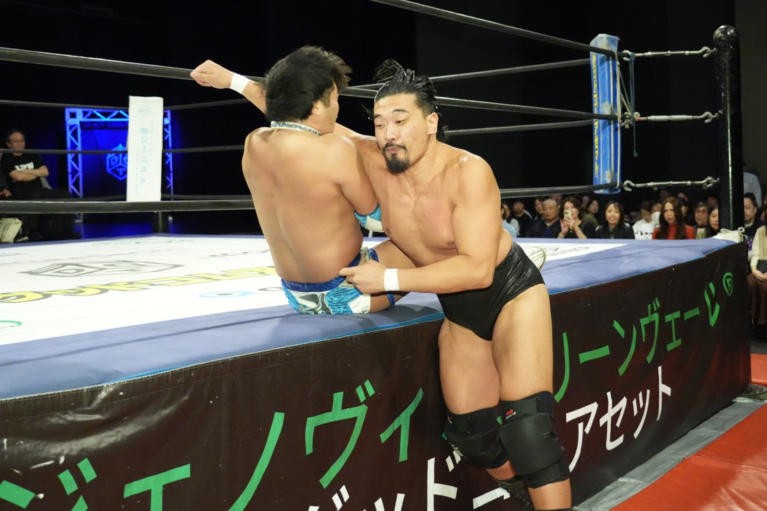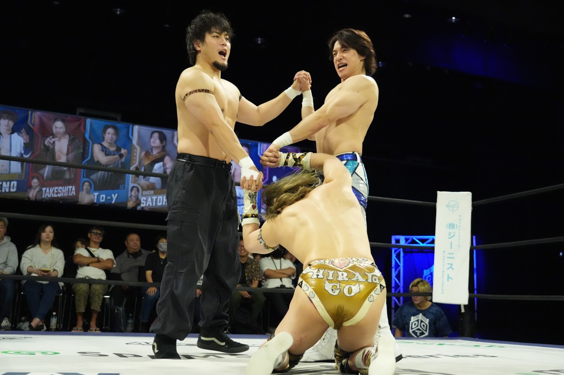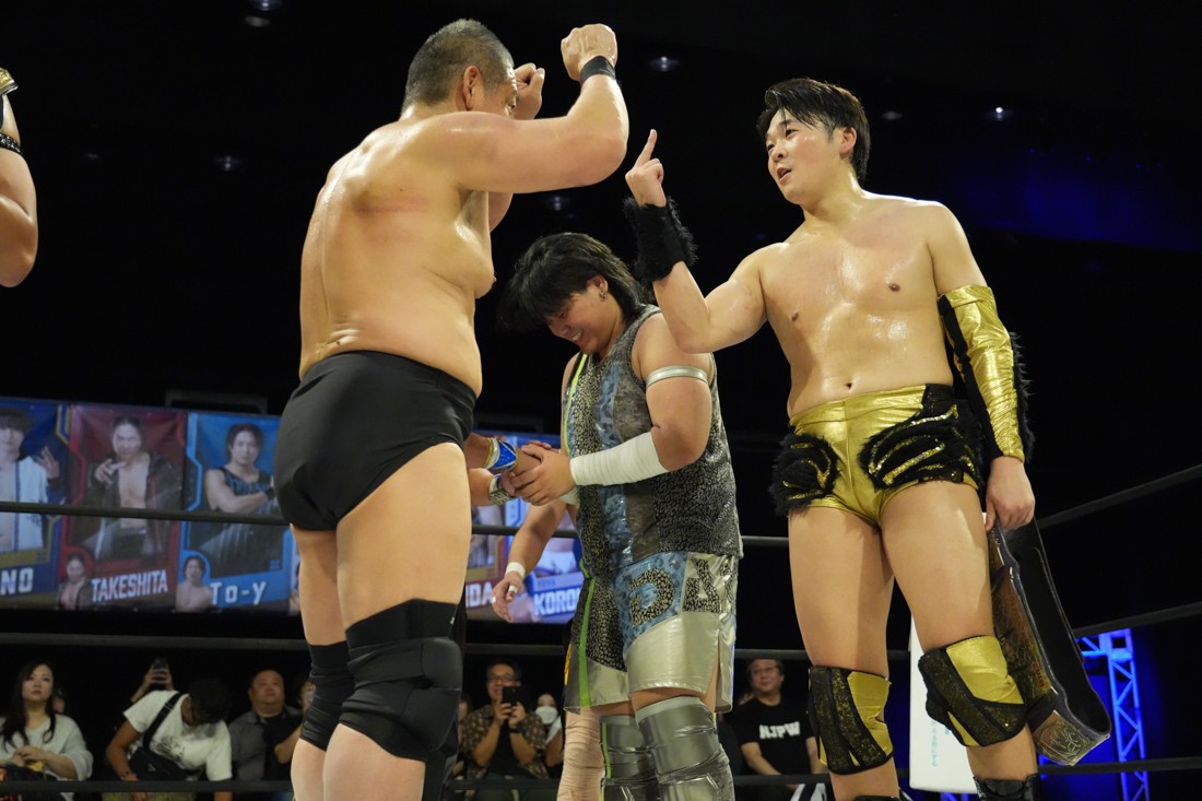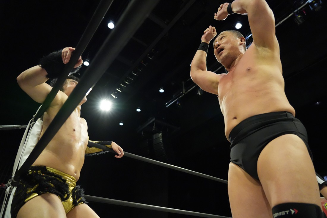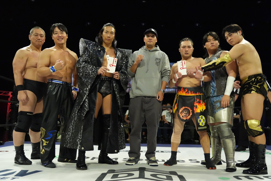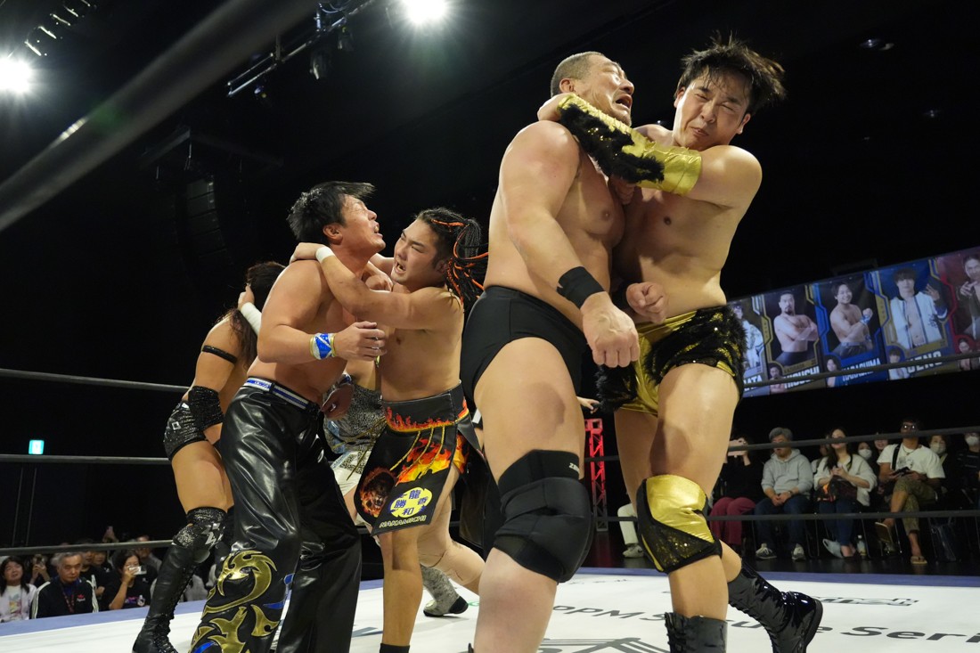 DGS世代にとってはTAKESHITAをはじめ、髙木、HARASHIMAとも対戦できる貴重な機会。とくにTo-yは11月30日後楽園ホール大会で髙木とEXTREME王座の防衛戦が決まってるため、激しくやり合う。TAKESHITAは石田を場外に連れ出し、床にDDTで叩き付けると、リングに戻る前にTo-yと大地を睨み付ける。