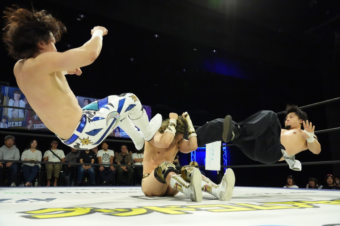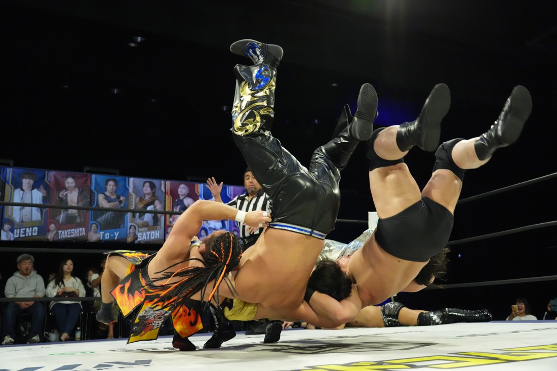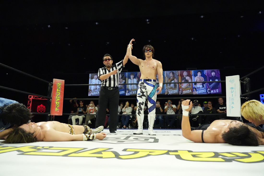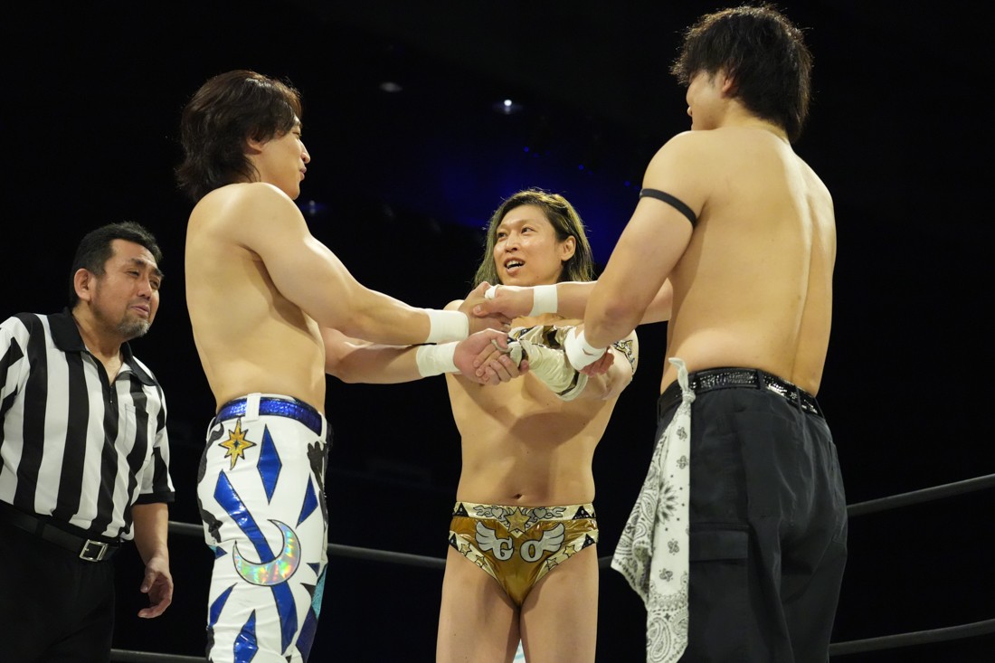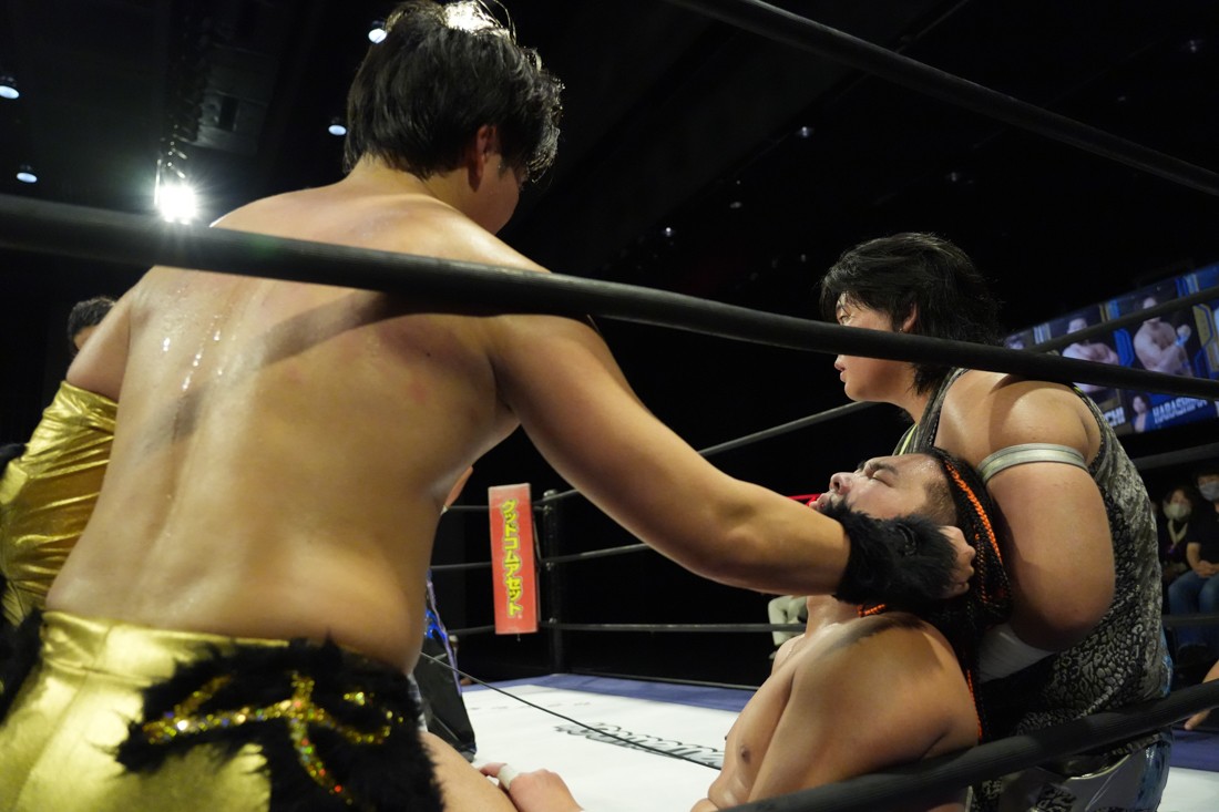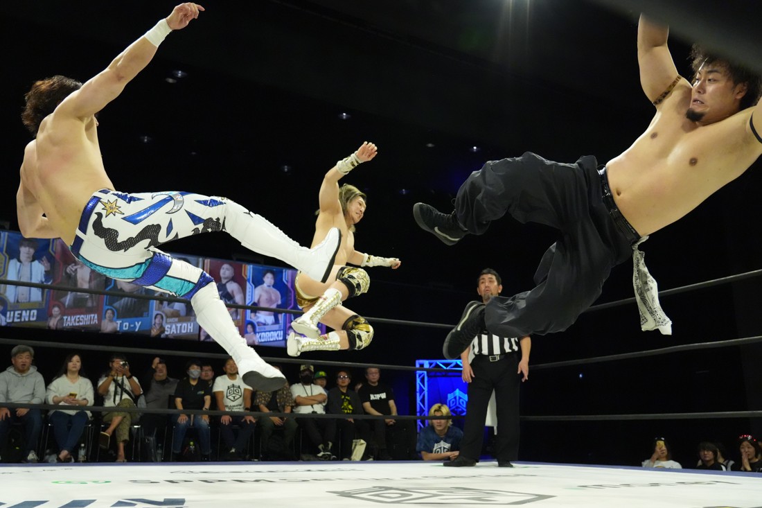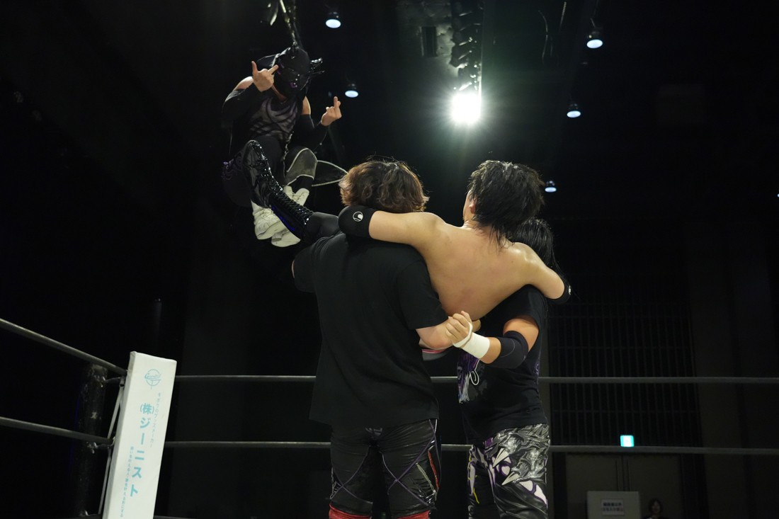 上野勇希、MAOwithKIMIHIRO、平田一喜による珍しい3WAYマッチが実現。試合が混とんとしてくると、10月25日大阪大会での試合のように両者の“スタンド”(特殊なメガネをかけると見える)による対戦に。そこに入ってきた上野は世界観をブチ壊すかのように平田の“本体”にエルボーを叩き込む。しかしMAOが平田と協力して、平田メガネを上野に装着すると上野もスタンド使いとなり、最後は上野のスタンドがMAOと平田のスタンドにダブルでチョークスラムを決めて勝利した。