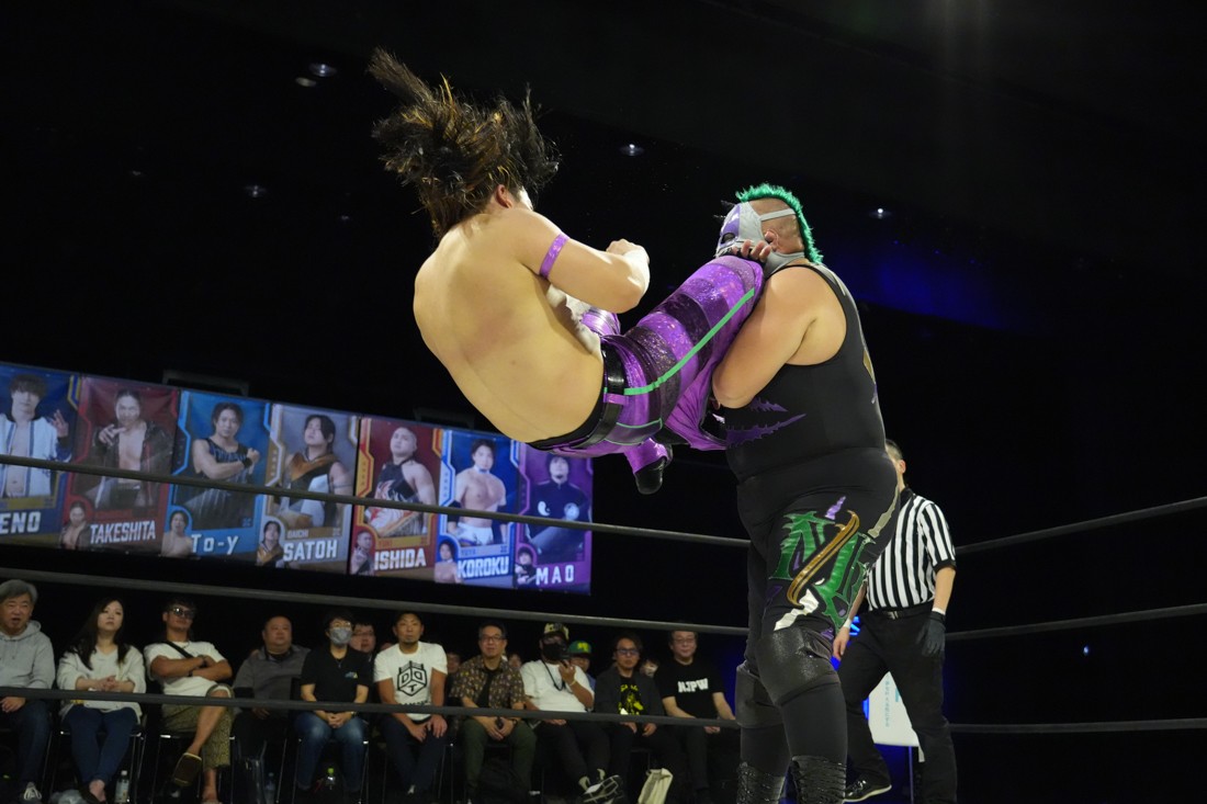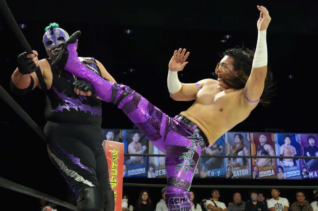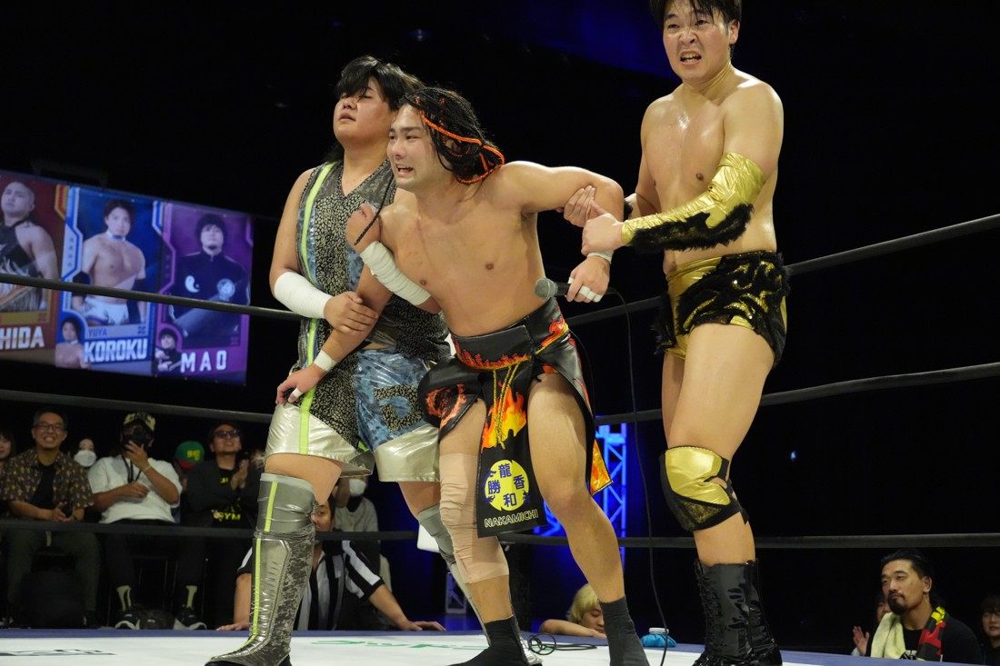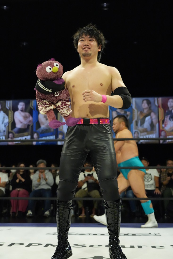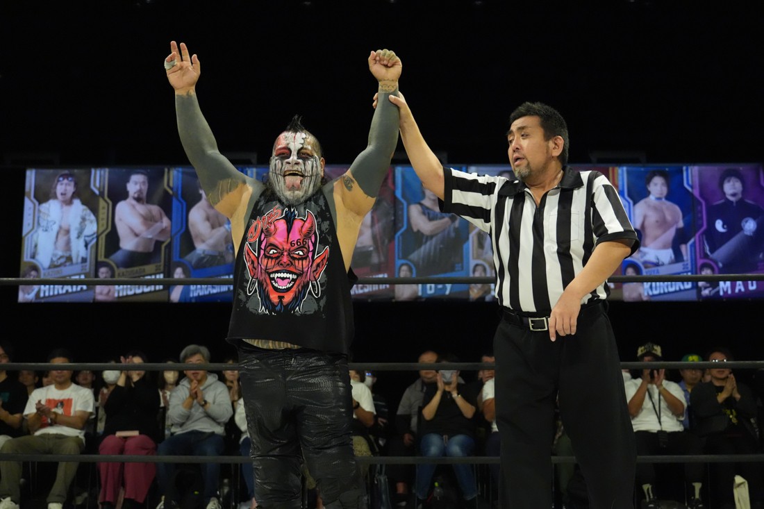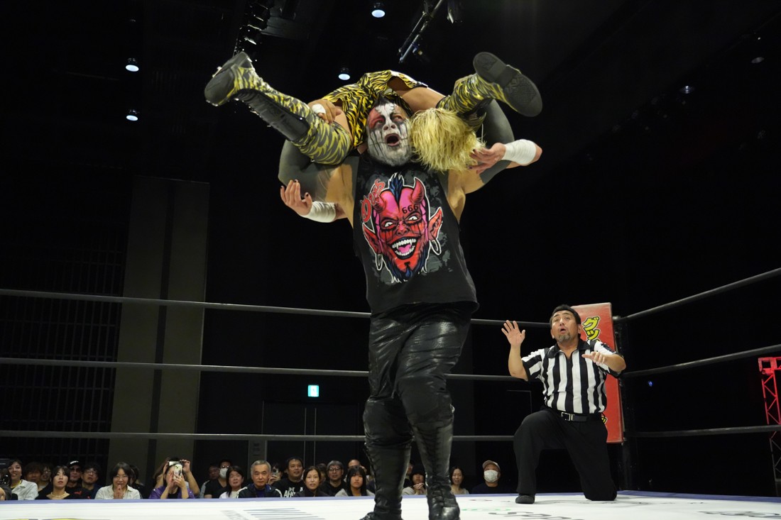 上野勇希、MAOwithKIMIHIRO、平田一喜による珍しい3WAYマッチが実現。試合が混とんとしてくると、10月25日大阪大会での試合のように両者の“スタンド”(特殊なメガネをかけると見える)による対戦に。そこに入ってきた上野は世界観をブチ壊すかのように平田の“本体”にエルボーを叩き込む。しかしMAOが平田と協力して、平田メガネを上野に装着すると上野もスタンド使いとなり、最後は上野のスタンドがMAOと平田のスタンドにダブルでチョークスラムを決めて勝利した。