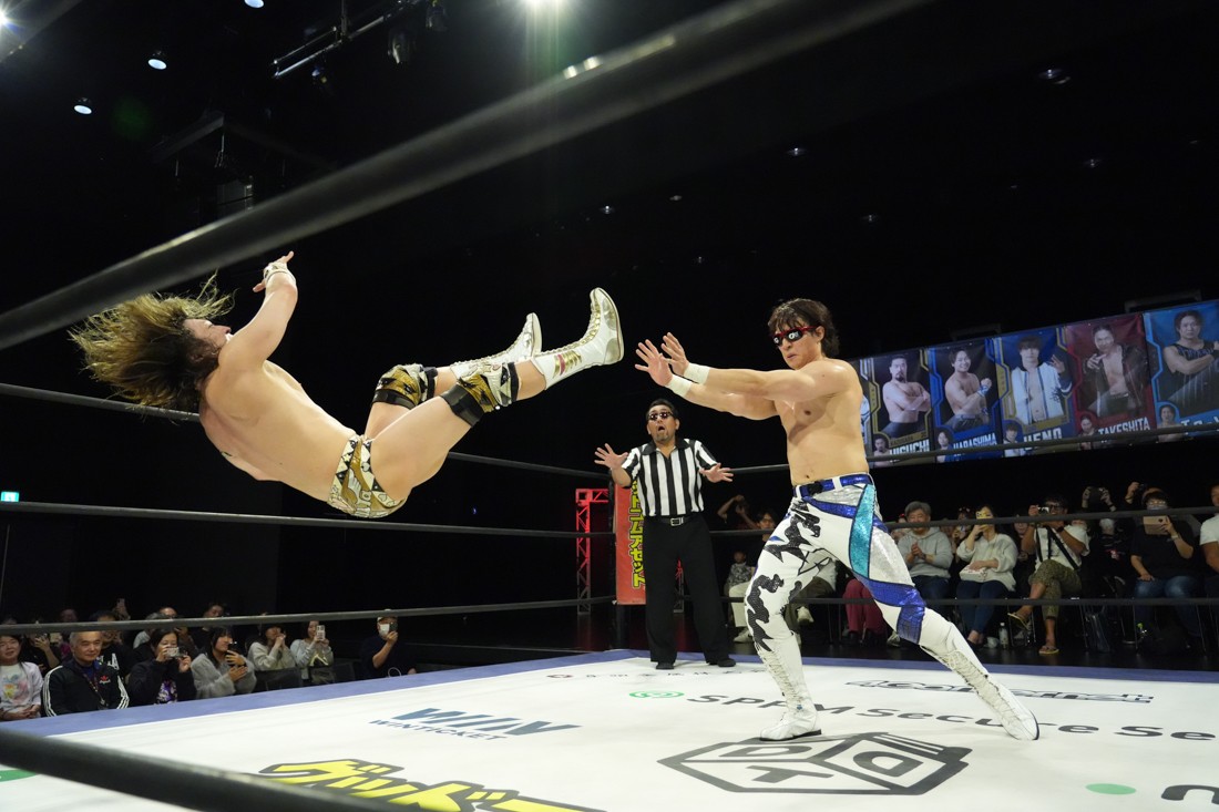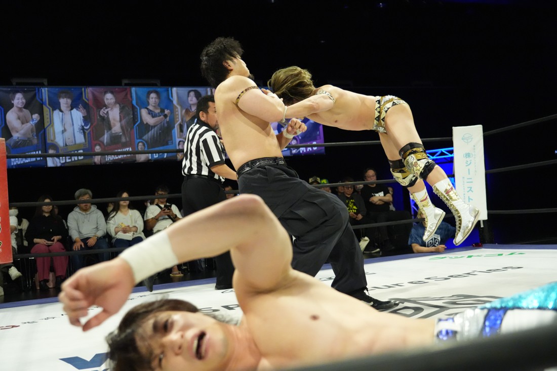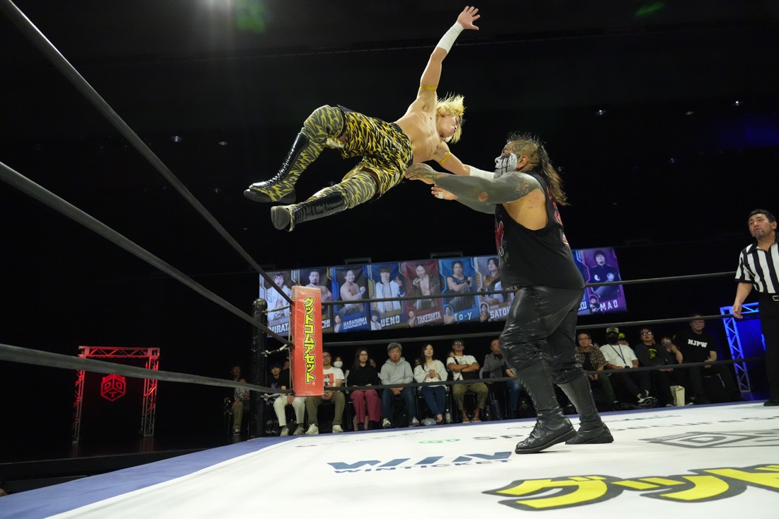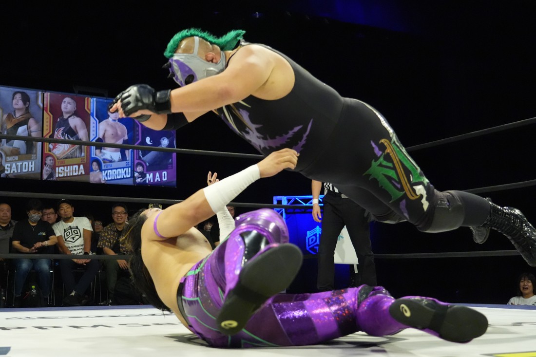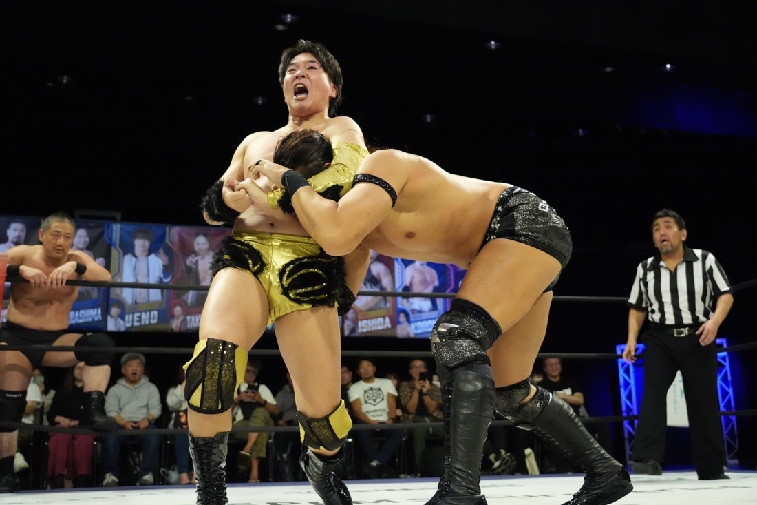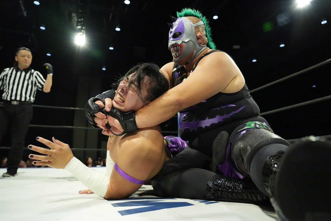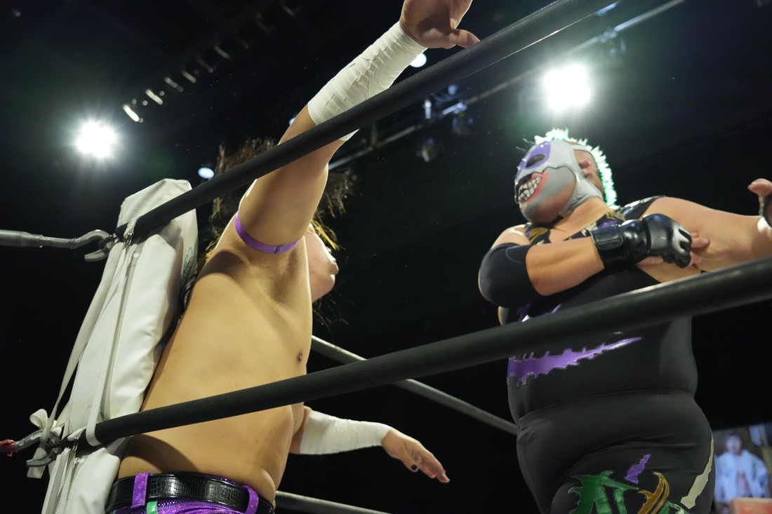 上野勇希、MAOwithKIMIHIRO、平田一喜による珍しい3WAYマッチが実現。試合が混とんとしてくると、10月25日大阪大会での試合のように両者の“スタンド”(特殊なメガネをかけると見える)による対戦に。そこに入ってきた上野は世界観をブチ壊すかのように平田の“本体”にエルボーを叩き込む。しかしMAOが平田と協力して、平田メガネを上野に装着すると上野もスタンド使いとなり、最後は上野のスタンドがMAOと平田のスタンドにダブルでチョークスラムを決めて勝利した。