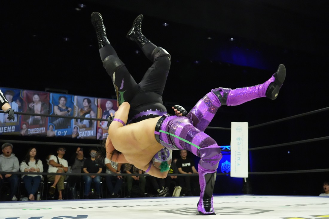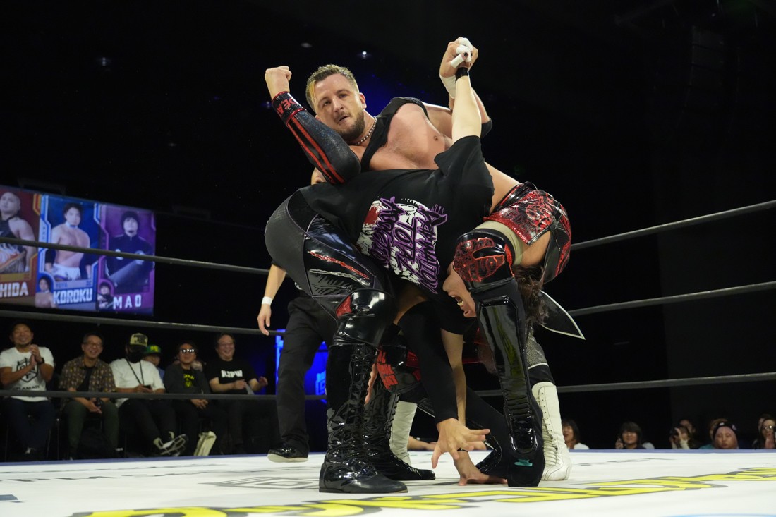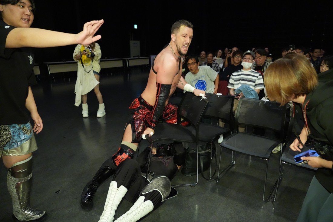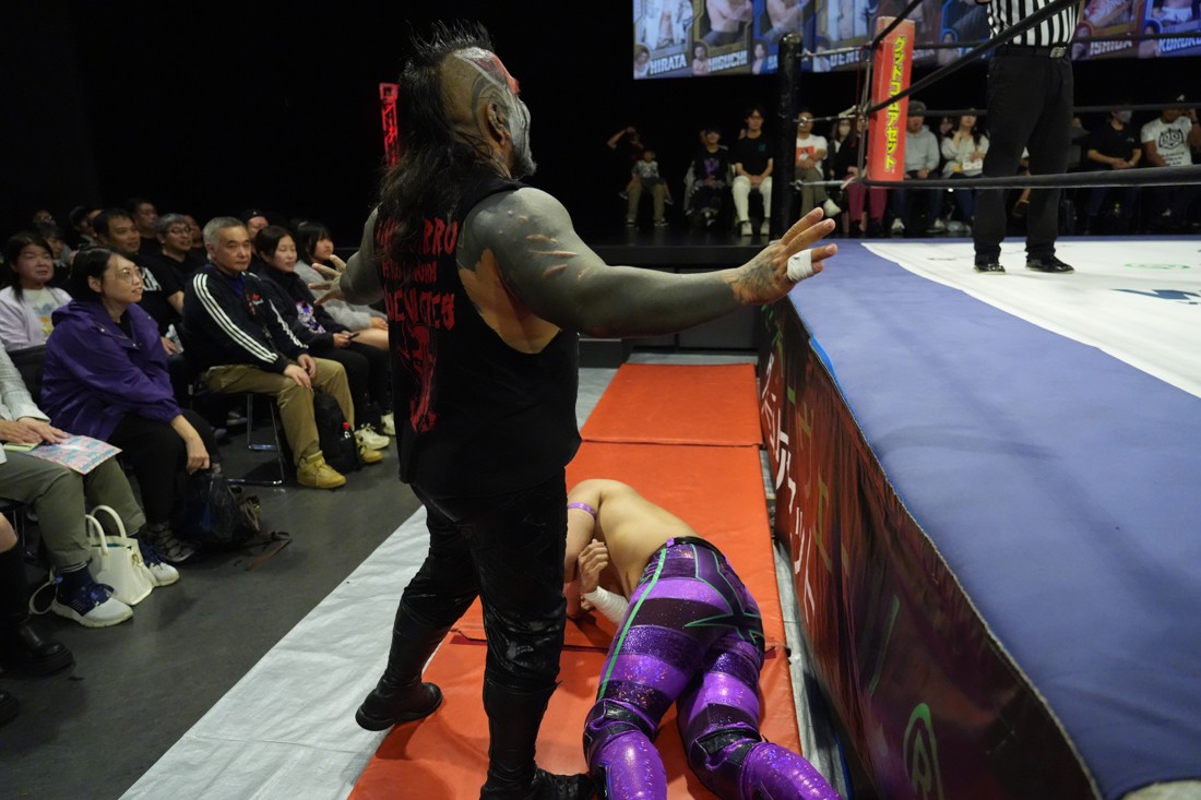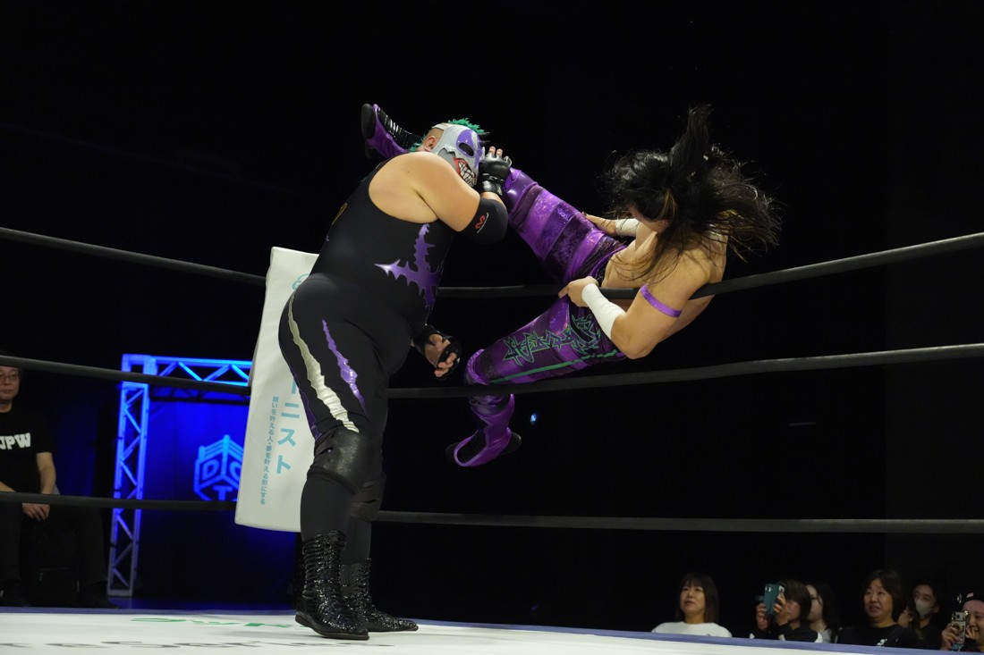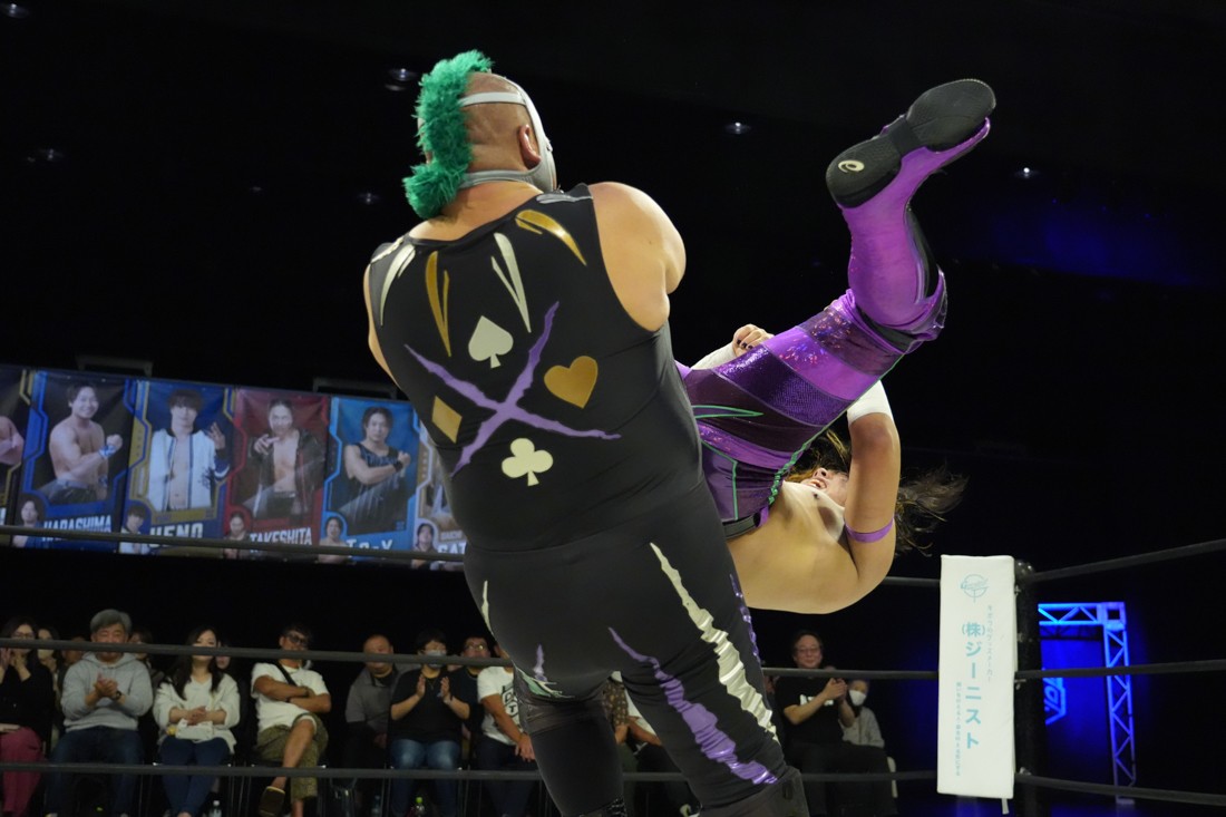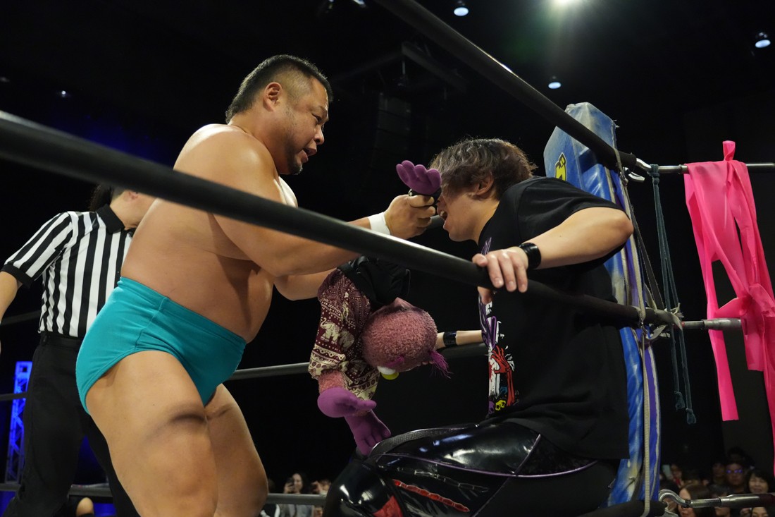 上野勇希、MAOwithKIMIHIRO、平田一喜による珍しい3WAYマッチが実現。試合が混とんとしてくると、10月25日大阪大会での試合のように両者の“スタンド”(特殊なメガネをかけると見える)による対戦に。そこに入ってきた上野は世界観をブチ壊すかのように平田の“本体”にエルボーを叩き込む。しかしMAOが平田と協力して、平田メガネを上野に装着すると上野もスタンド使いとなり、最後は上野のスタンドがMAOと平田のスタンドにダブルでチョークスラムを決めて勝利した。
