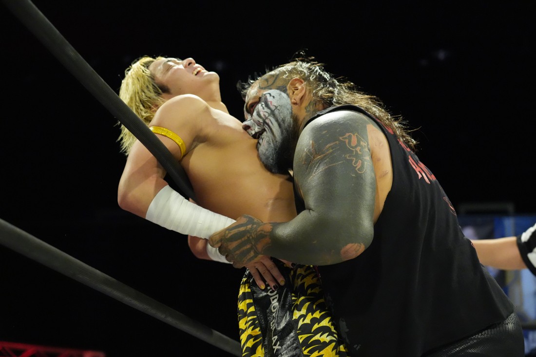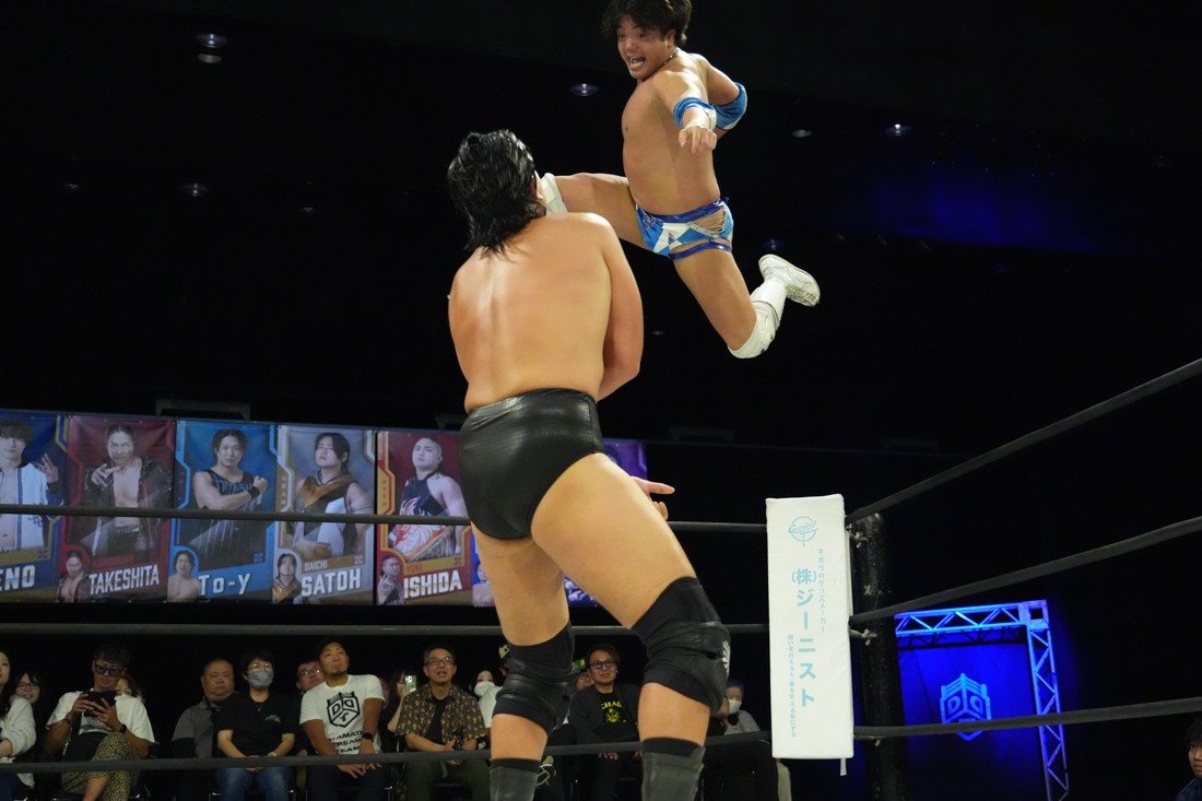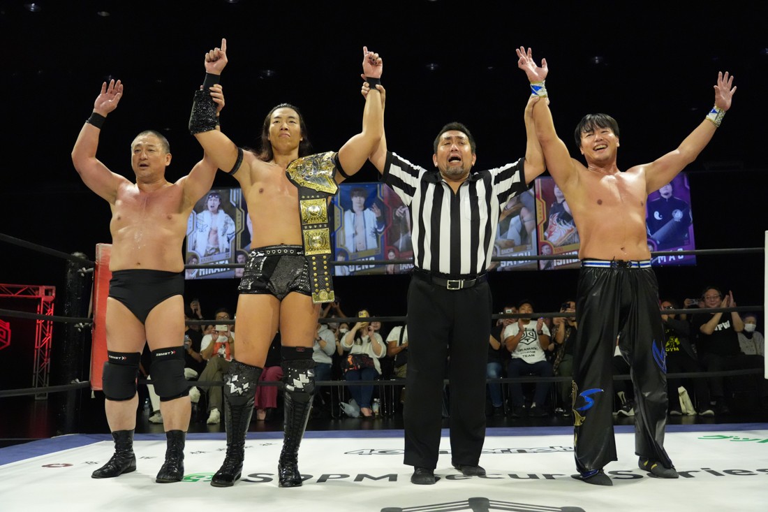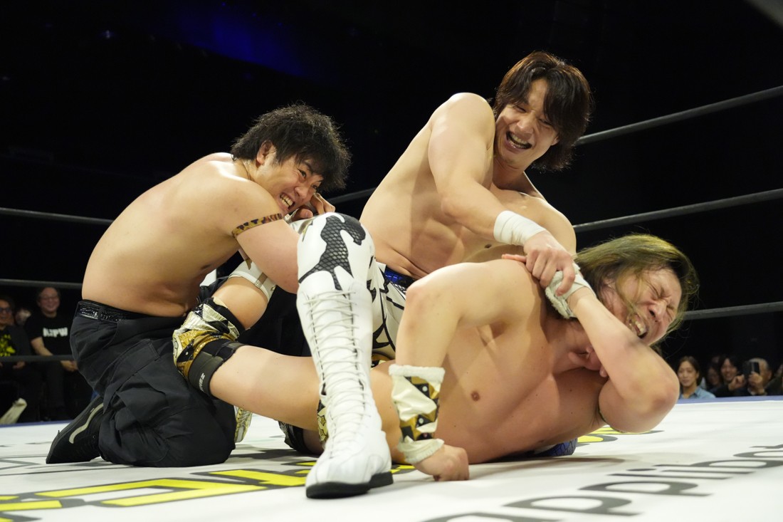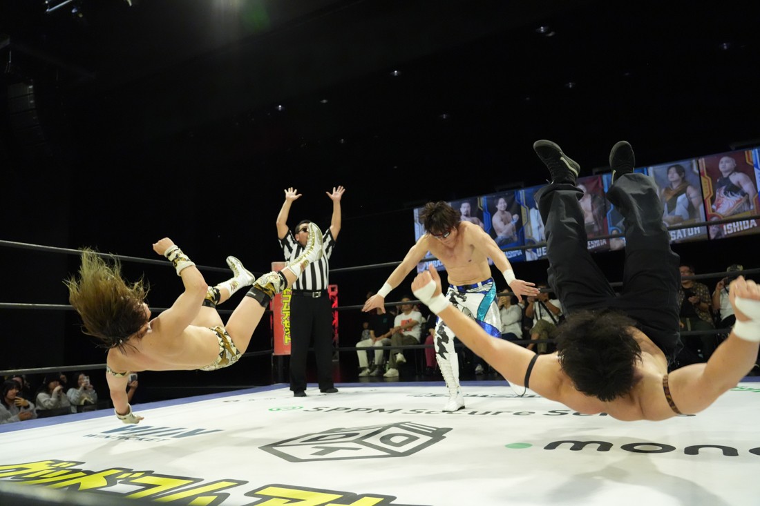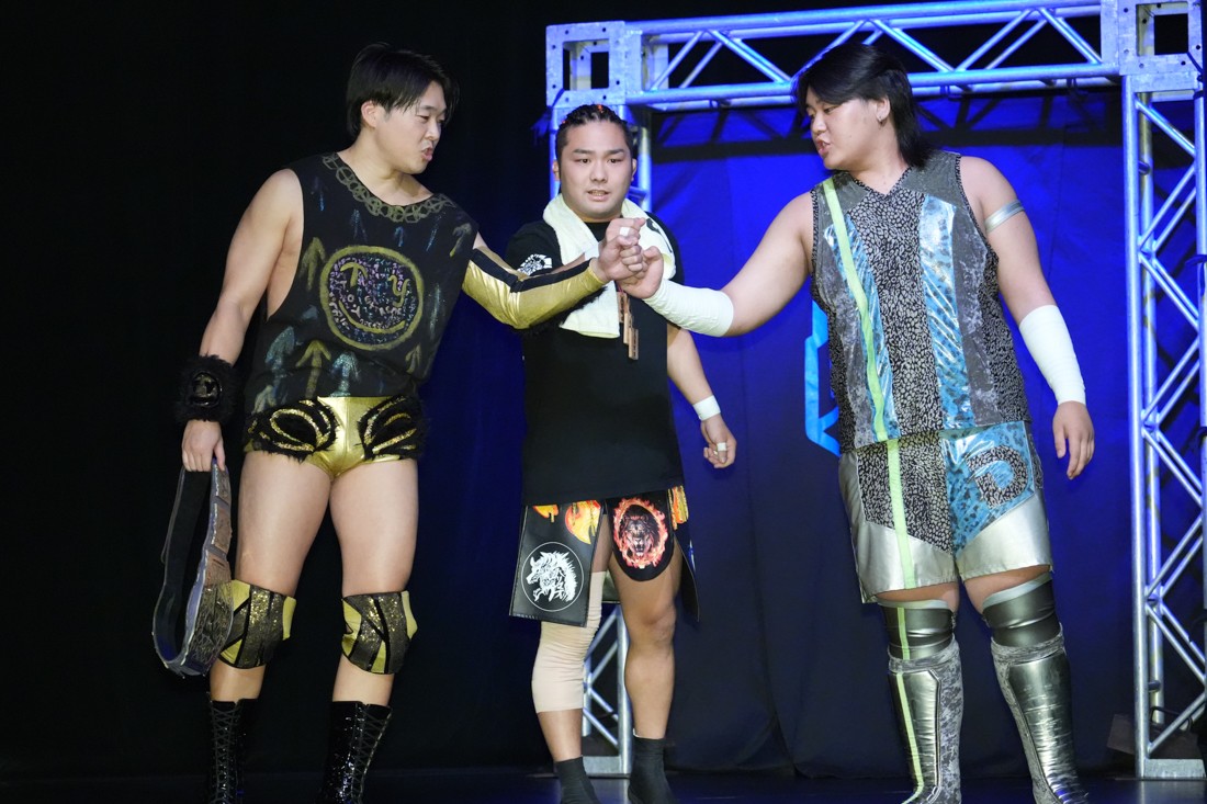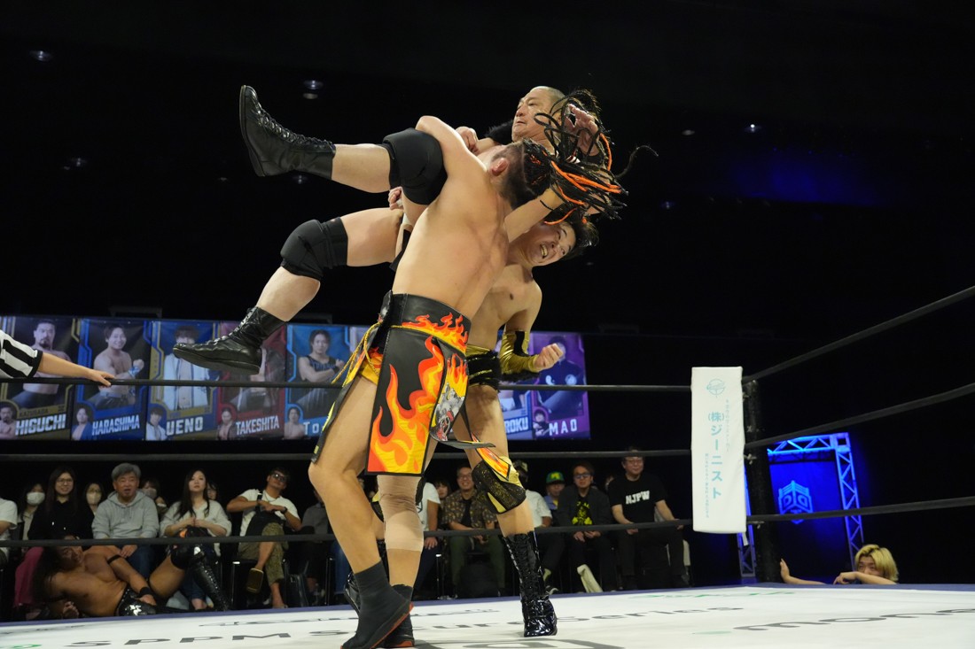 どうにか突破口を見つけたいDGSトリオだが、三人で一斉に攻撃してもTo-yと大地は場外に投げ出され、石田一人がリング上に。必死に三世代トリオにエルボーを叩き込んでいった石田だが、髙木のスタナー、HARASHIMAのスタンディング式蒼魔刀、TAKESHITAのブルーサンダー・ボムを食らってしまう。辛くもカウント2でカットされると、石田はTAKESHITAに対してぶちかましや炎掌で向かって行くが、TAKESHITAは突進してきた石田を上手投げ。それでもなお突進する石田だが、がっちり受け止めたTAKSHITAはレイジングファイヤーで叩き付け3カウント。