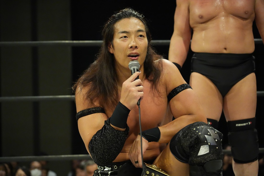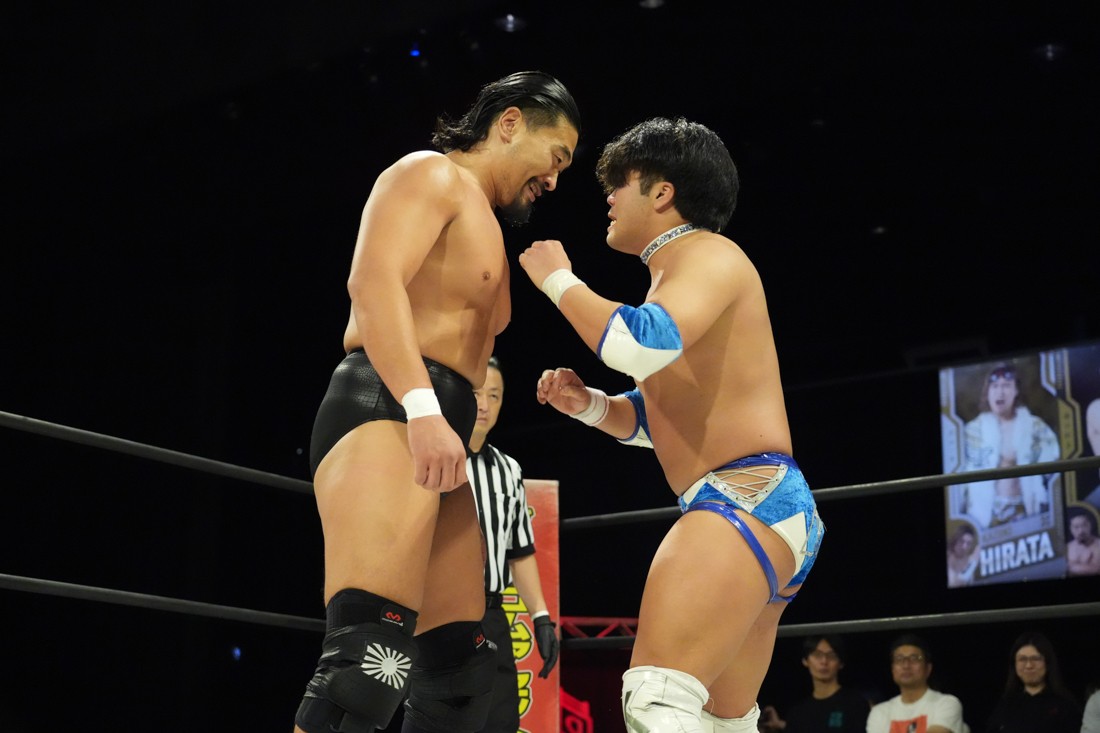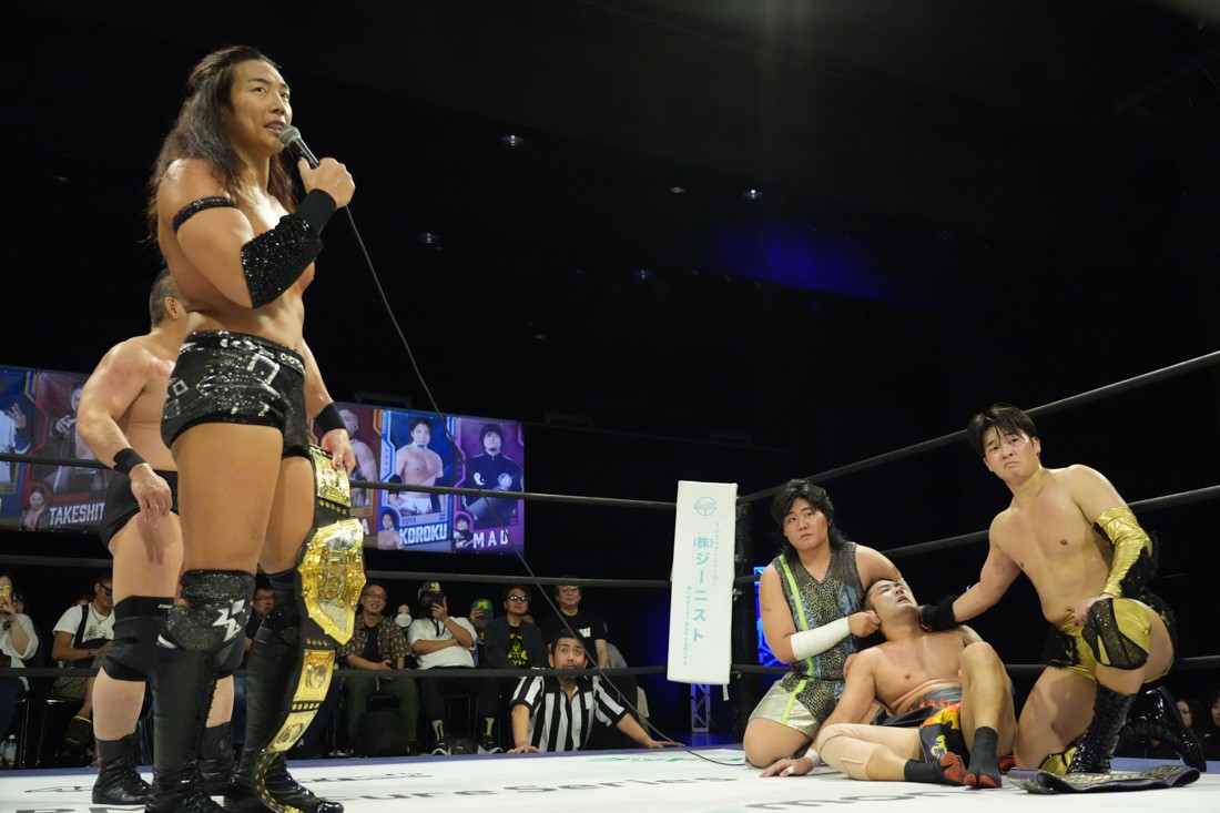 玉砕した石田だったが、TAKESHITAはTo-yと大地に石田の耳を塞ぐように指示すると、「石田は褒めると調子に乗るから」と前置きしてから「ホンマに頑張っていると思います。IWGP世界ヘビー級王者から見てもセンスがあると思いますよ! 熊本の皆さん、もっともっと彼に注目して期待してください! 彼はそれに応えるだけのチカラがあります! 皆さんの応援が大きければ大きいほど彼は強くなります! 今日、試合をしてそれを感じました。石田、強くなれよ。待ってるぞ」と高評価。