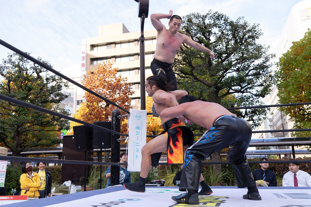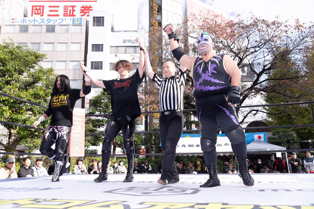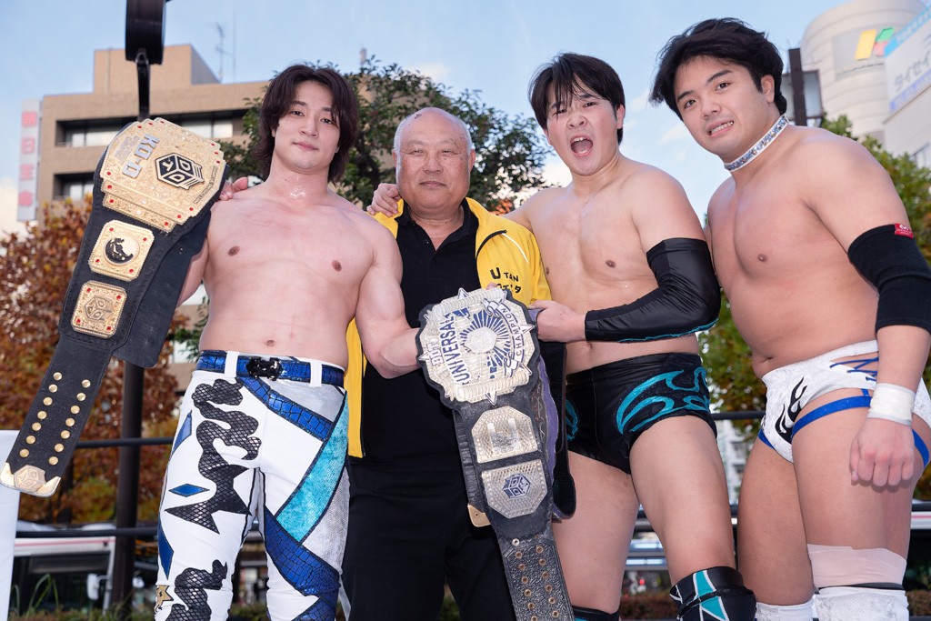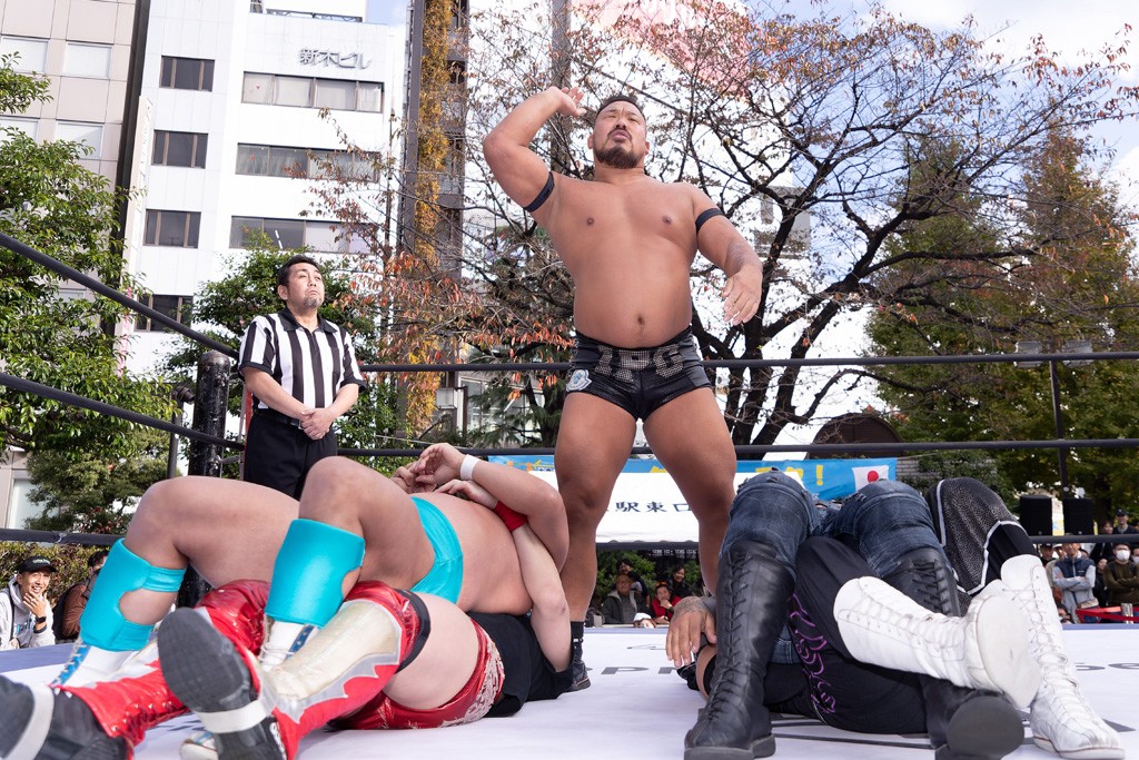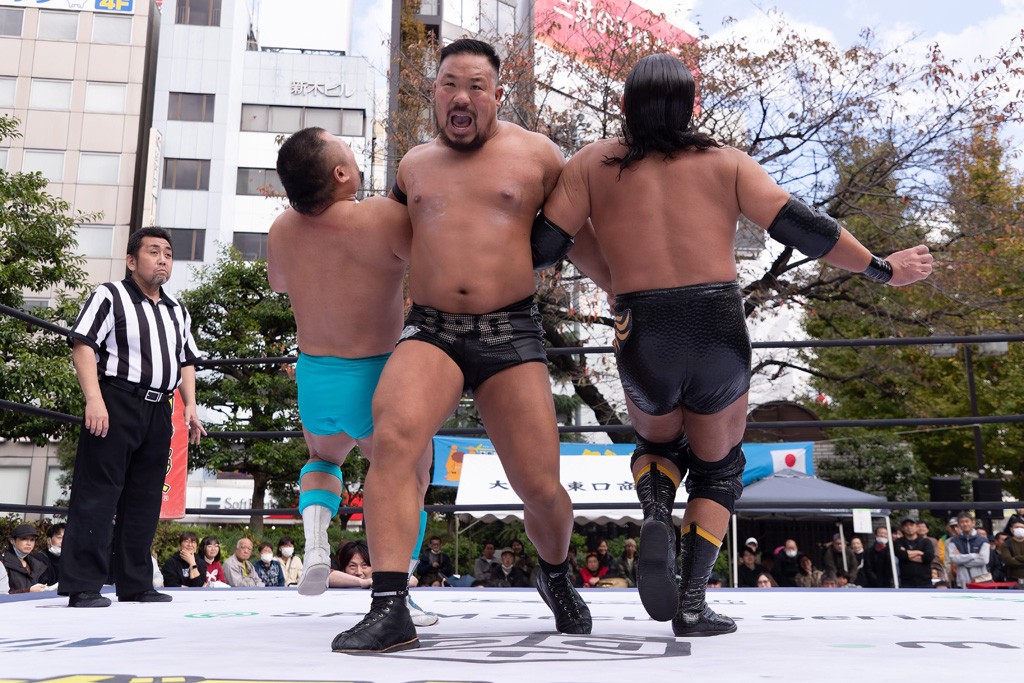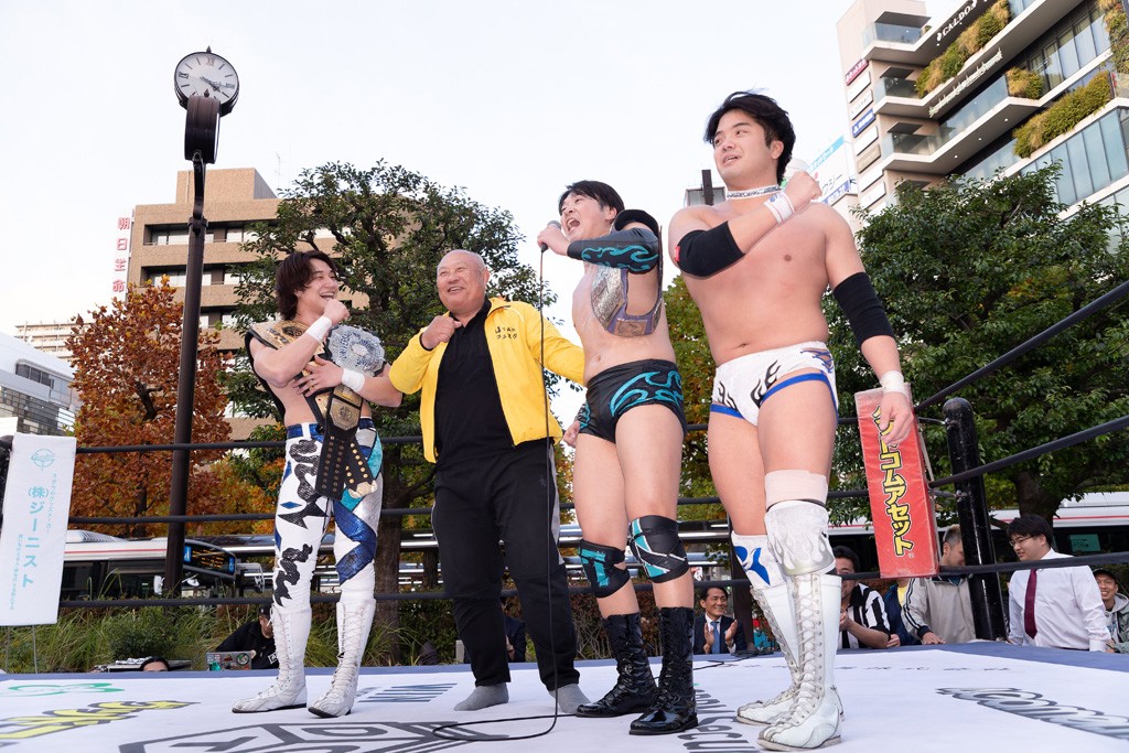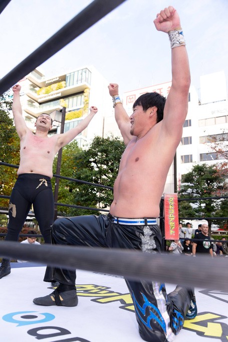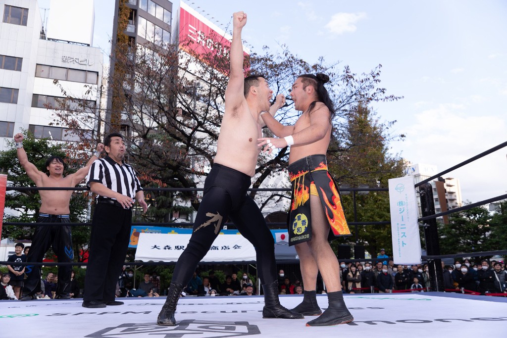 「力いっぱい来年も大森でUTANフェスタやるぞー! 熱波WER!!」(To-y)メインイベントを勝利で収めた上野&To-y&高鹿が白鳥商店会会長と共に熱波WER!!で大会を締める!