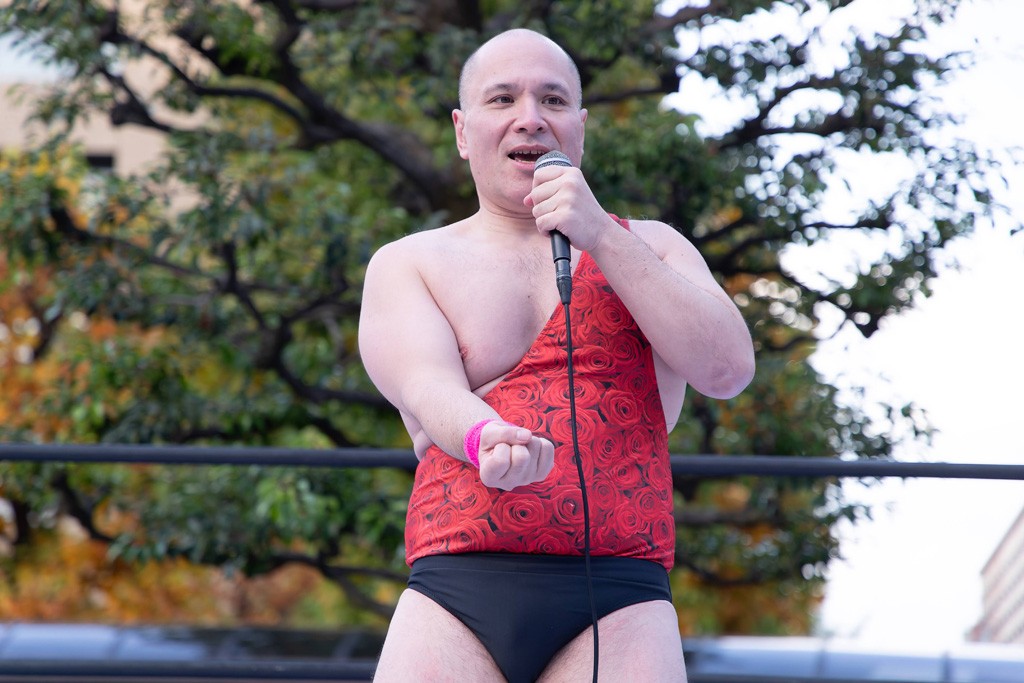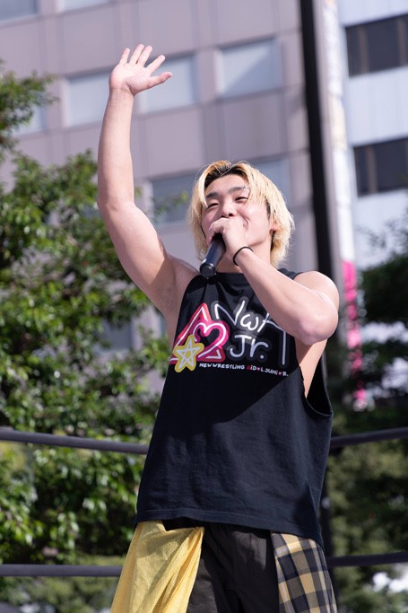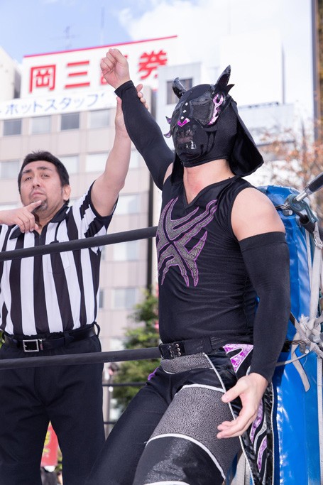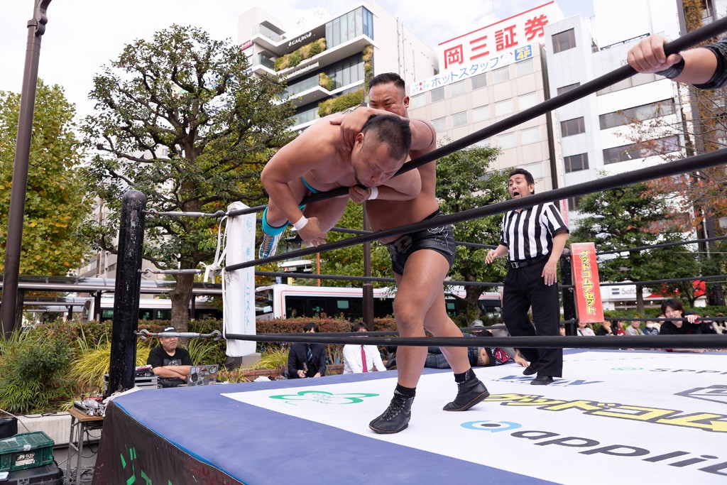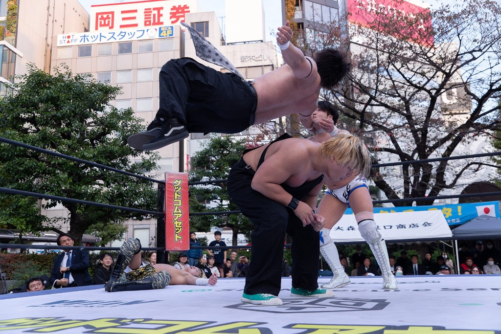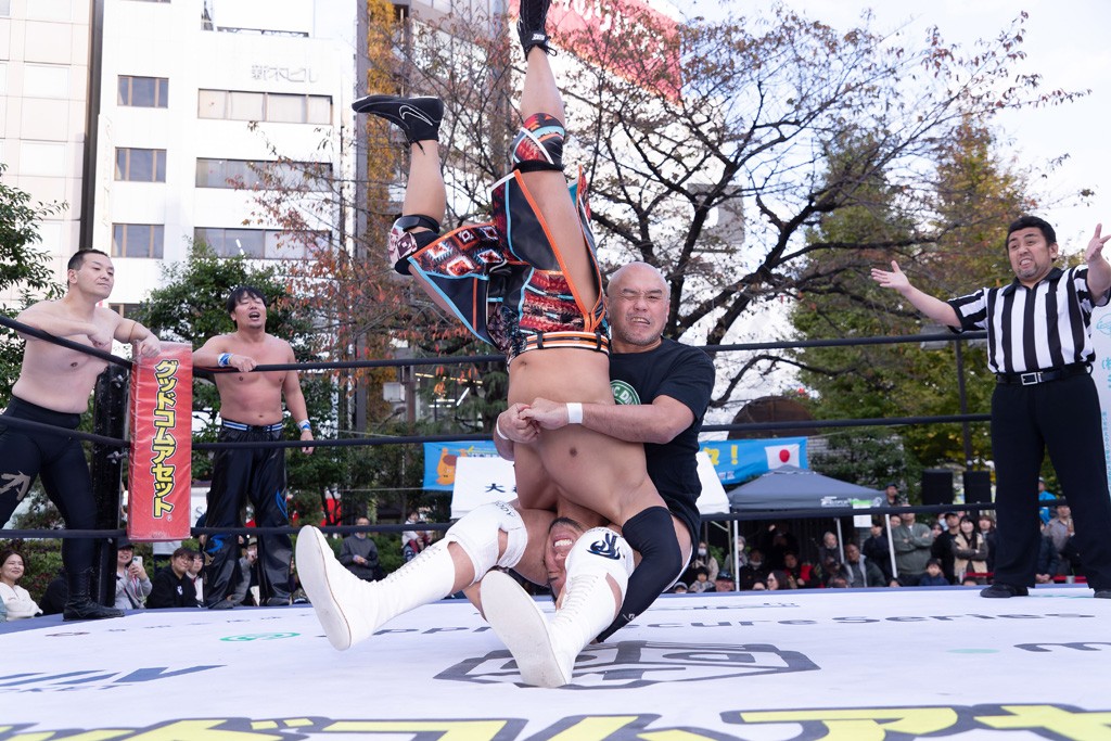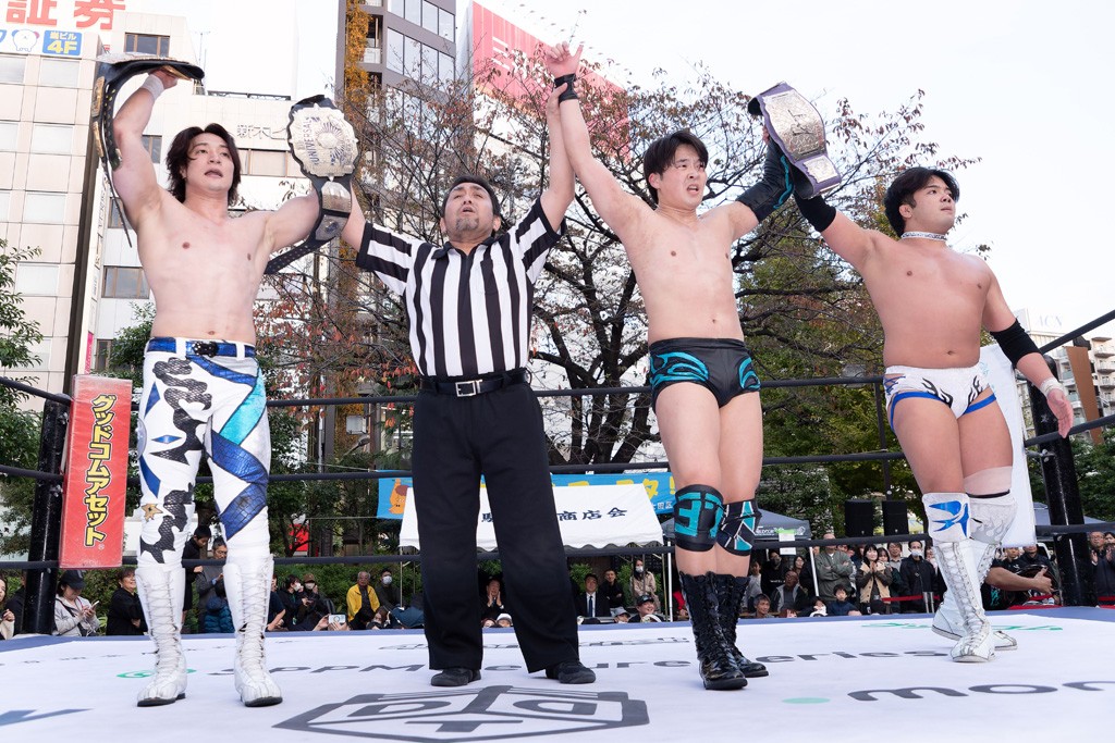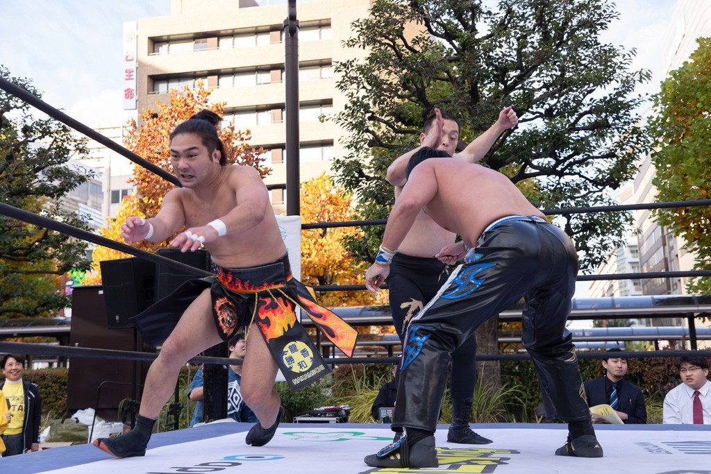 「力いっぱい来年も大森でUTANフェスタやるぞー! 熱波WER!!」(To-y)メインイベントを勝利で収めた上野&To-y&高鹿が白鳥商店会会長と共に熱波WER!!で大会を締める!