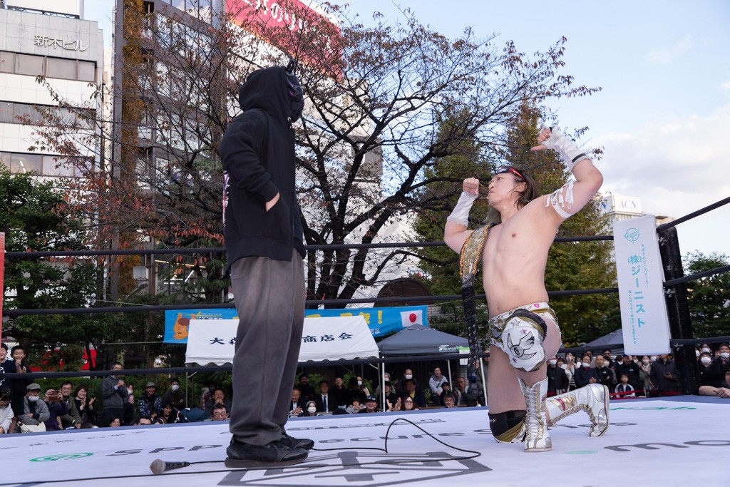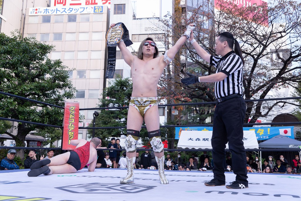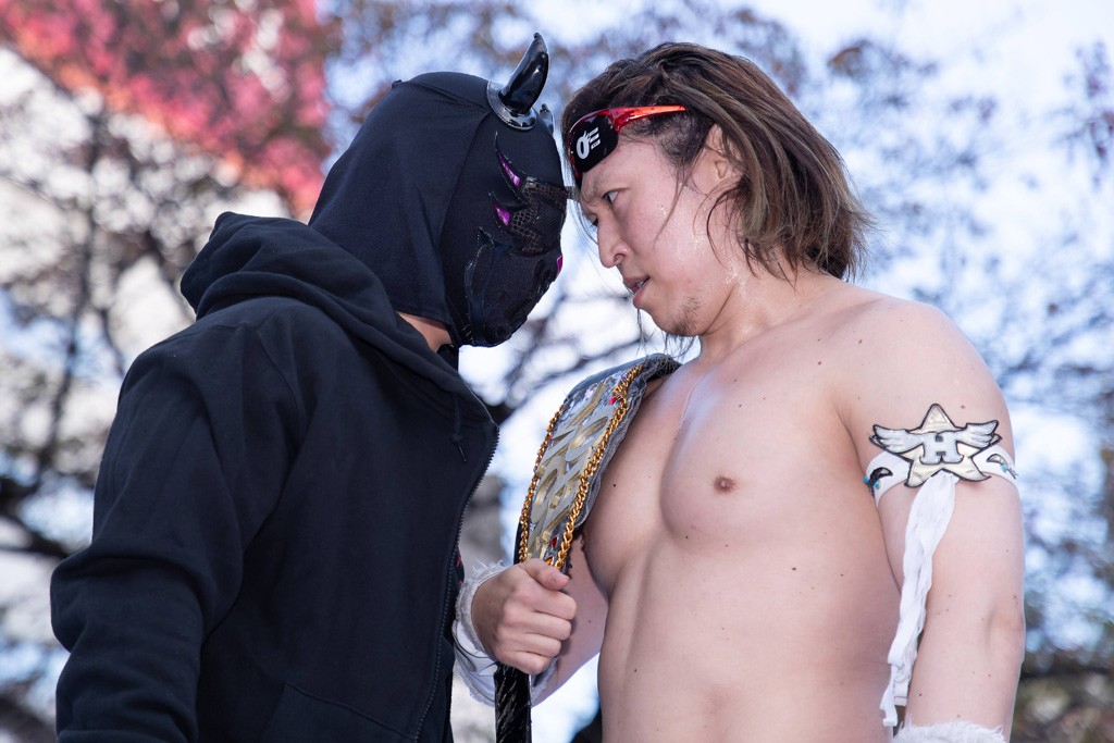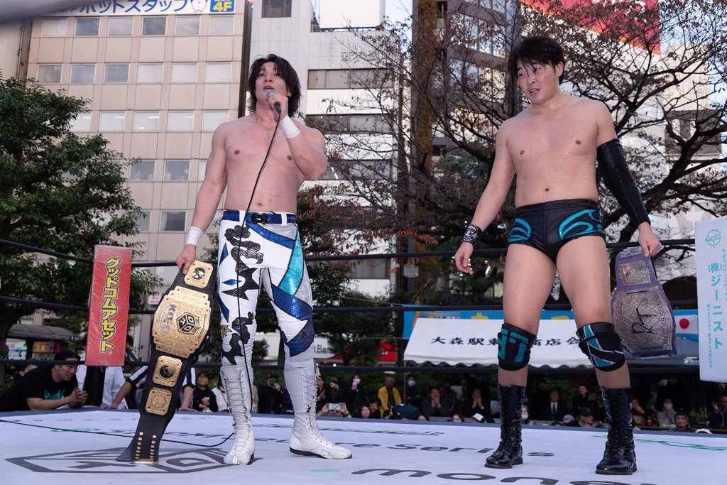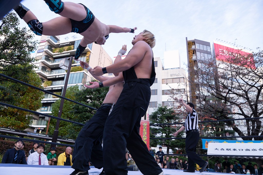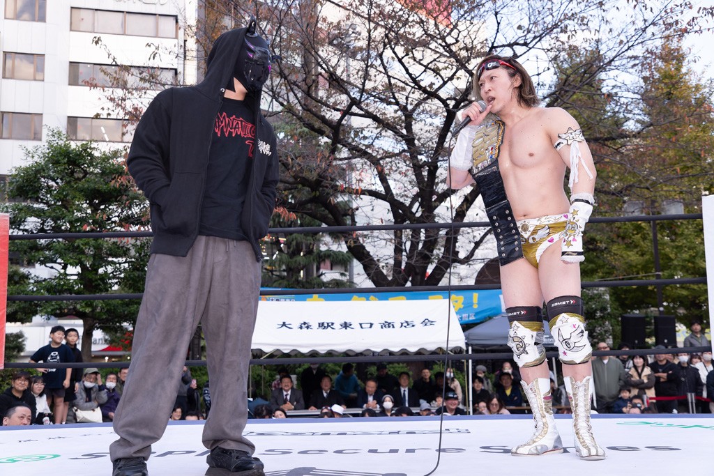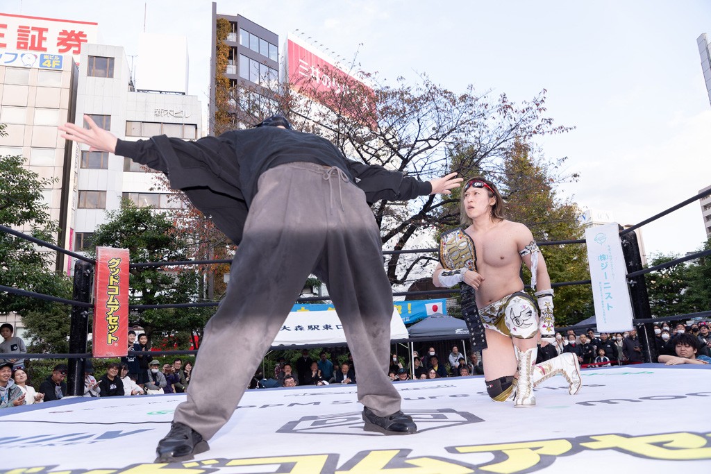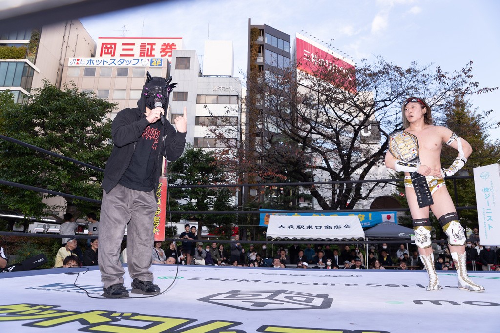 「来年このベルト獲ったら、俺が世界”赤羽級”王座を設立し、フォーエバーチャンプになるのだ……!」(イルシオン)「オマエ、マスク剥がして大森の住人にしてやろうか……!」(平田)来年の大森級選手権試合に向け平田とイルシオンが睨み合う!
