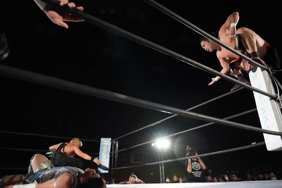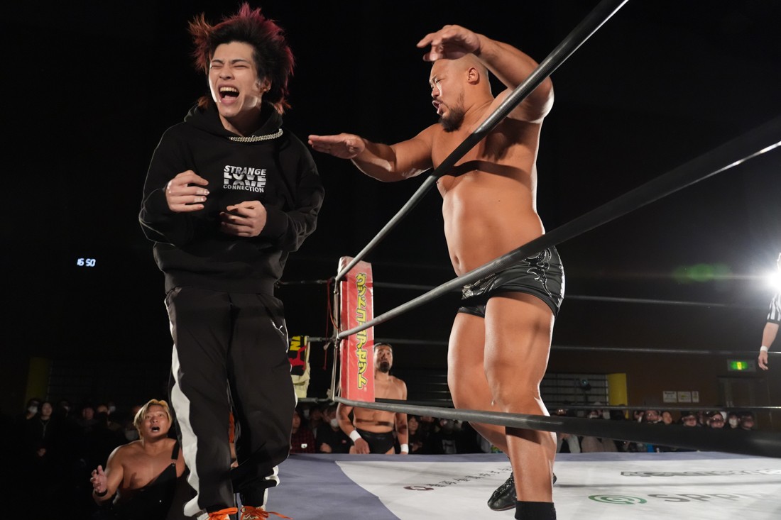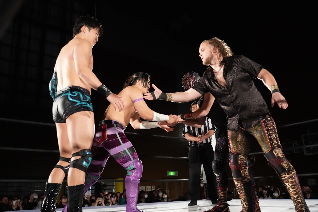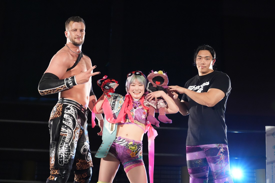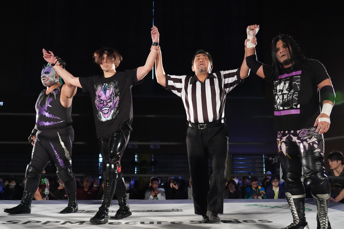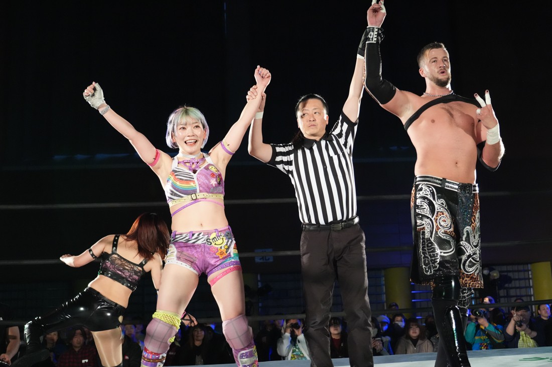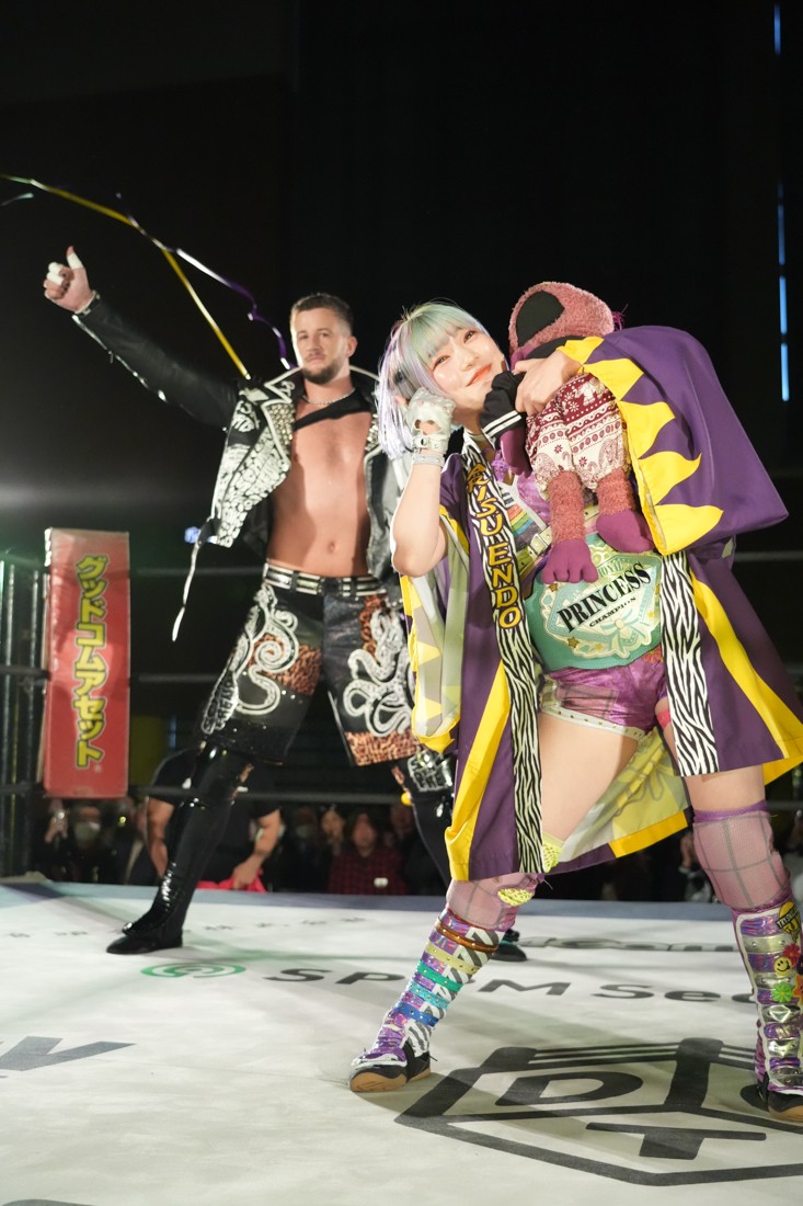 試合中にシャーデンタワーやゴムパッチンも経験した有栖は、クリスと正田からSCHADENFREUDE Internationalの限定メンバーに任命されたため「1、2、3、ヨーン!」で中締めしてみせた。