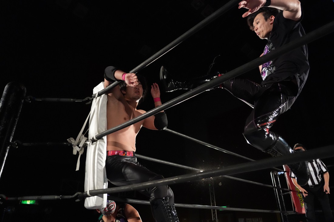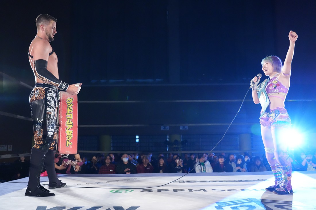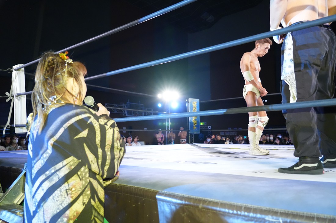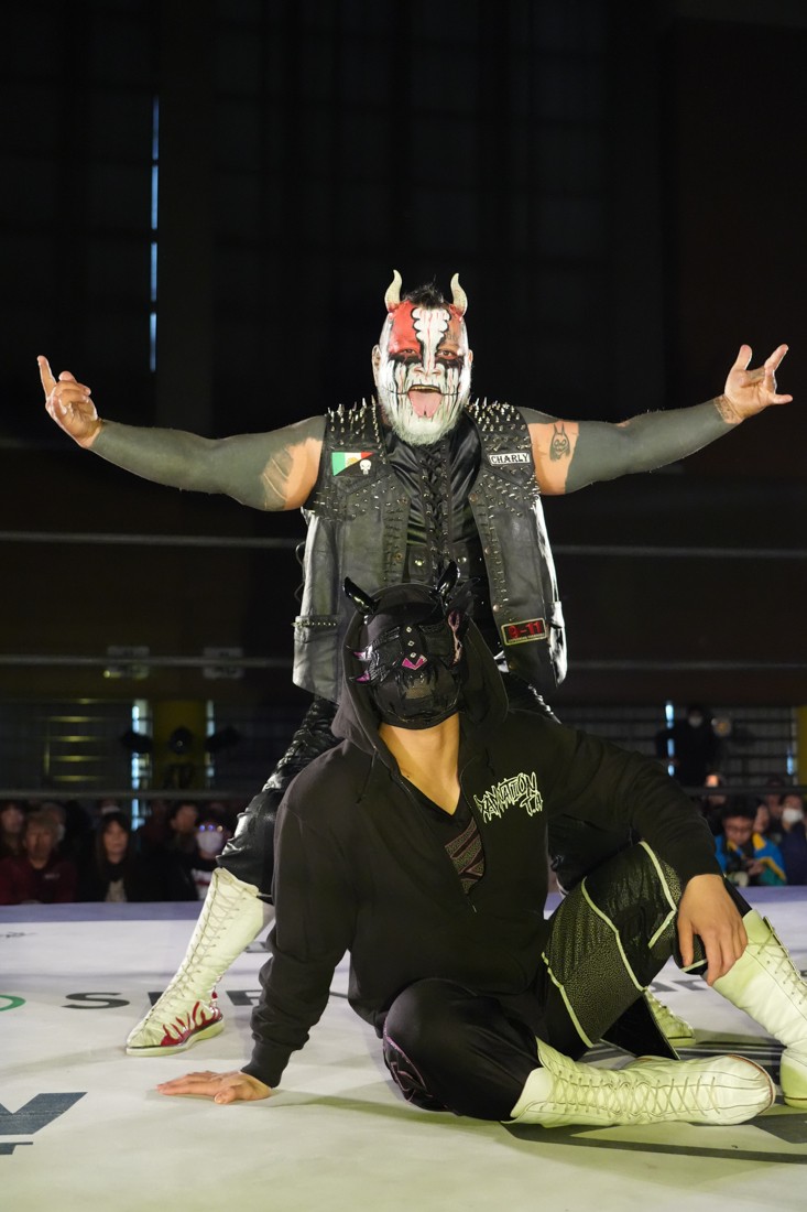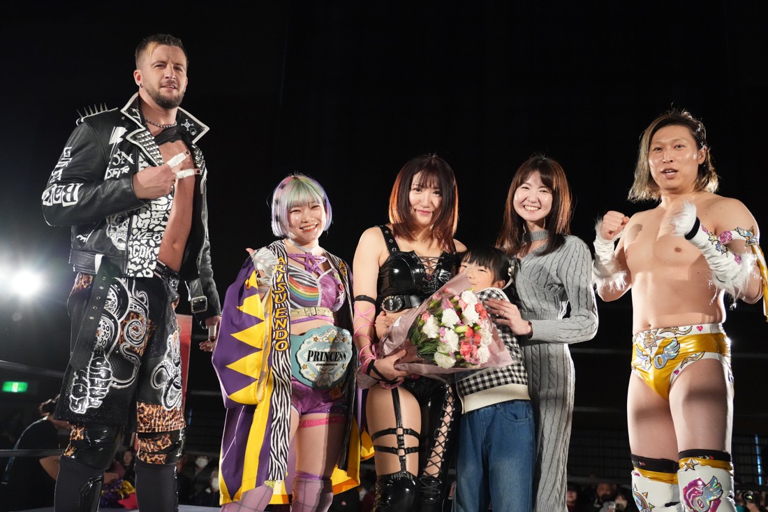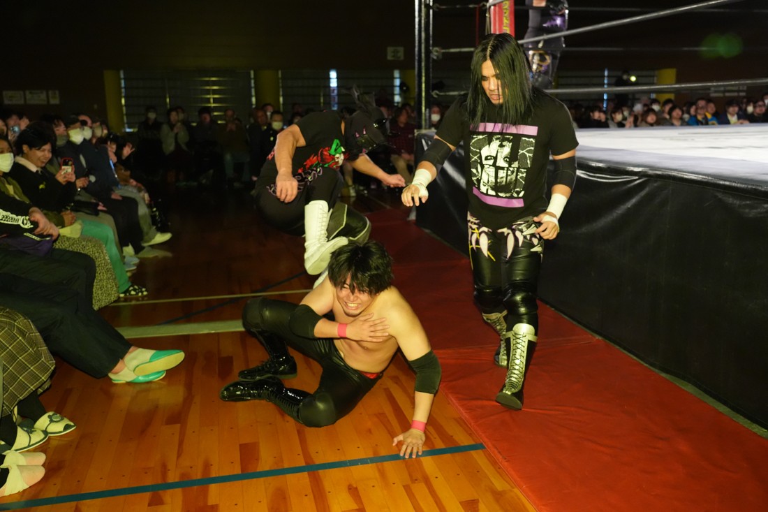 試合中にシャーデンタワーやゴムパッチンも経験した有栖は、クリスと正田からSCHADENFREUDE Internationalの限定メンバーに任命されたため「1、2、3、ヨーン!」で中締めしてみせた。