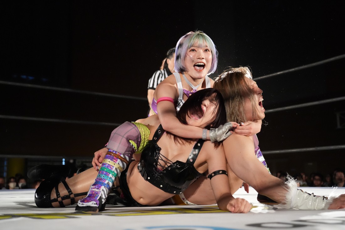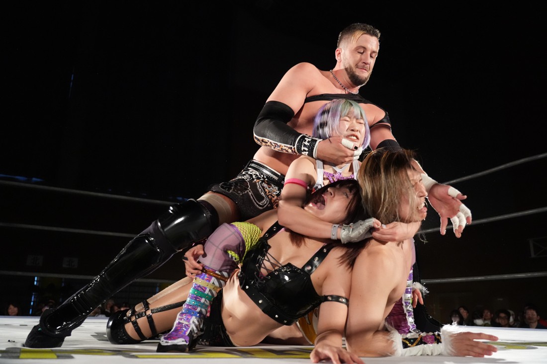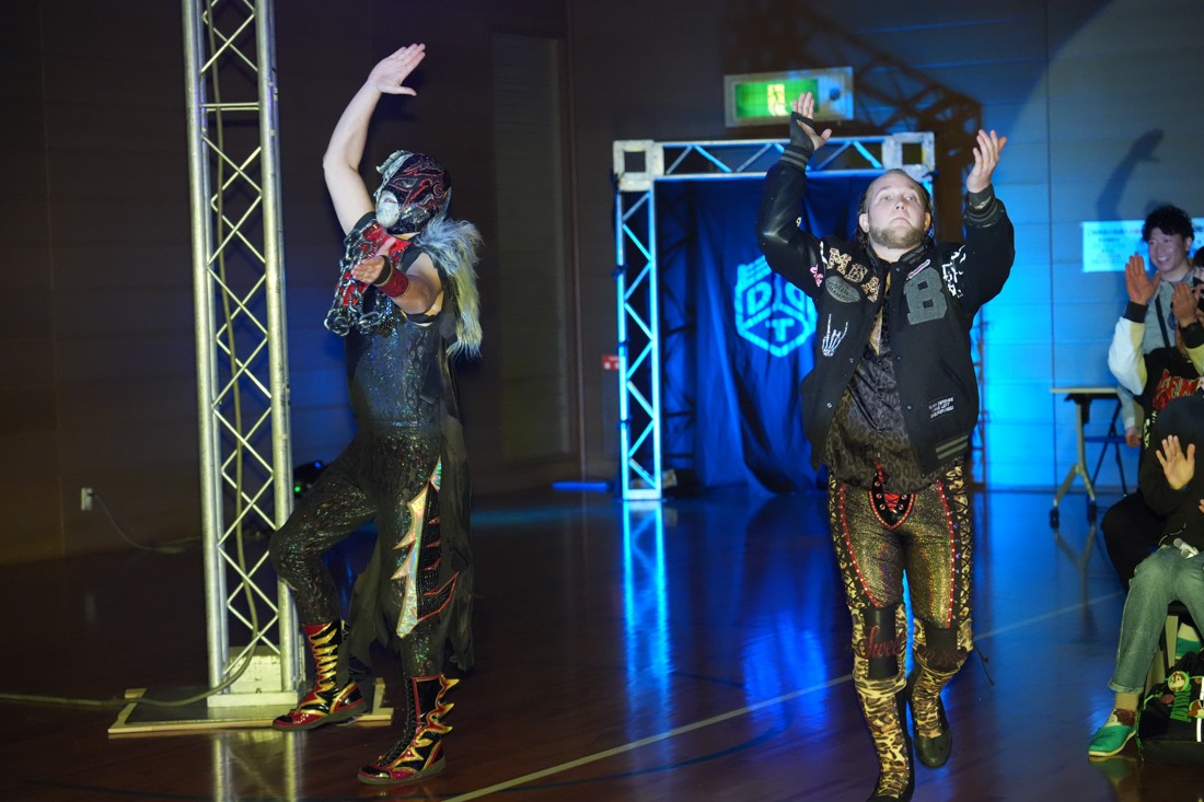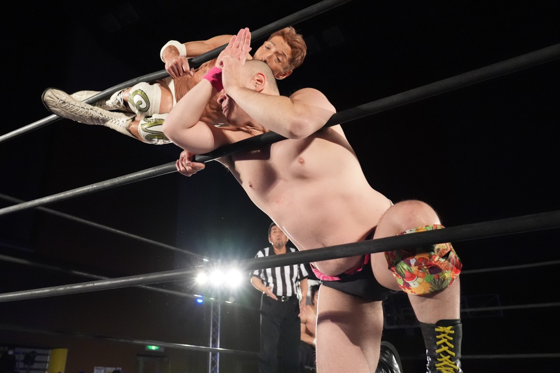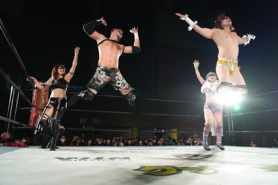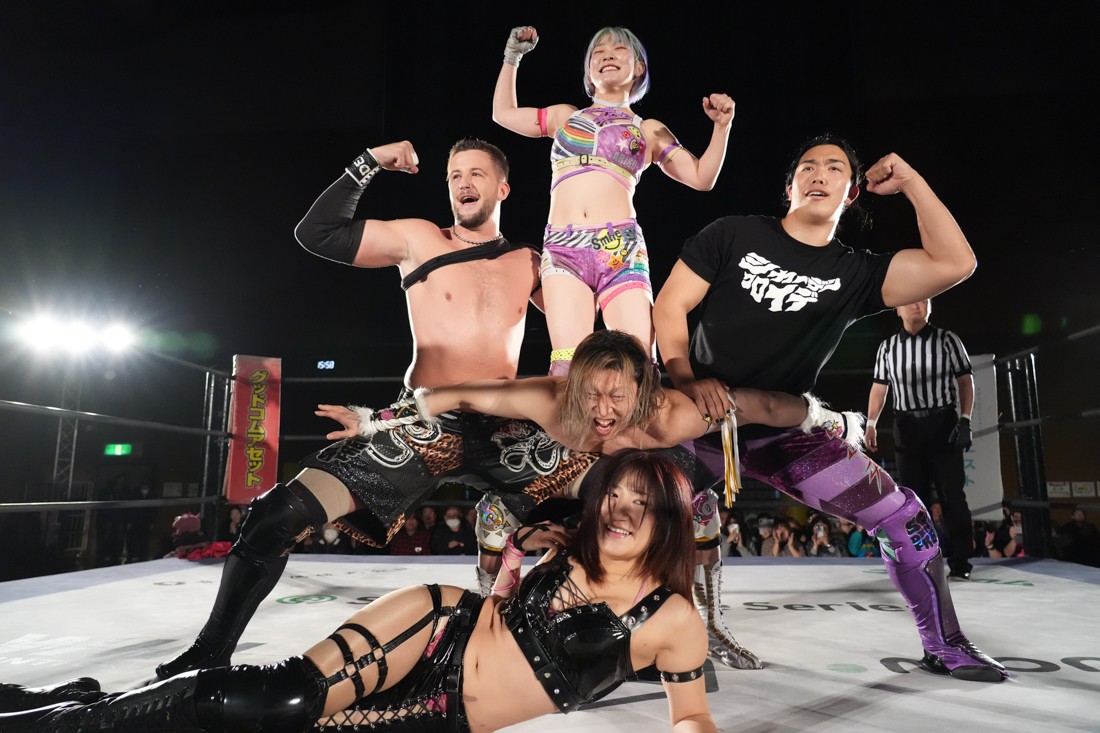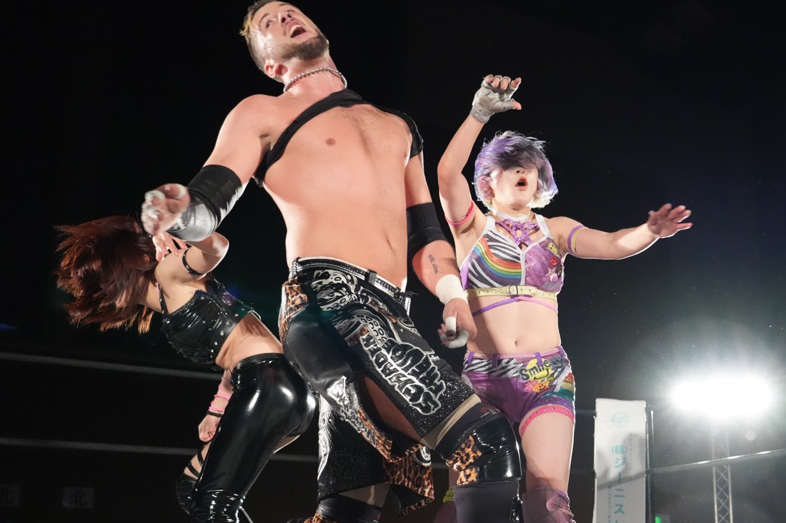 試合中にシャーデンタワーやゴムパッチンも経験した有栖は、クリスと正田からSCHADENFREUDE Internationalの限定メンバーに任命されたため「1、2、3、ヨーン!」で中締めしてみせた。