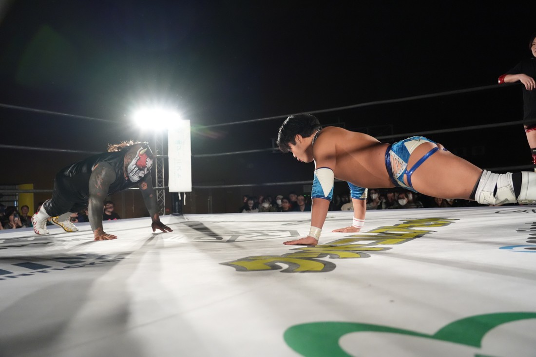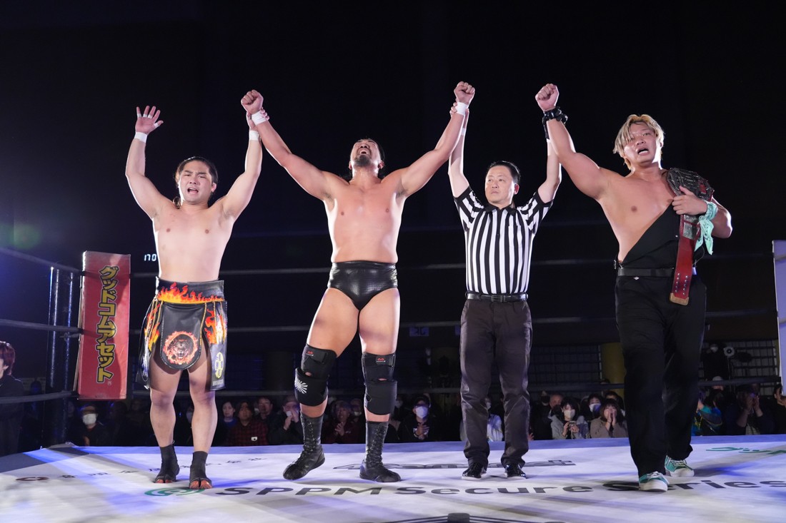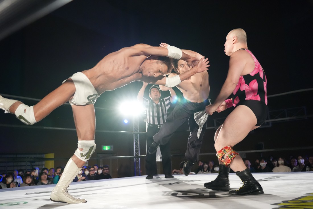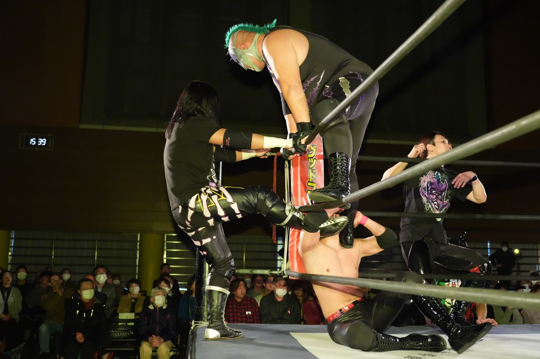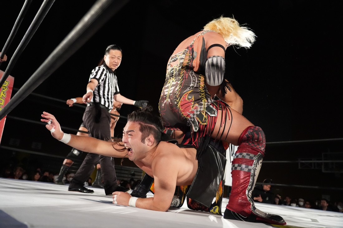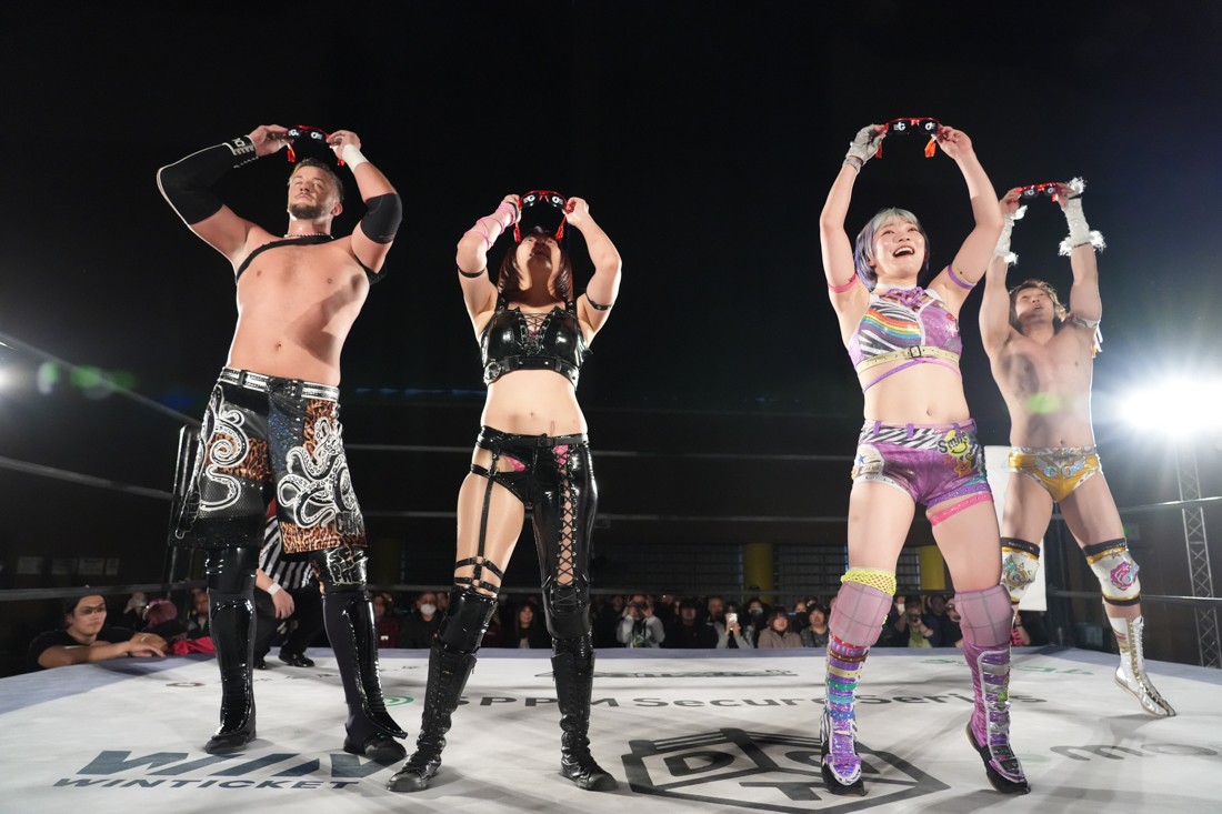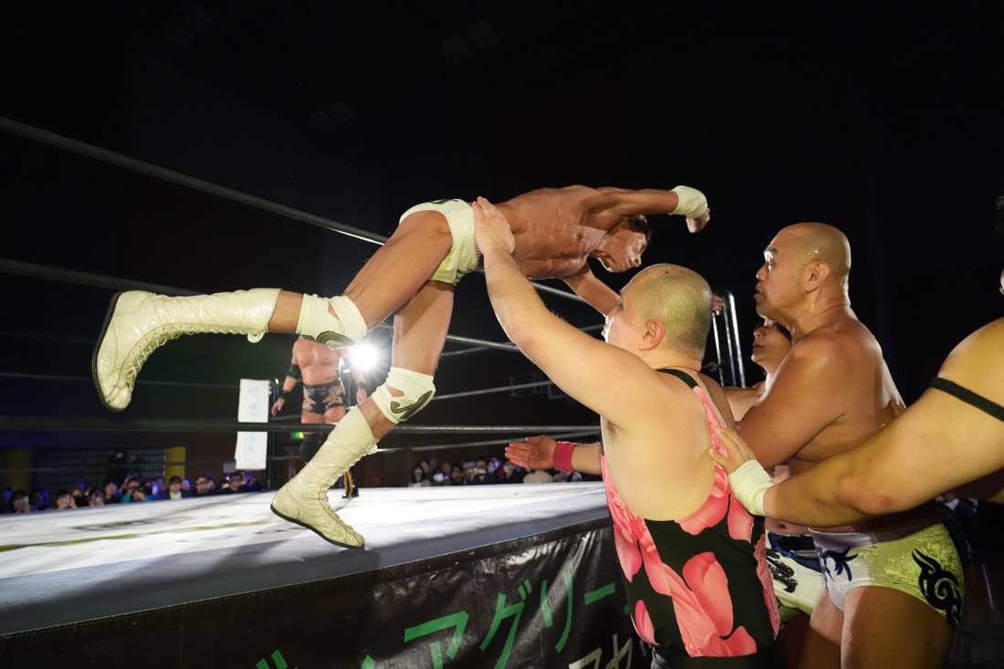 試合中にシャーデンタワーやゴムパッチンも経験した有栖は、クリスと正田からSCHADENFREUDE Internationalの限定メンバーに任命されたため「1、2、3、ヨーン!」で中締めしてみせた。
