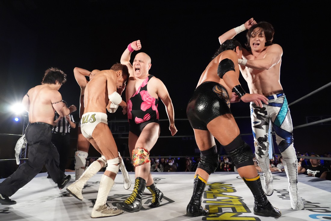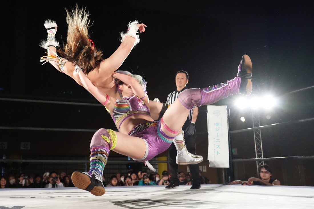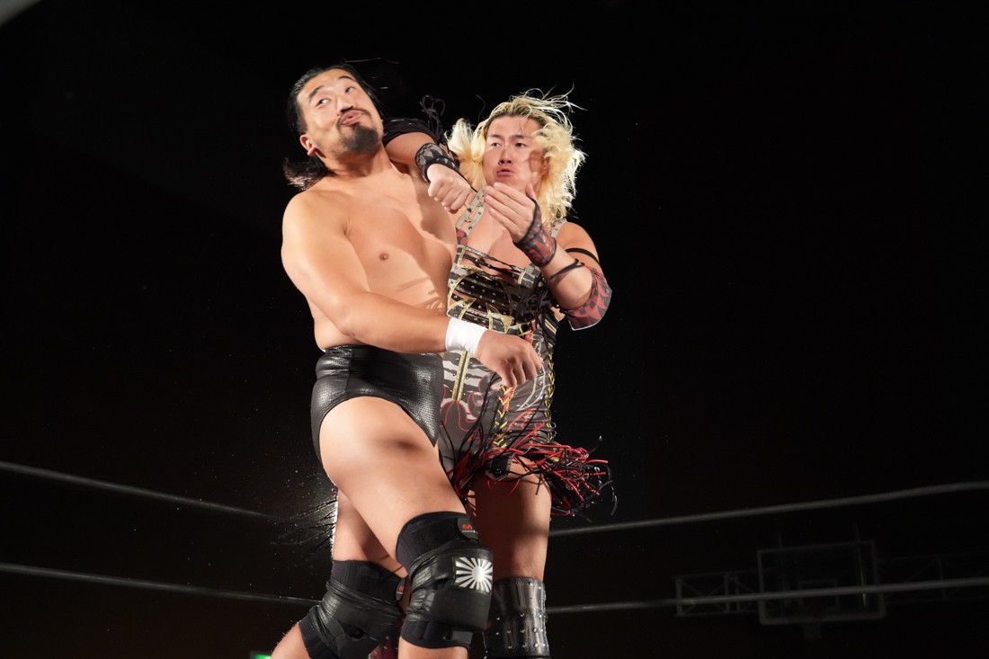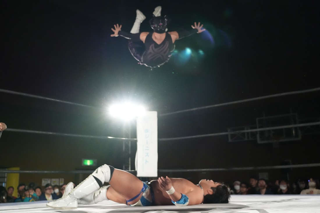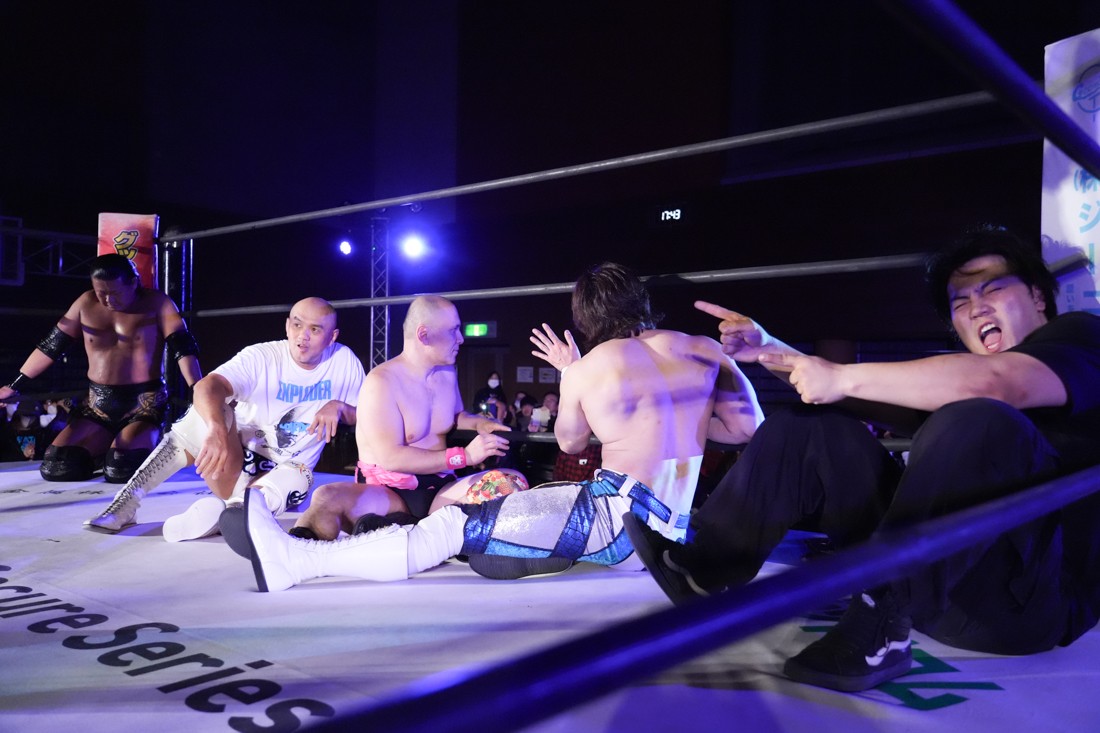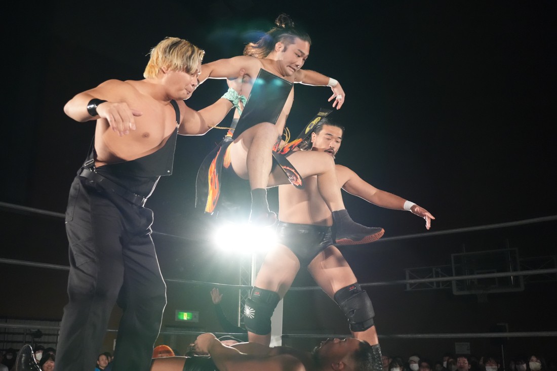 試合中にシャーデンタワーやゴムパッチンも経験した有栖は、クリスと正田からSCHADENFREUDE Internationalの限定メンバーに任命されたため「1、2、3、ヨーン!」で中締めしてみせた。