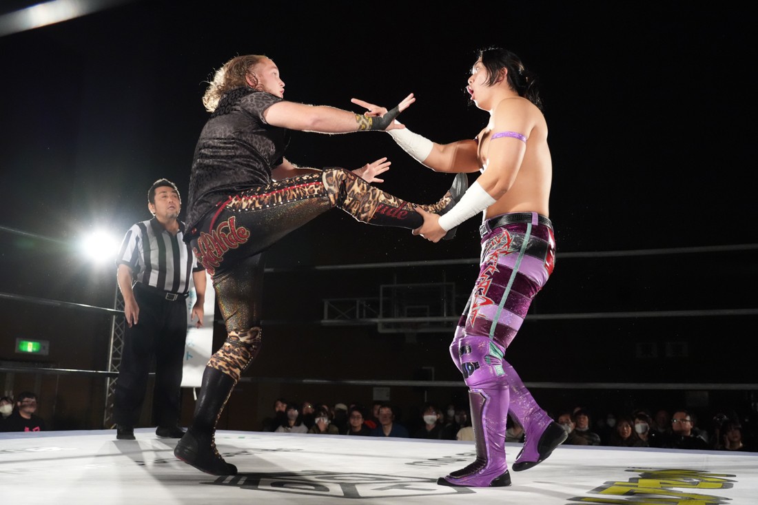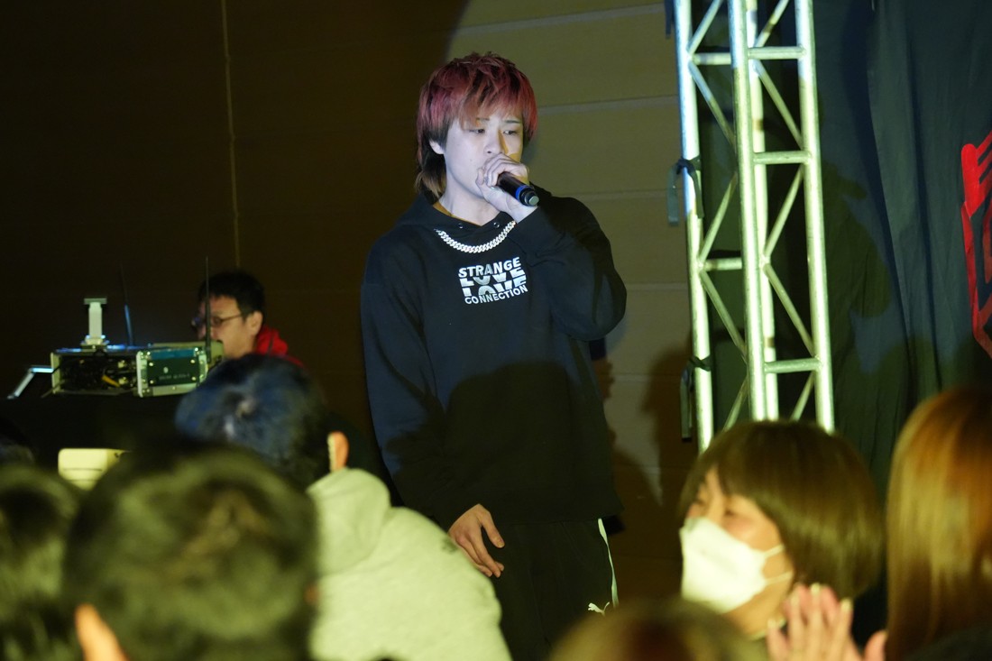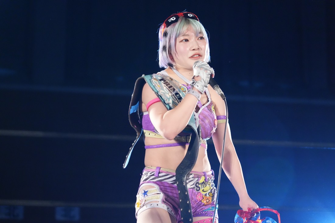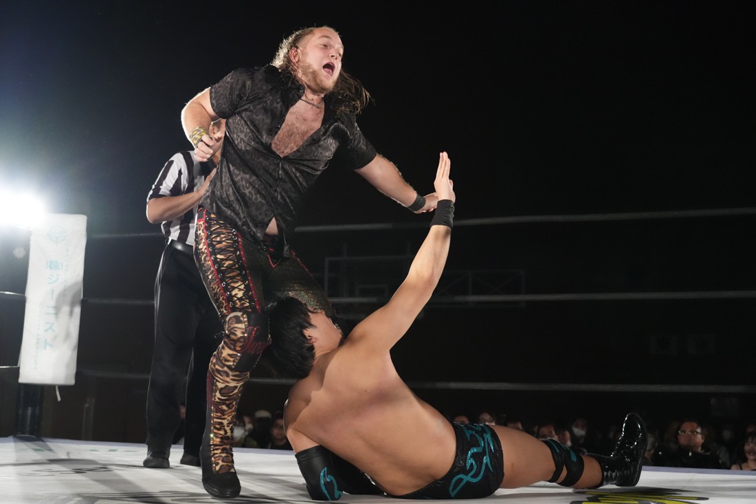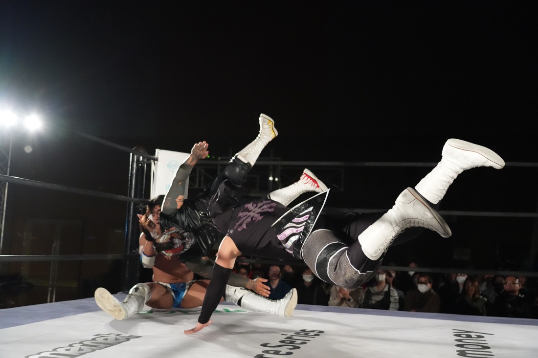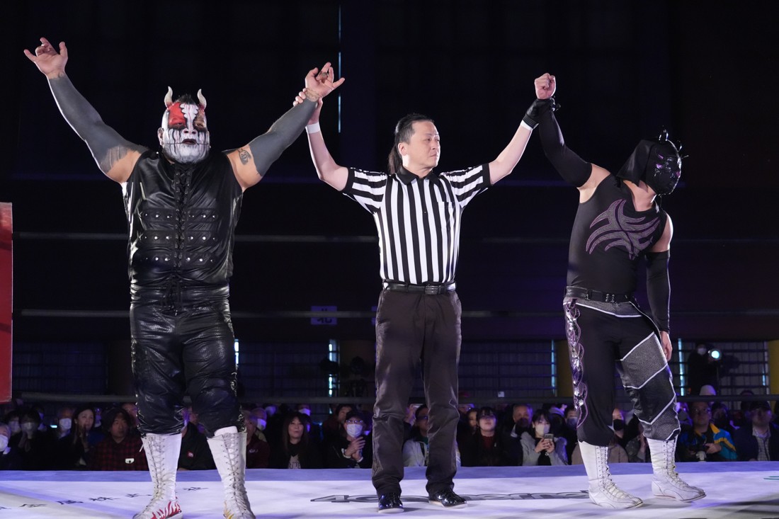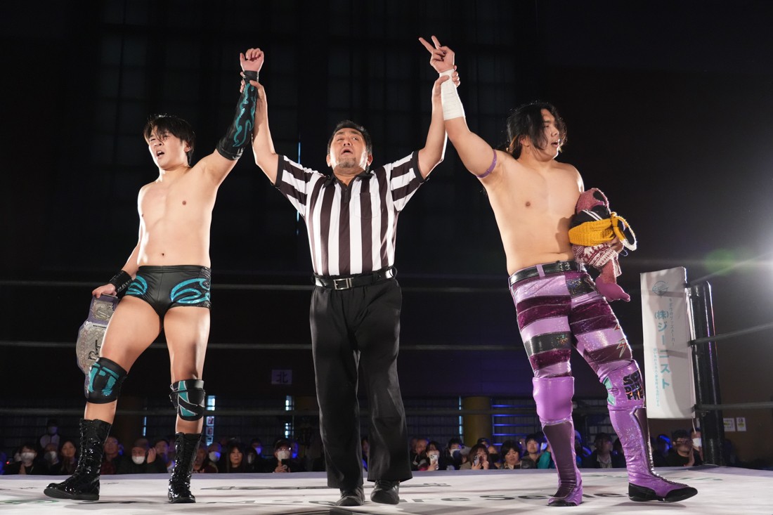 試合中にシャーデンタワーやゴムパッチンも経験した有栖は、クリスと正田からSCHADENFREUDE Internationalの限定メンバーに任命されたため「1、2、3、ヨーン!」で中締めしてみせた。
