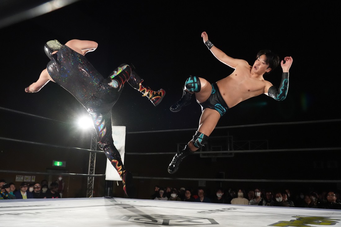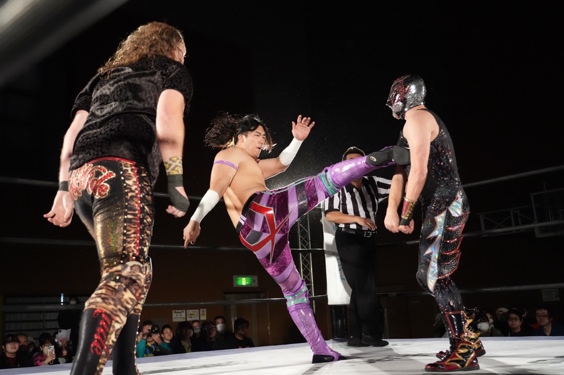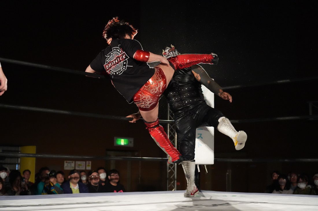 有栖はクリス・ブルックスと、春日は平田一喜と組んで対戦。試合前には春日に姉とその娘さんから花束が贈呈された。試合はクリスの肩に乗って超高層ミサイルキックを出そうとするが、高さにビビってクリスが中腰になった状態からミサイルキックをようやく放った有栖が平田を什の掟で沈めて勝利。