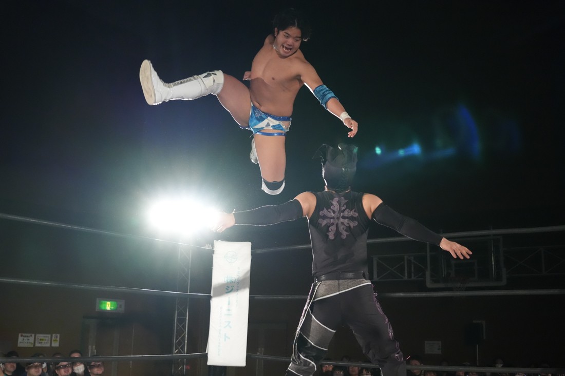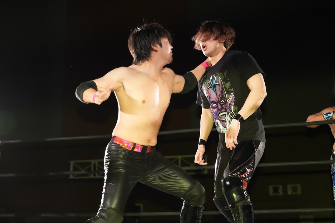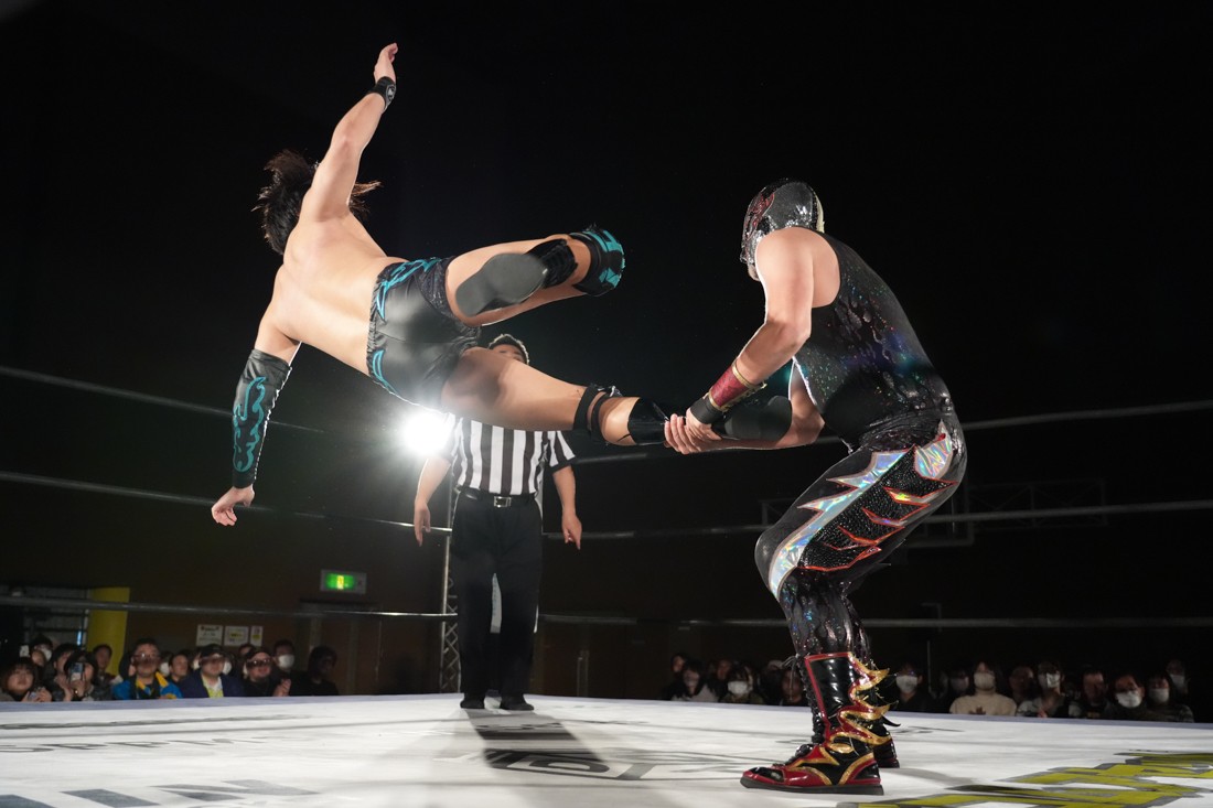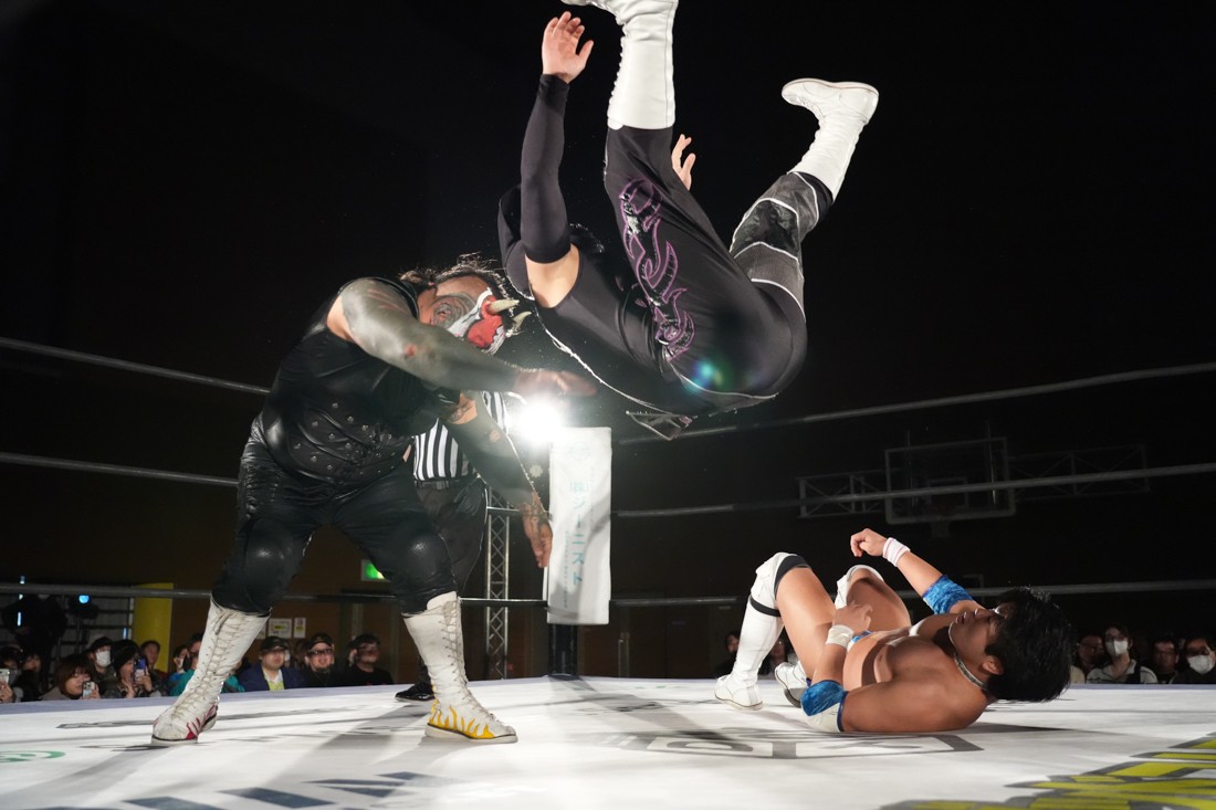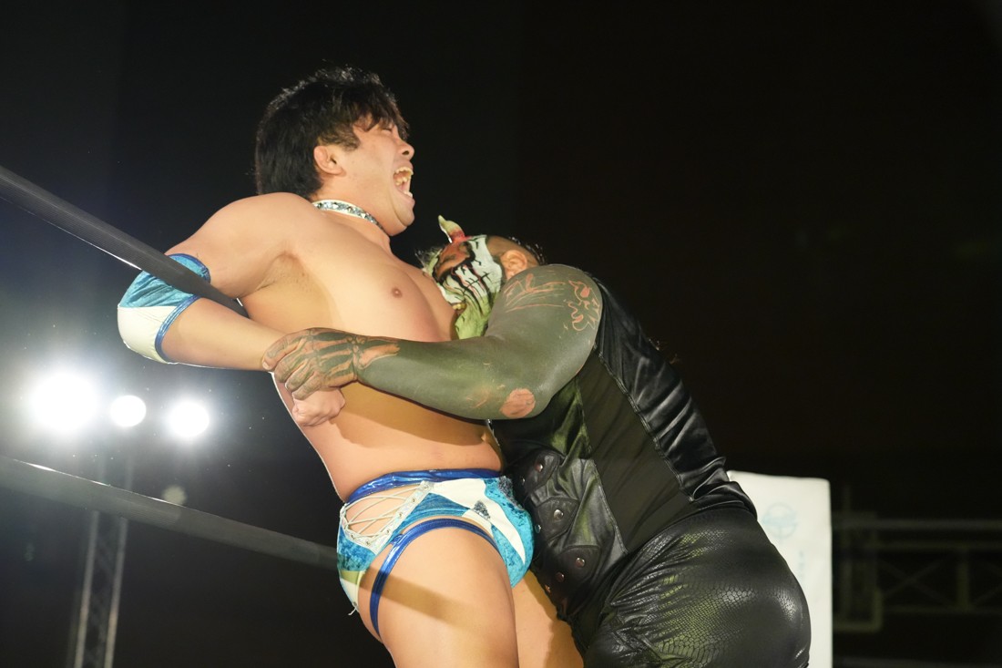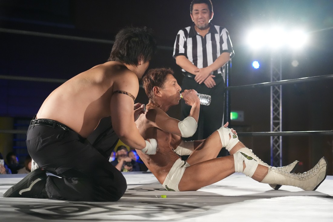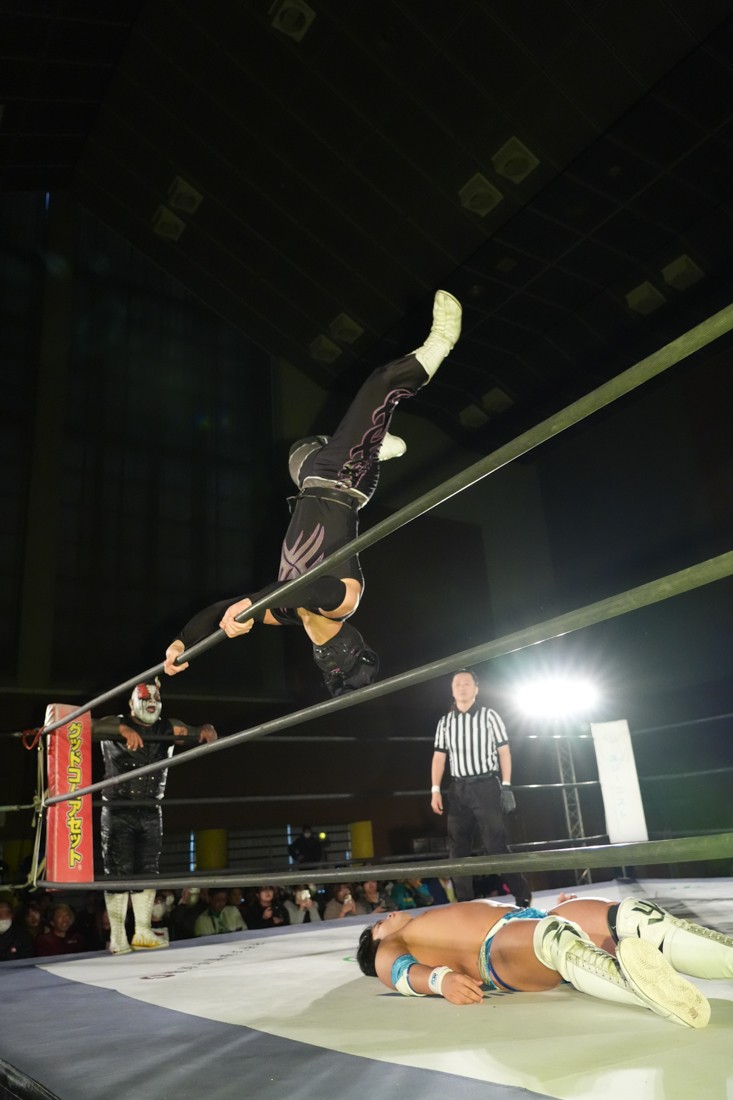 パートナーからの喝を入れられた松野は、再び秋山を指名して再試合へ。リストロックにも今度は耐えたが、試合中に足がつってしまい大ピンチ。しかしMAOが持っていた漢方を服用することで復活した松野は、エプロンから場外へのプランチャや619も決めると、最後は伝家の宝刀ゴージャス・スーパースターエルボーでアントンから勝利。