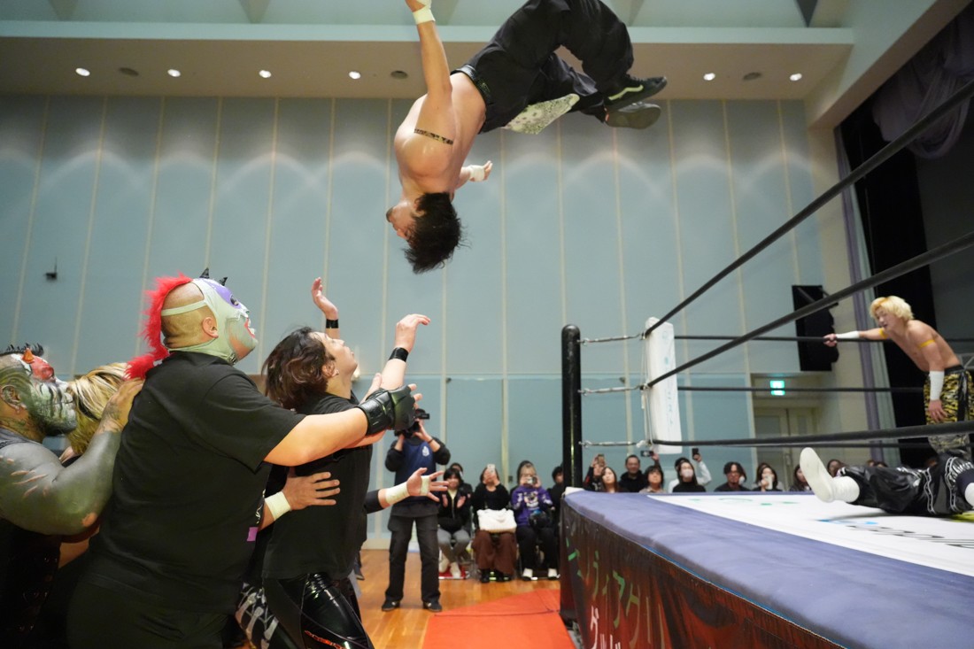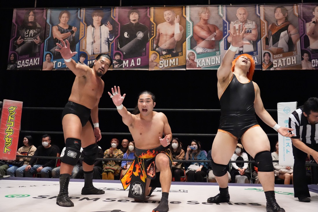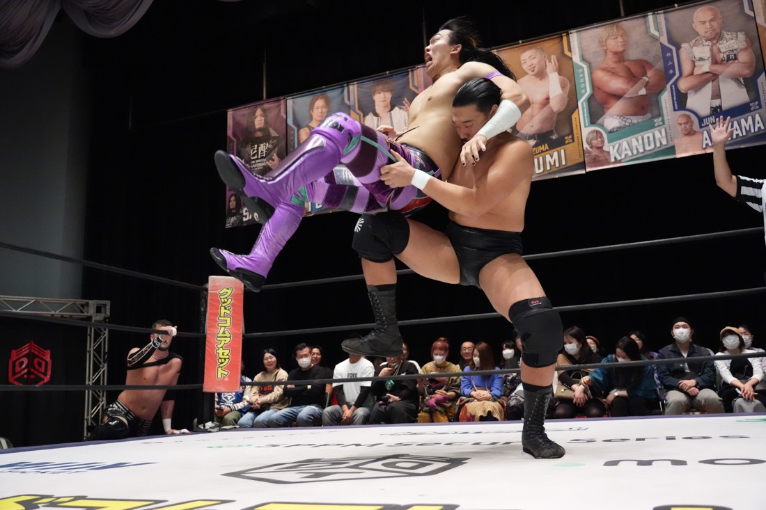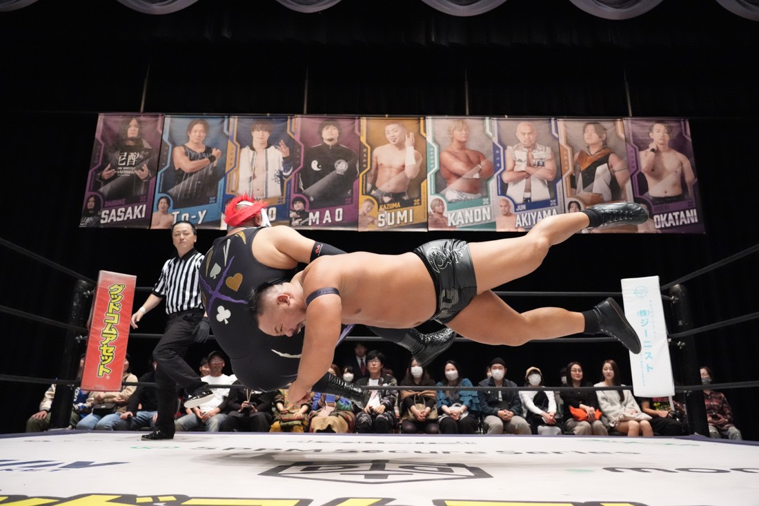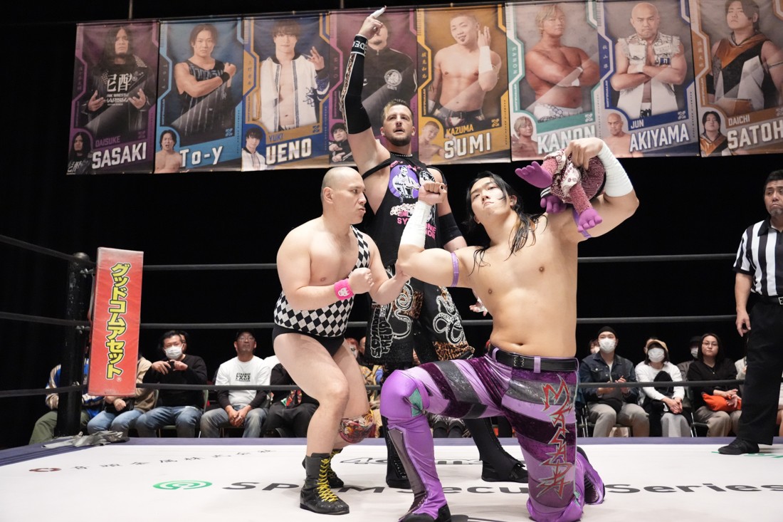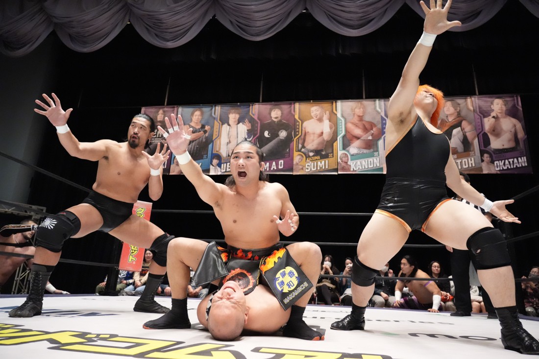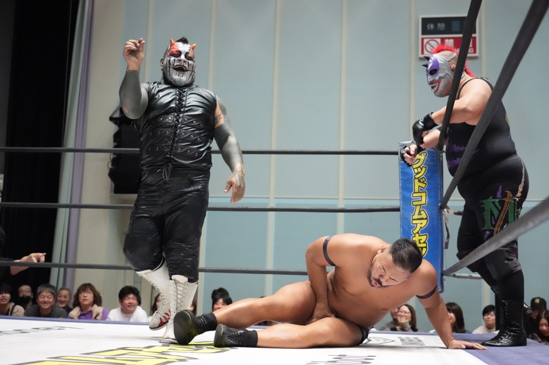 11月24日、三重・三重総合文化センター・多目的ホールで「須見和馬地元凱旋!三重のために須見が翔ぶ!」が開催。メインイベントでは地元凱旋となった須見和馬がSTRANGE LOVE CONNECTIONのMAO&KANON with KIMIHIROと組んで、佐々木大輔&岡谷英樹&イルシオンのDAMNATION T.Aと対戦。