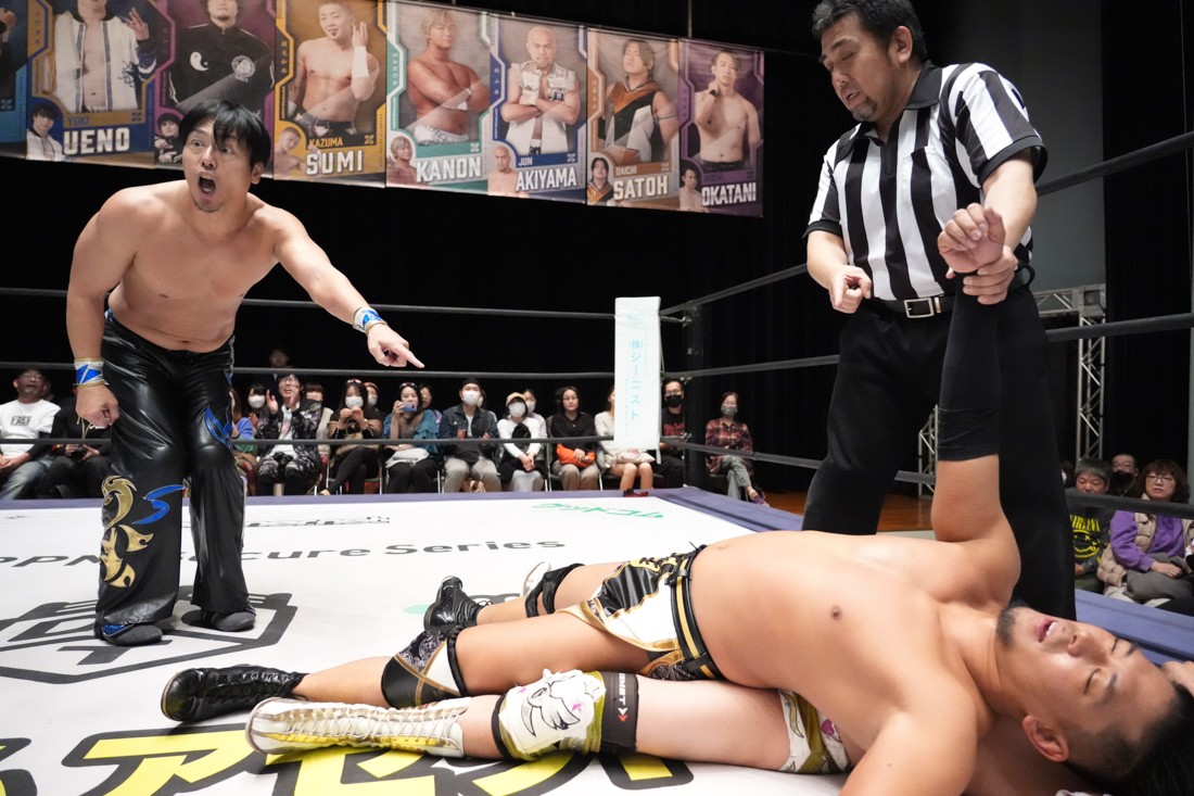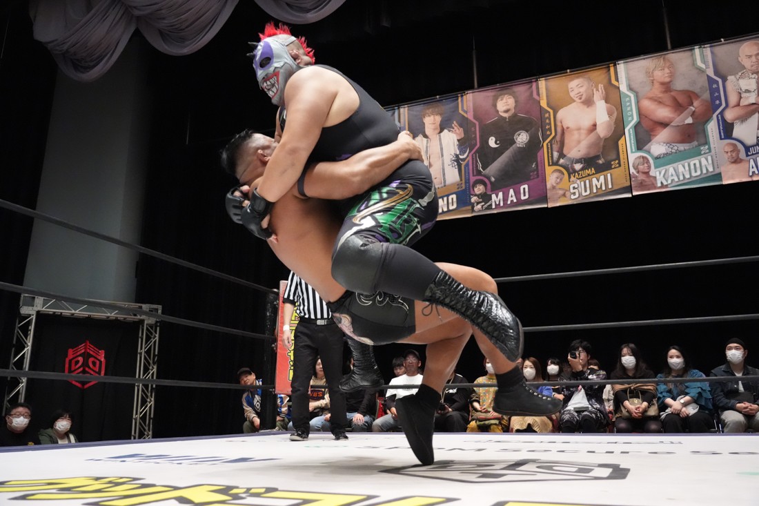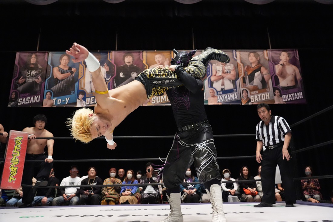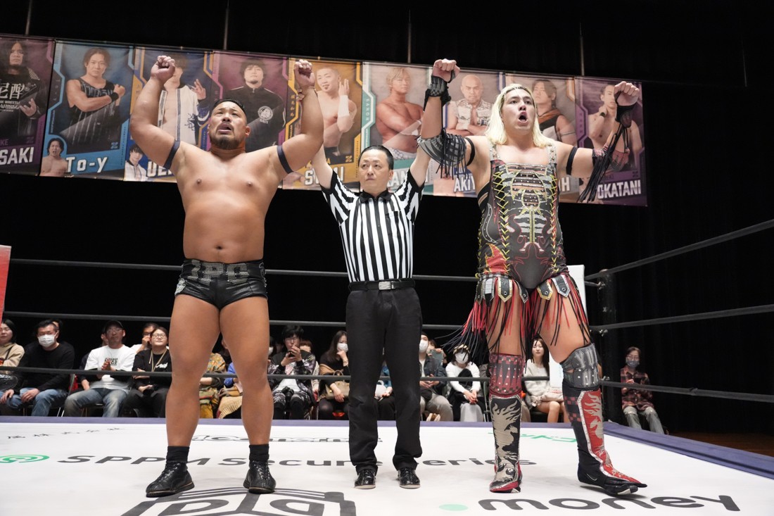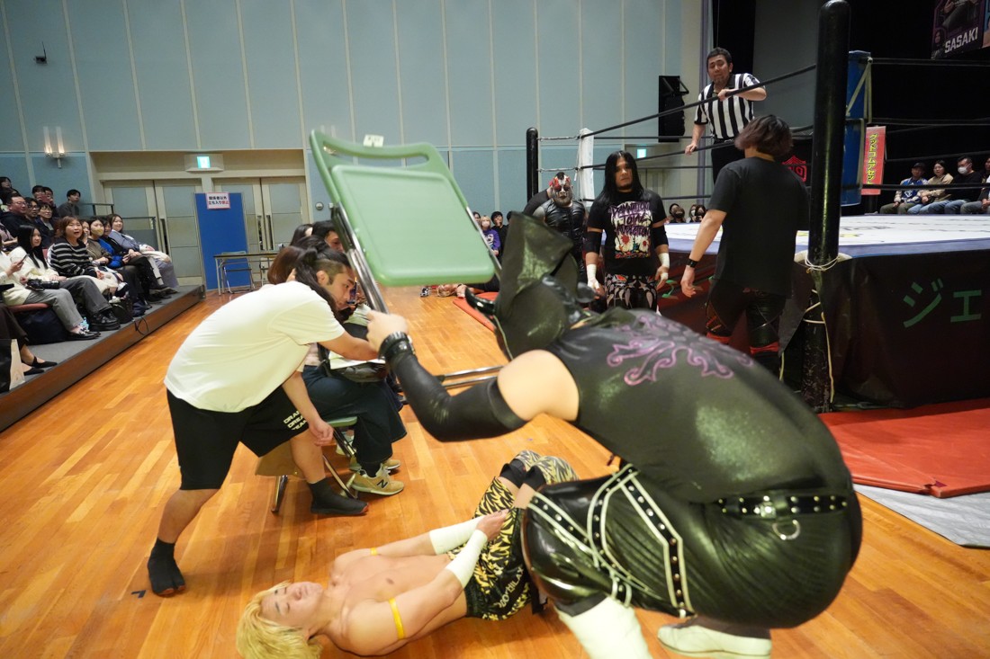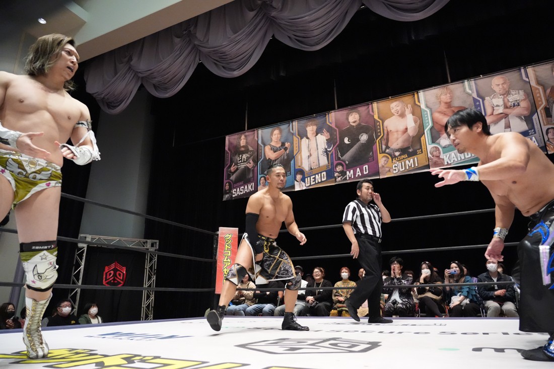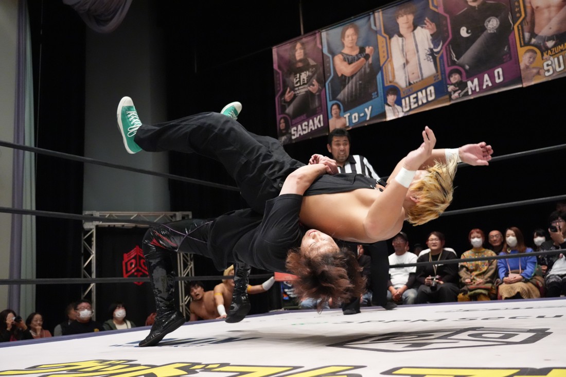 11月24日、三重・三重総合文化センター・多目的ホールで「須見和馬地元凱旋!三重のために須見が翔ぶ!」が開催。メインイベントでは地元凱旋となった須見和馬がSTRANGE LOVE CONNECTIONのMAO&KANON with KIMIHIROと組んで、佐々木大輔&岡谷英樹&イルシオンのDAMNATION T.Aと対戦。
