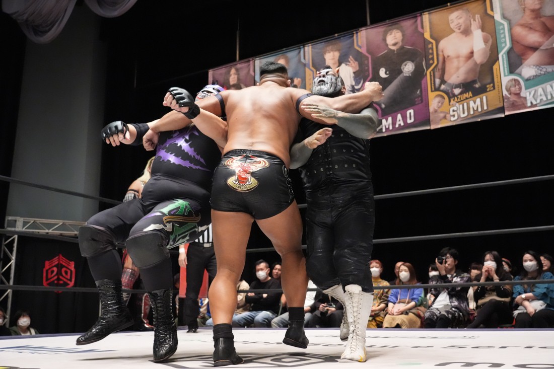 勝利目前と思われた矢先、レフェリーを場外に引きずり出したDAMNATION T.Aは、セコンドのMJポーとデムースも乱入。須見に集中砲火を浴びせて形勢逆転。しかしデムースの巨体もティヘラで場外に投げだした須見はトペ・スイシーダ。MAOとKANONが徹底的に佐々木と岡谷を場外に追いやることで、イルシオンと一騎打ち状態になった須見は、スワントーンボムをかわして自爆させると、蹴りのコンビネーション、スク〜ルボ〜イ、メサイヤDDTで追い込むと、リバース450°スプラッシュをズバリと決めて勝利。