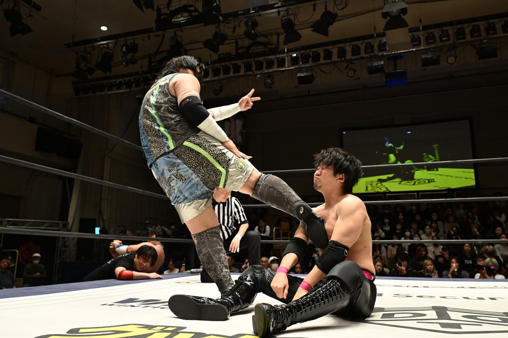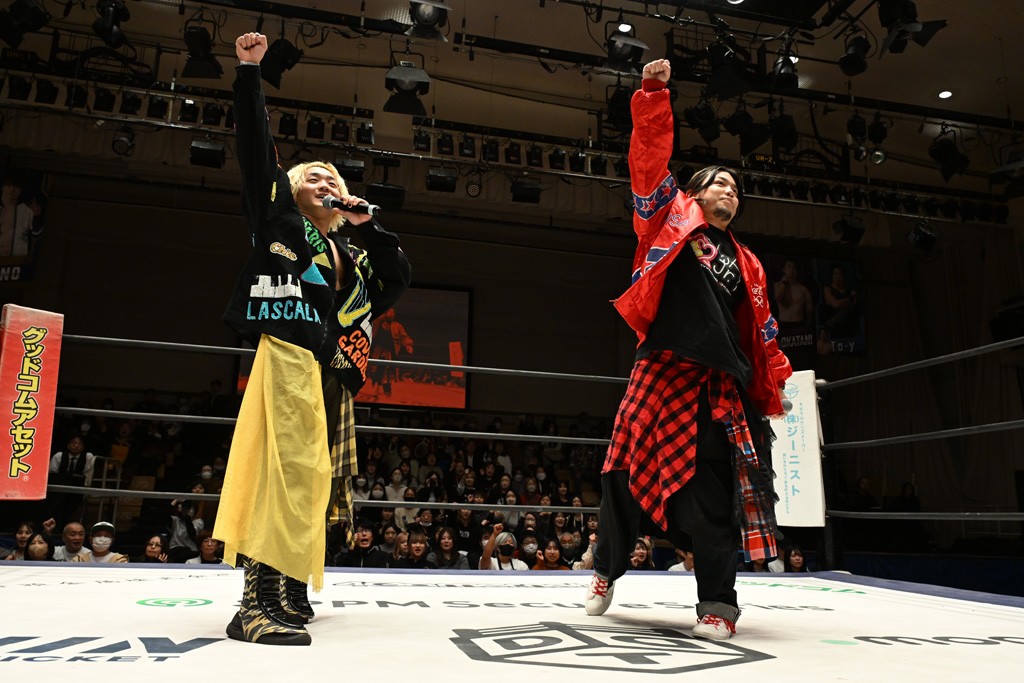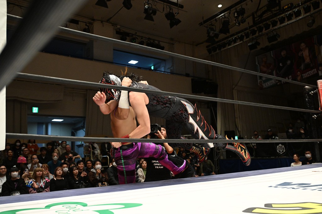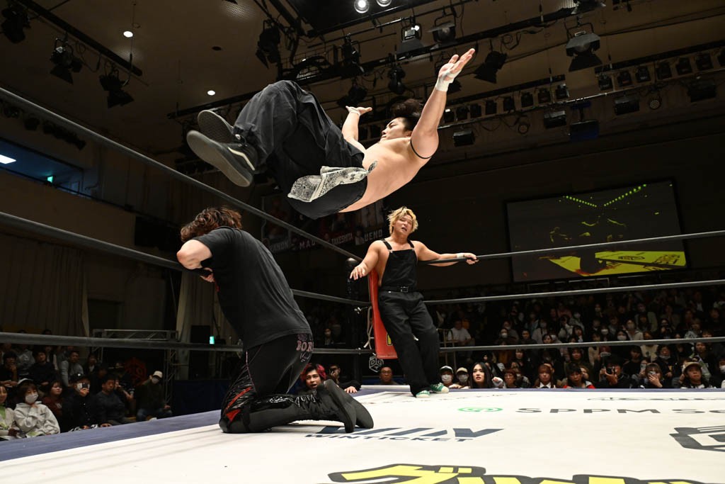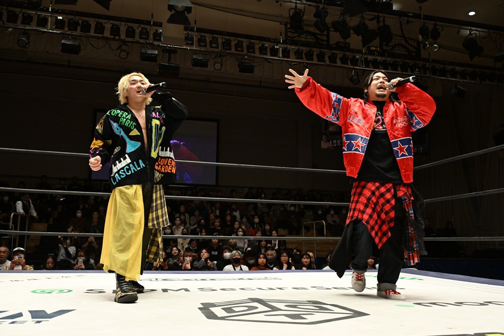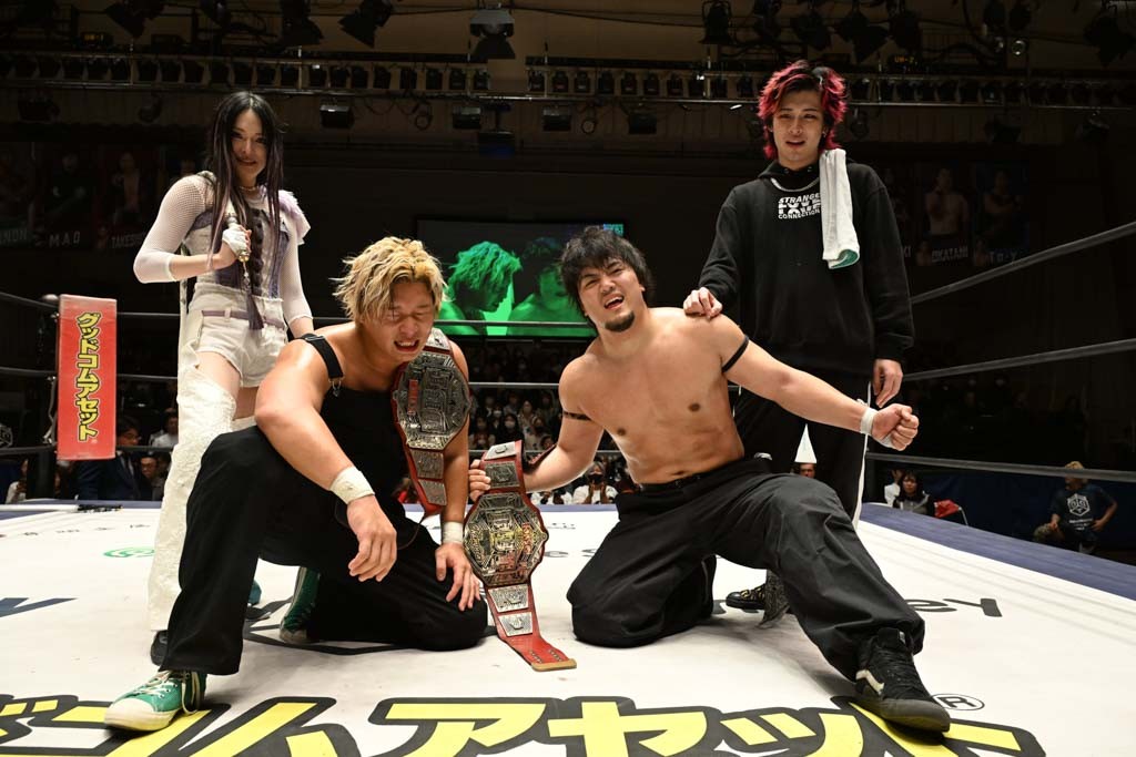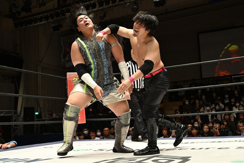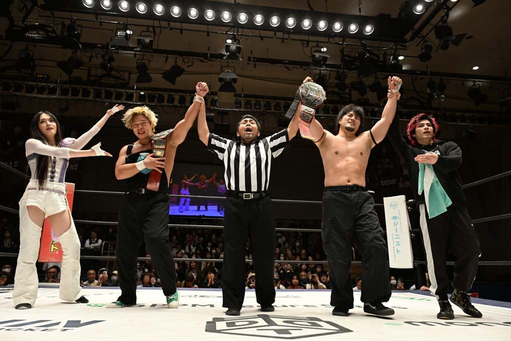 STRANGE LOVE CONNECTION(S.L.C.)のMAO&KANONが遺恨深きDAMNATION T.Aの佐々木大輔&岡谷英樹を下し、KO-Dタッグ王座の初防衛に成功。F-SWAGの政岡純&ガイア・ホックスが12・21後楽園で挑戦することが決まった。