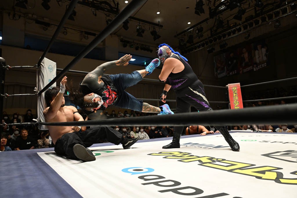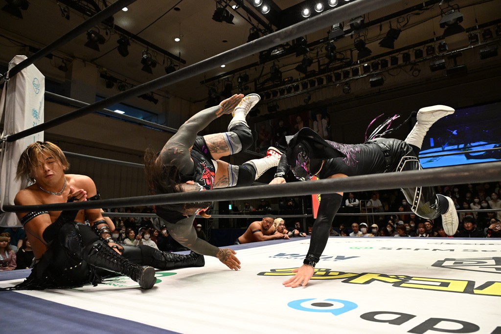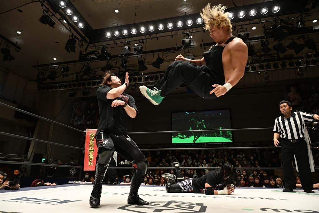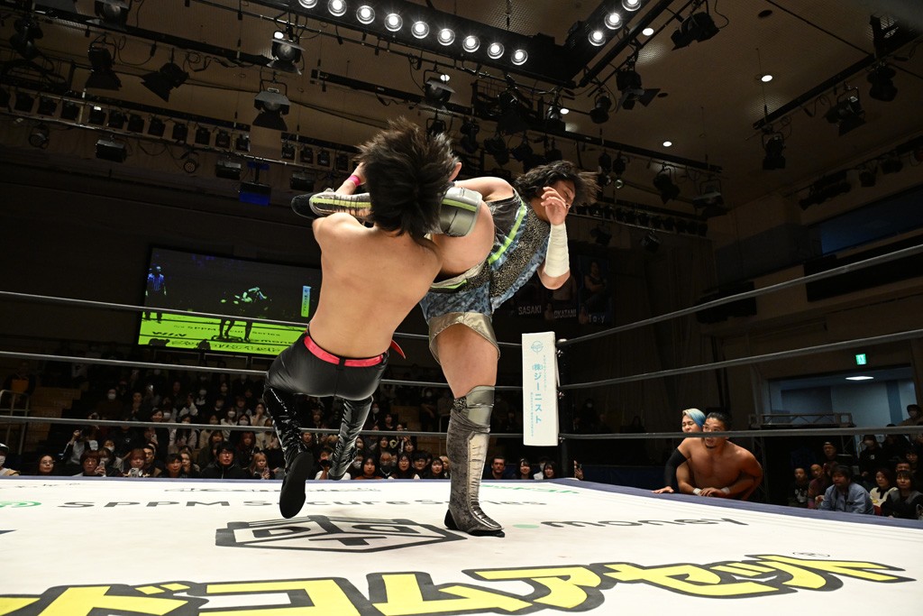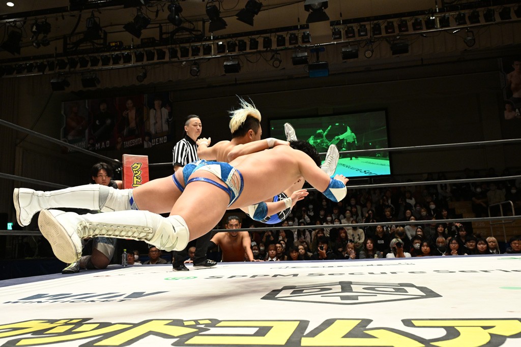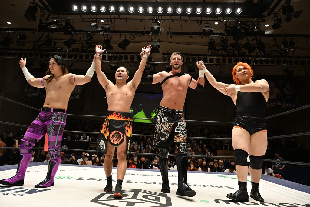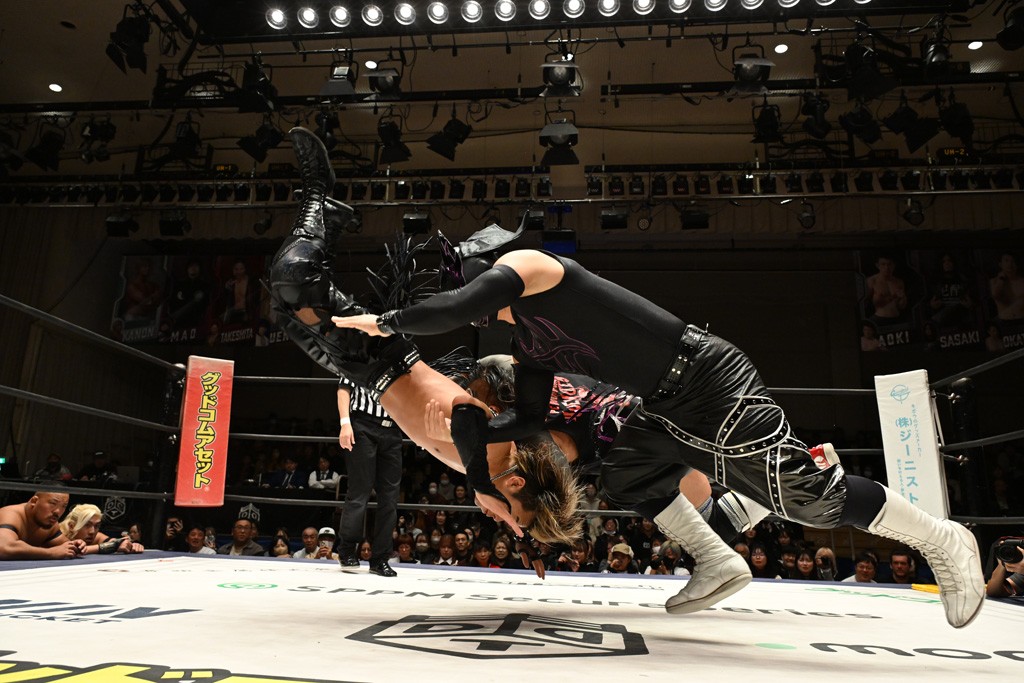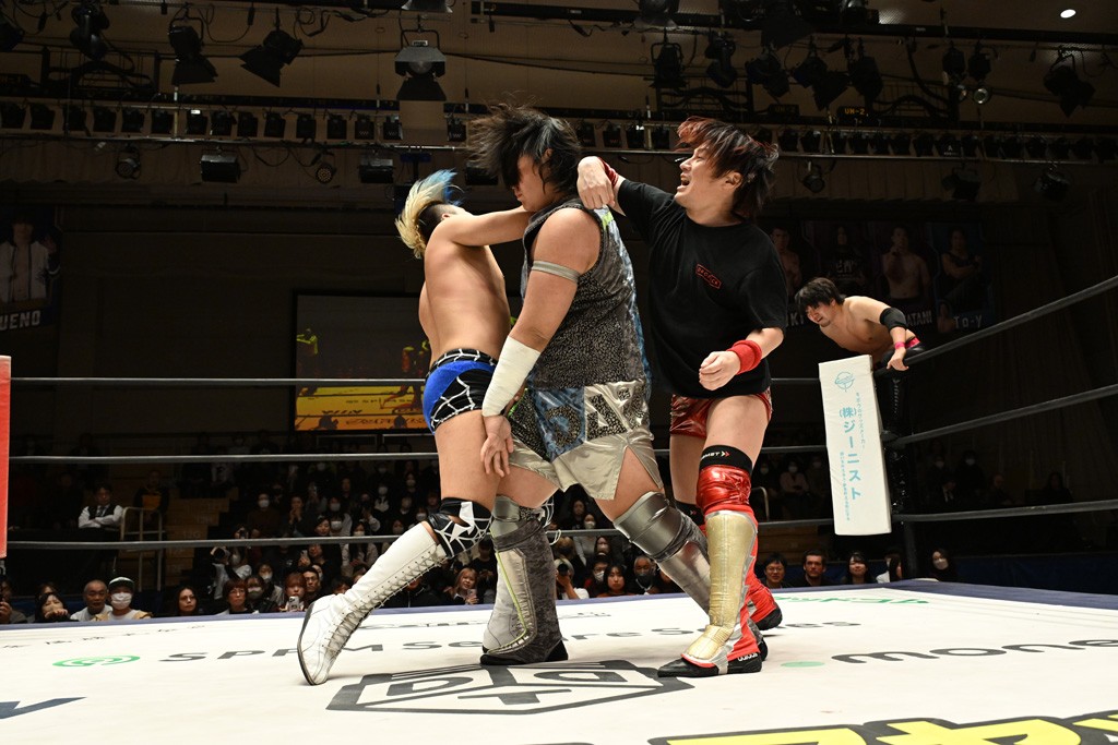 STRANGE LOVE CONNECTION(S.L.C.)のMAO&KANONが遺恨深きDAMNATION T.Aの佐々木大輔&岡谷英樹を下し、KO-Dタッグ王座の初防衛に成功。F-SWAGの政岡純&ガイア・ホックスが12・21後楽園で挑戦することが決まった。