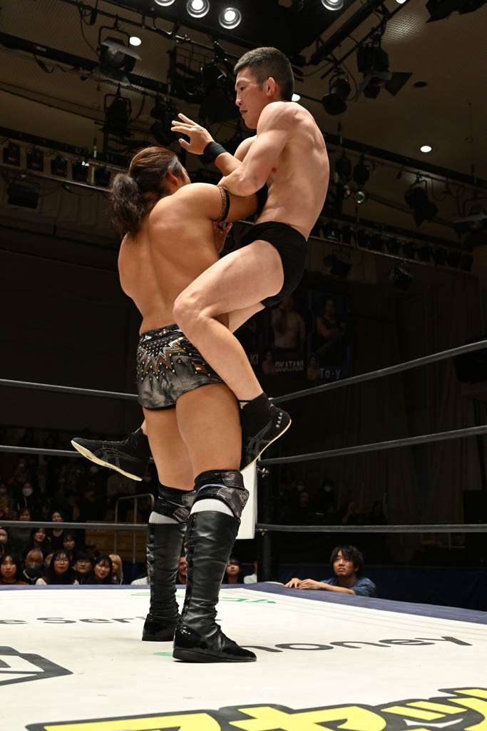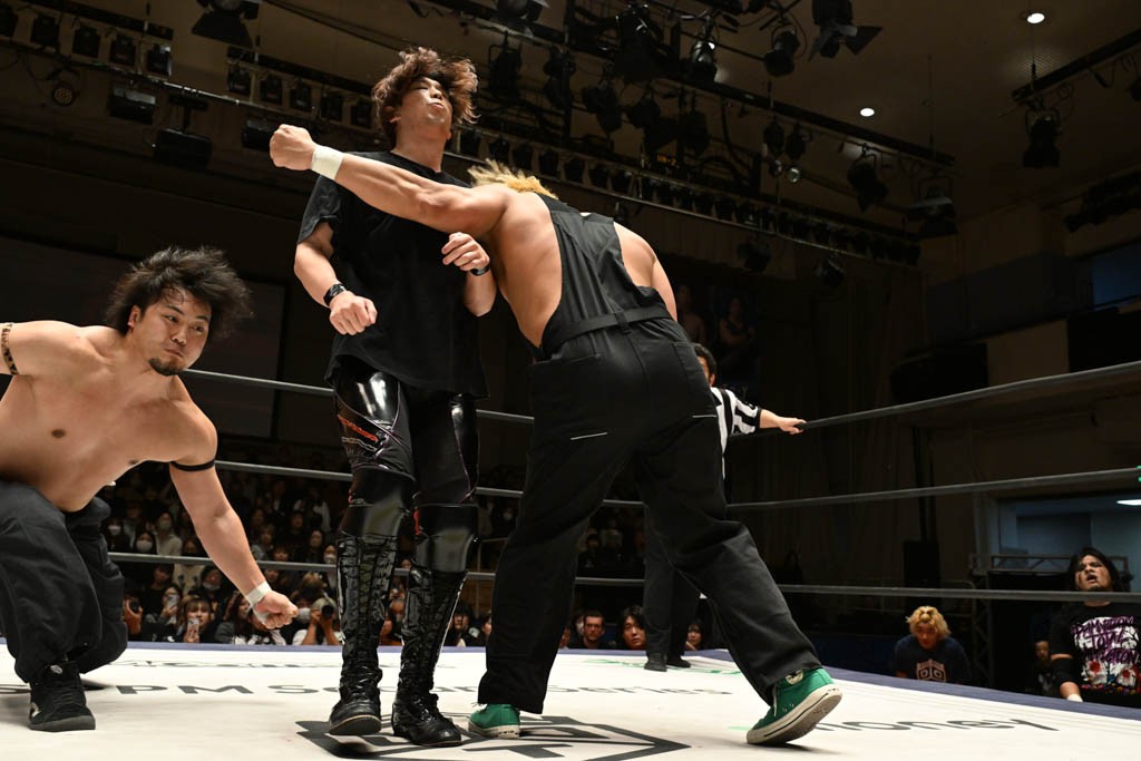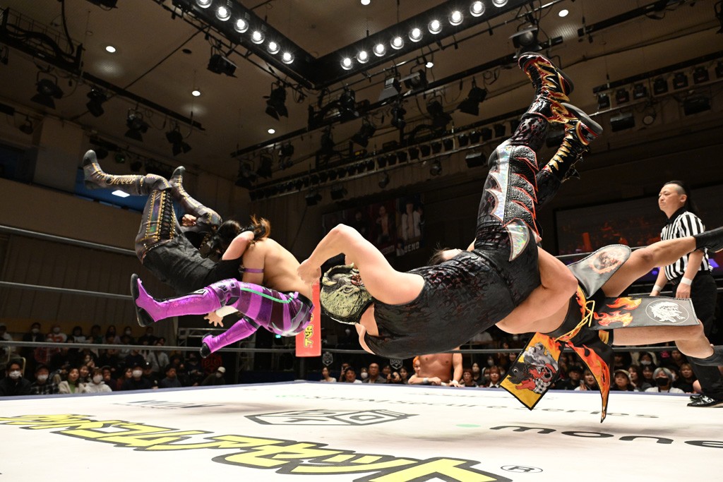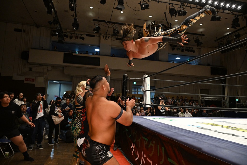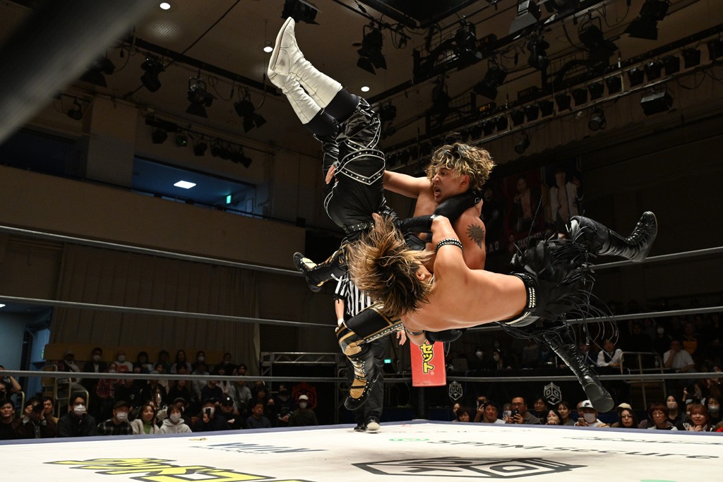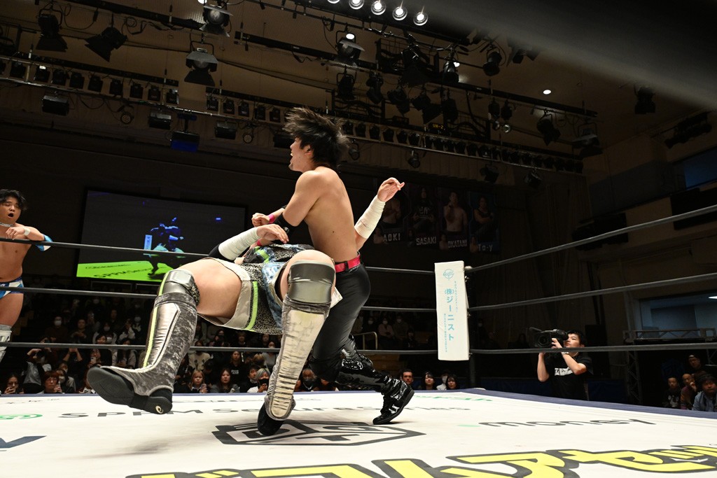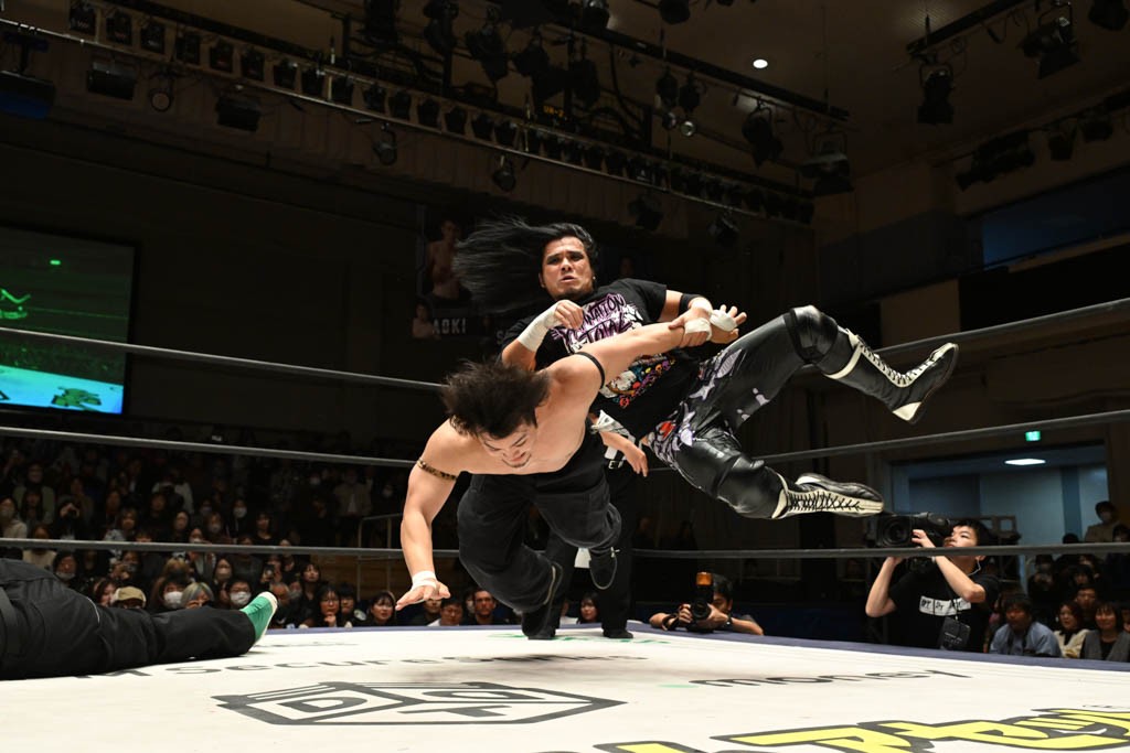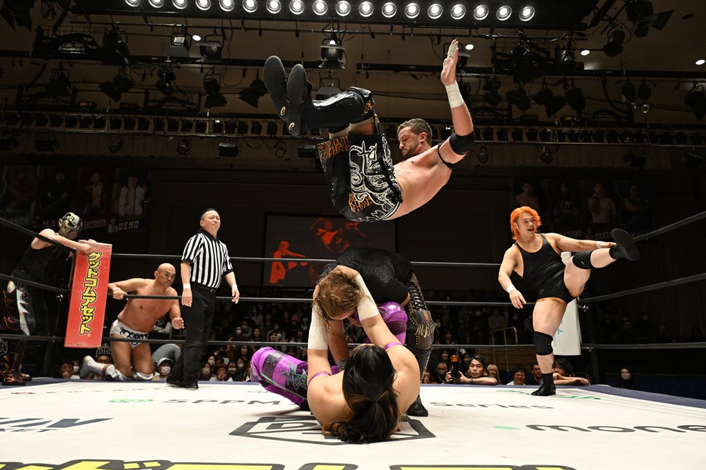 STRANGE LOVE CONNECTION(S.L.C.)のMAO&KANONが遺恨深きDAMNATION T.Aの佐々木大輔&岡谷英樹を下し、KO-Dタッグ王座の初防衛に成功。F-SWAGの政岡純&ガイア・ホックスが12・21後楽園で挑戦することが決まった。