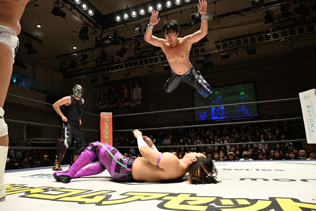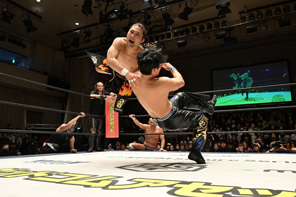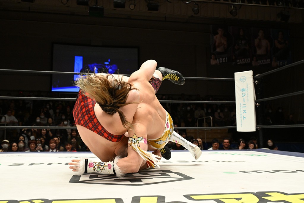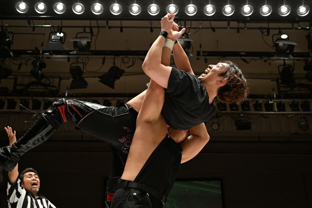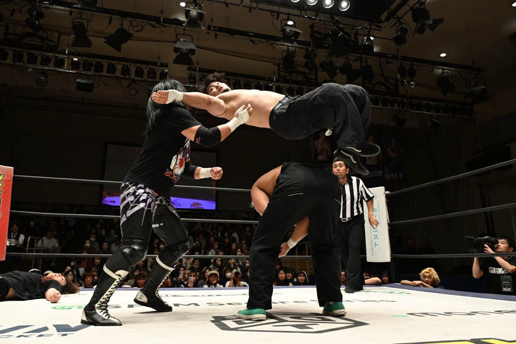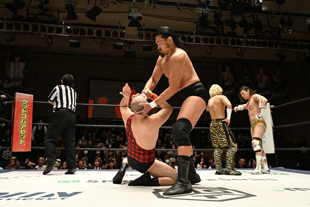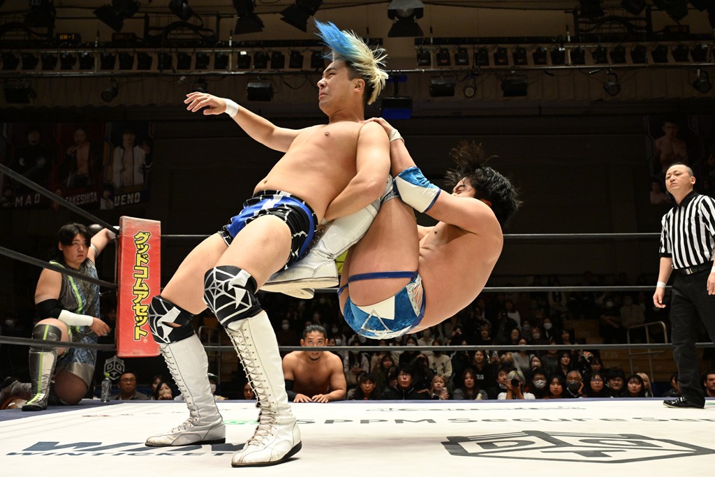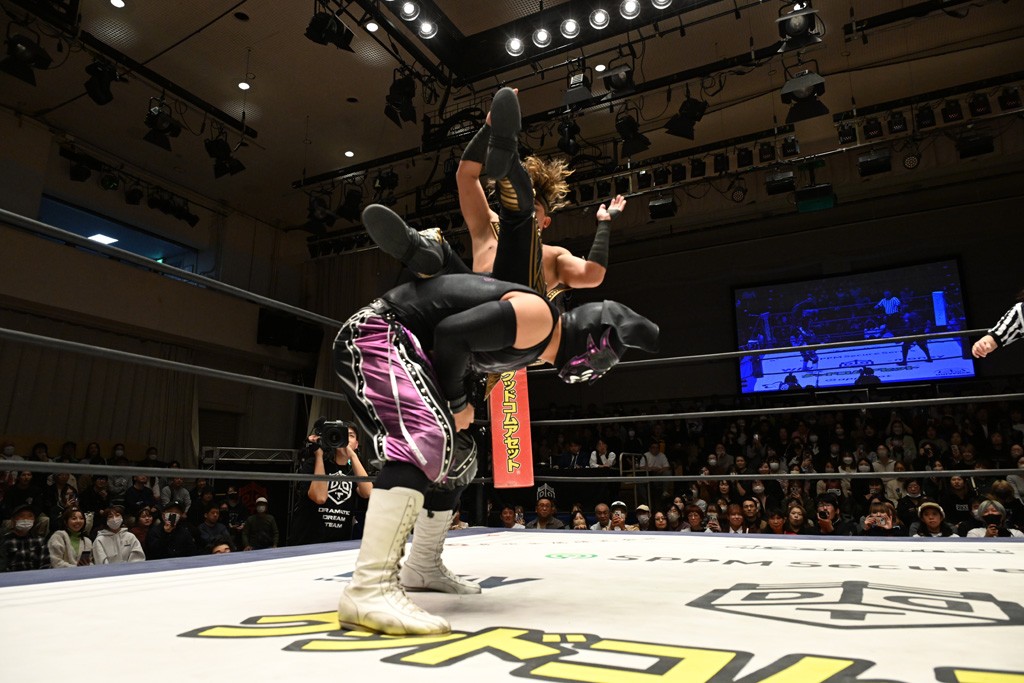 STRANGE LOVE CONNECTION(S.L.C.)のMAO&KANONが遺恨深きDAMNATION T.Aの佐々木大輔&岡谷英樹を下し、KO-Dタッグ王座の初防衛に成功。F-SWAGの政岡純&ガイア・ホックスが12・21後楽園で挑戦することが決まった。