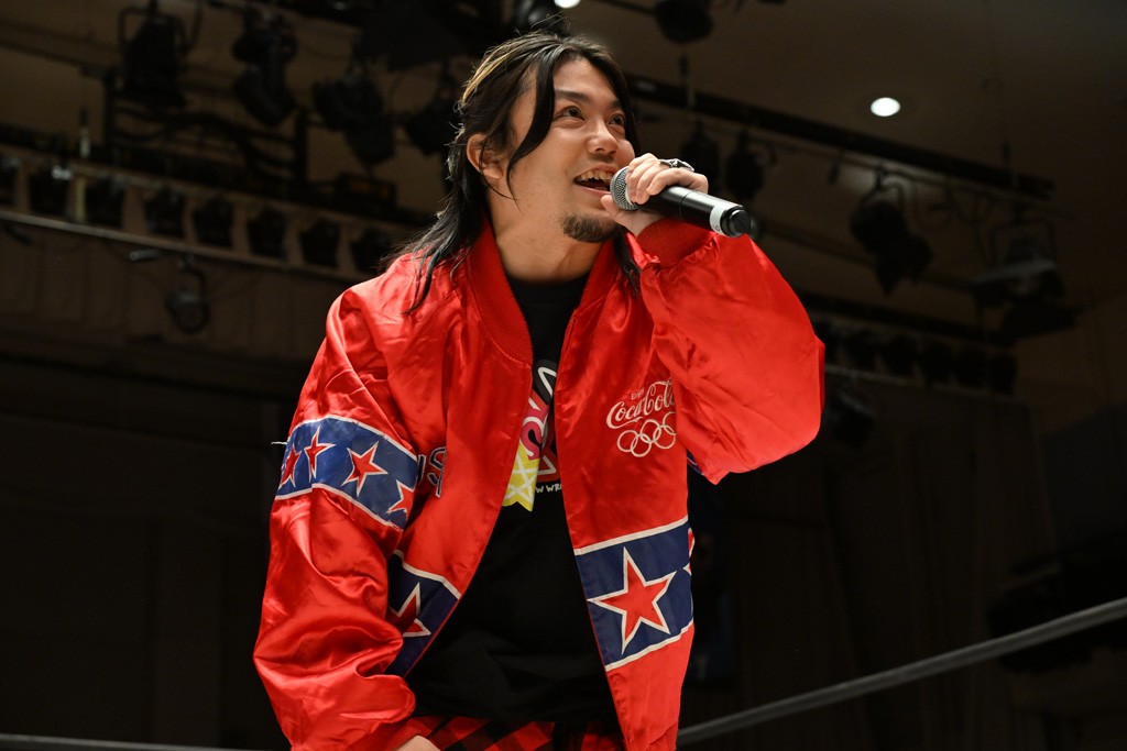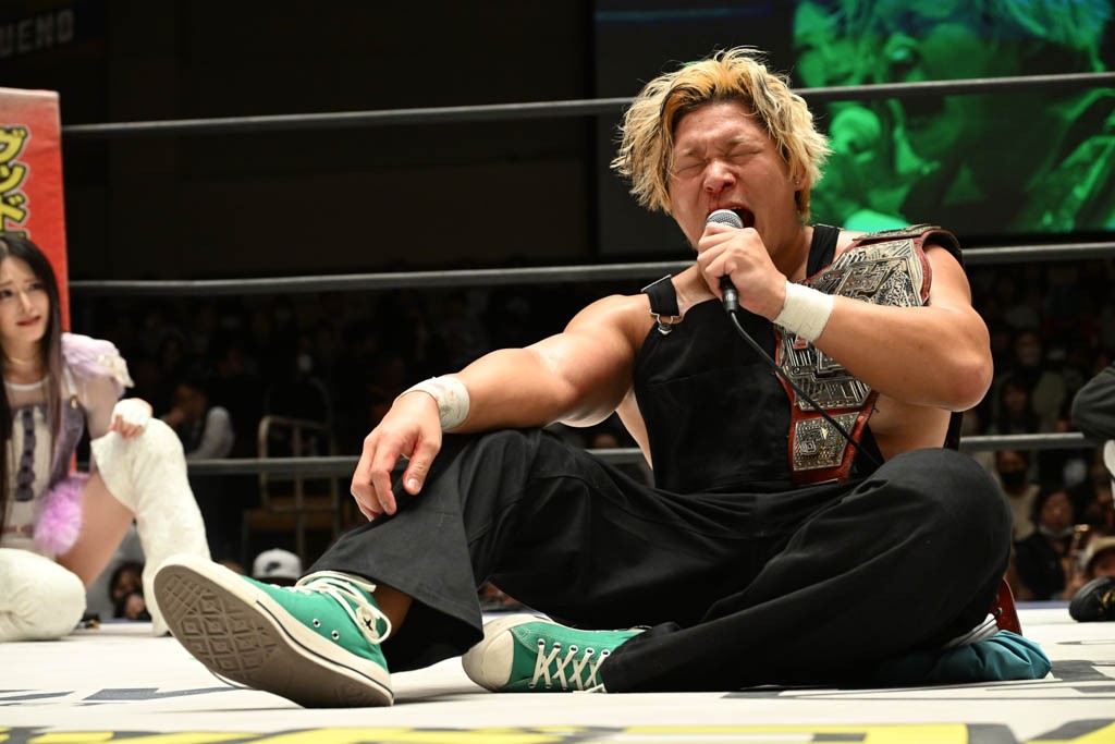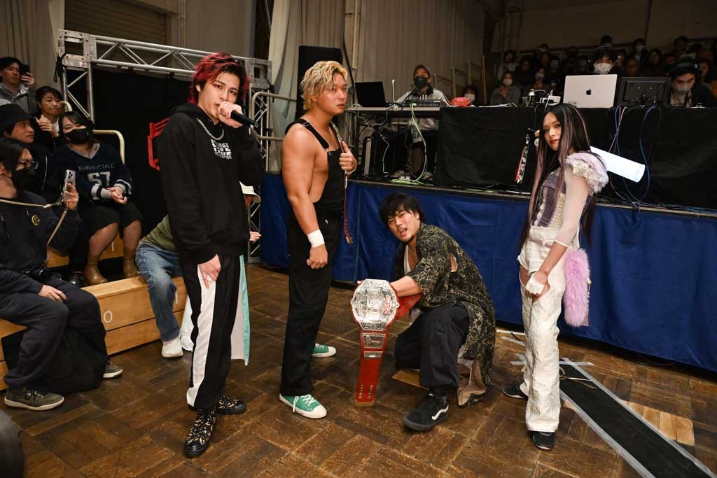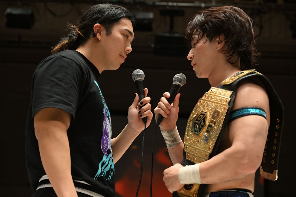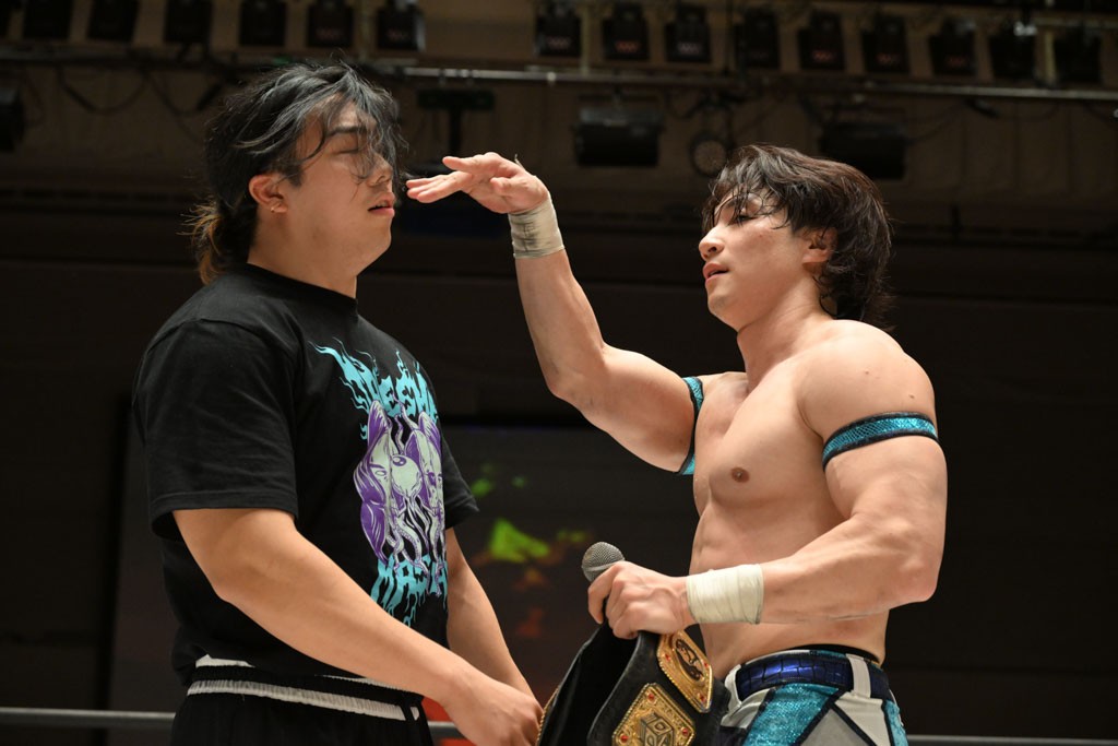 KANONは「一つだけ言わせてください。今なら自信があります。俺はいらない子じゃない。俺には仲間がいて、応援してくれるみんながいるから。DAMNATIONに勝って終わりじゃねぇ。俺はまだこのベルトでもっといい景色が見たい。1回防衛しただけだよ」とマイク。
