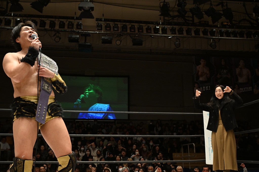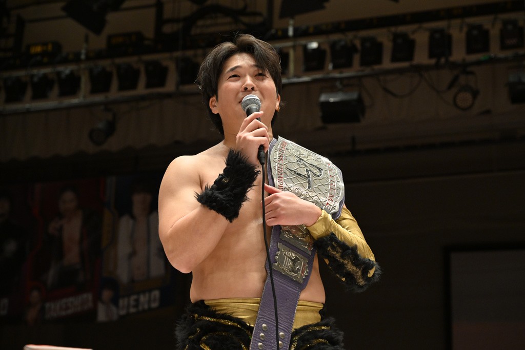 上野は「ササダンゴさん、頑張ってくれてありがとうございます。痛くて立ちたくないと思いながらマイクをするタイトルマッチはホントに楽しくて。僕たちは東京ドームに行けますか? 僕たちは夢を見てもいいですか?」と問い掛けた。ササダンゴは「DDTにとって、東京ドームは全然夢じゃないから。ここにいるお客さんを全員連れて行くだけの責任だから。俺たち全員が本気になれば、絶対にできるから。絶対に東京ドーム満員にして、みんなですっごい景色が見れるから。俺は頑張るよ。みんなも頑張るから」と涙ながらに返した。上野は「ササダンゴさん、僕はきっと棚橋弘至さんみたいなプロレス界のアイコンになることはないと思いますけど大丈夫です。僕がプロレスって言えばDDTだよねって。プロレスってDDTがすごいよねって。プロレスをDDTにするから。僕はそういうチャンピオンになるから、もう1回頑張って挑戦しに来てください」と言葉を掛けると、ササダンゴは「上野は上野になればいいんです」と返して退場した。