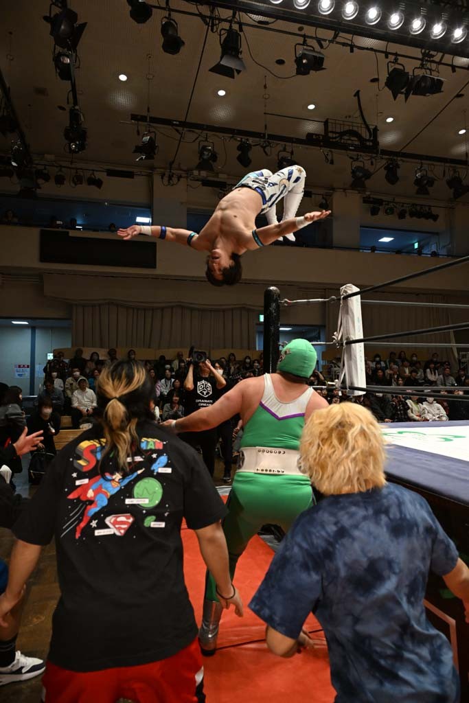 パワポが終わると、ササダンゴはなおもリバース・シュリンプ・ホールドで絞め上げるもエスケープ。垂直落下式リーマンショックはカウント2。上野は後頭部へのドロップキック、正調ドロップキック、BME、ドロップキックとたたみかけるも、ササダンゴはことごとくカウント2で返していった。その後はドロップキックの応酬となり、最後は上野が顔面への強烈なドロップキックでトドメを刺した。