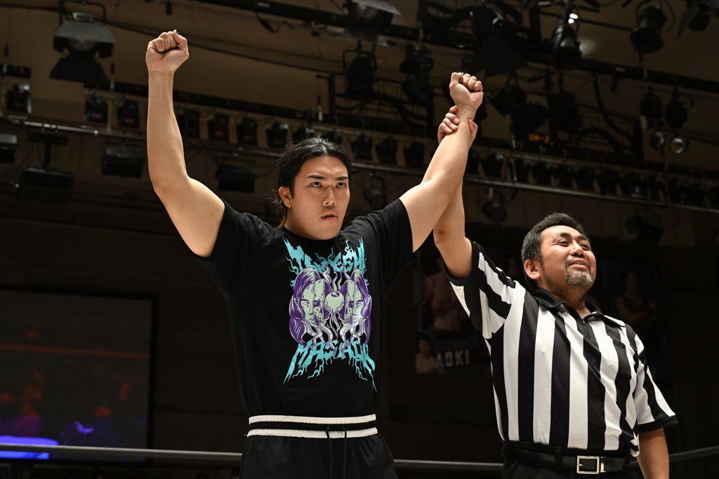 バックステージでTAKESHITAは「青木さんとは何回かやってますけど、今日が一番負けられないですよね。IWGPチャンピオンなので。勝って自信になったし、3日くらい前から、AEWで『コンチネンタルクラシック』というリーグ戦が始まって、初エントリーしてるんで、それも負けられない。頑張ります。頑張った先には東京ドームが待ってるらしいんで。来年1・4東京ドームがあるけど、DDTに残ってる以上、DDTで東京ドームに行きたい。それを達成するまでは自分も引くに引けない。自分のプロレスを見て、DDTに入った上野(勇希)がチャンピオンとして、東京ドームに行くって言うなら、僕もそれを望む。僕らならやれると思うんで。(久々の複数参戦になったが?)Dジェネレーション世代の実力がついてるなっていうのが一番印象に残っていて。DDT大丈夫だなって感じる1ヵ月でした。DDT、新日本、AEW、それぞれ面白くて、僕だからできることがきっとあって、まだまだそれを探してます。(4年ぶりの青木は?)青木さんと戦う度にプロレスのリングって、自分の生き様が出るんだなって感じるんです。今回試合して、おそらく前よりめっちゃプロレス好きになってるやんって感じられてうれしかったです」と語った。