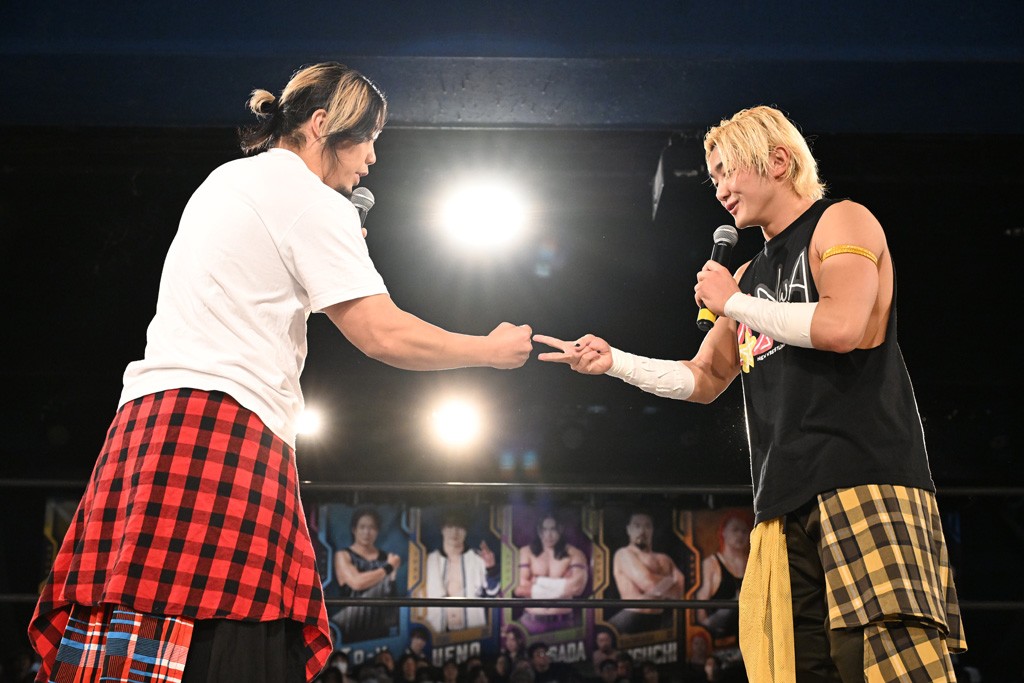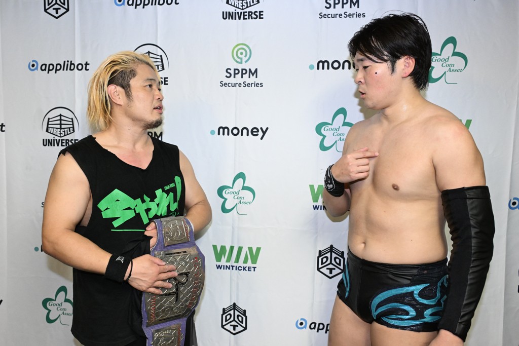 上野は「素晴らしい心意気じゃないか。俺が無差別級を獲る前、タケ(KONOSUKE TAKESHITA)が米国に行く頃、DDTを背負うと言い出した。そのとき、正田はすごいと思うくらい、一生懸命やることしかできなかった。ベルトを腰に巻いて、タイトルマッチやるだけがチャンピオンじゃない。会社もお客さんも対戦相手も全部背負って立つのがチャンピオンだと思ってるので。他の誰でもない、正田壮史のプロレスをもって俺に挑んできてくれ。俺は受け止めるけど、弾き返すかもしれないけど。正田が全力で来てくれたら、俺もいけるから。俺たちなら絶対見せられるから。でも、それは正田次第だから、愛と責任を持って頑張りましょう」と投げ掛けた。