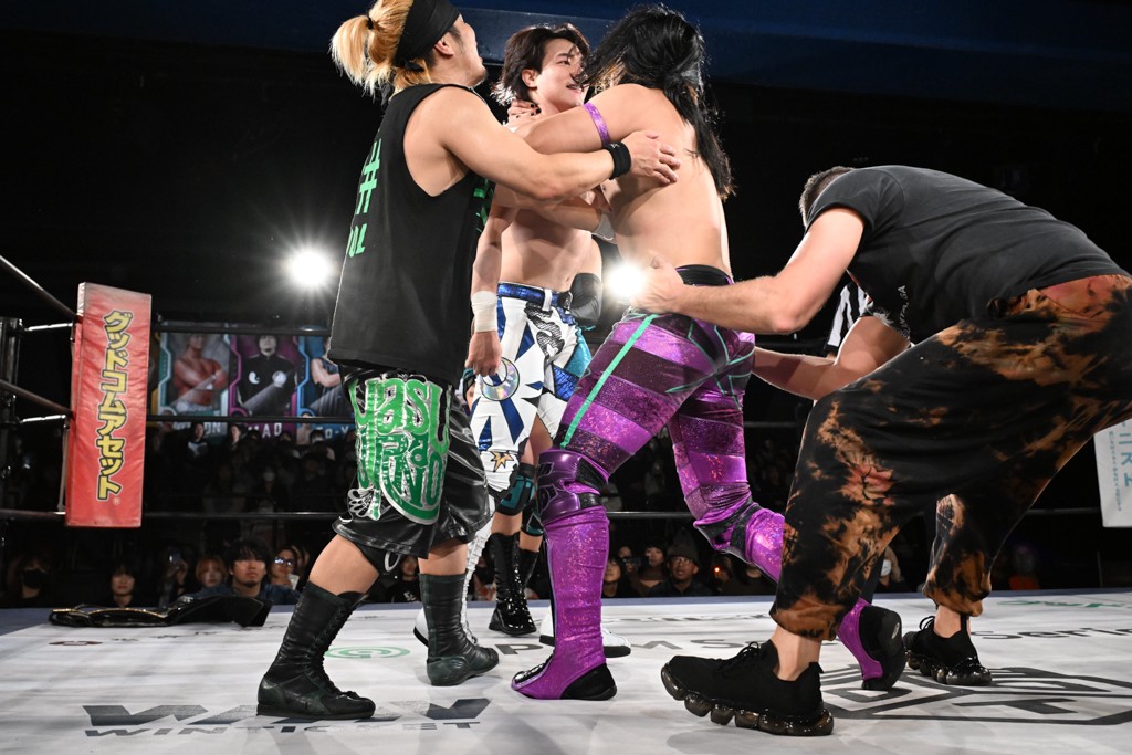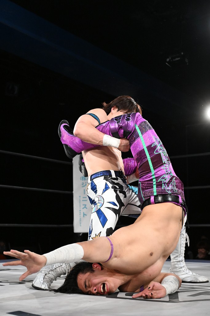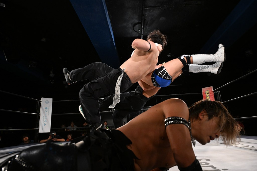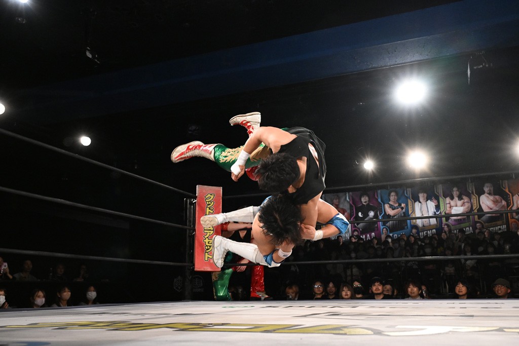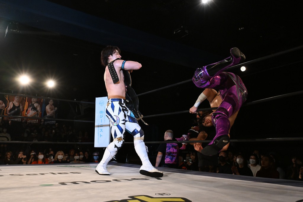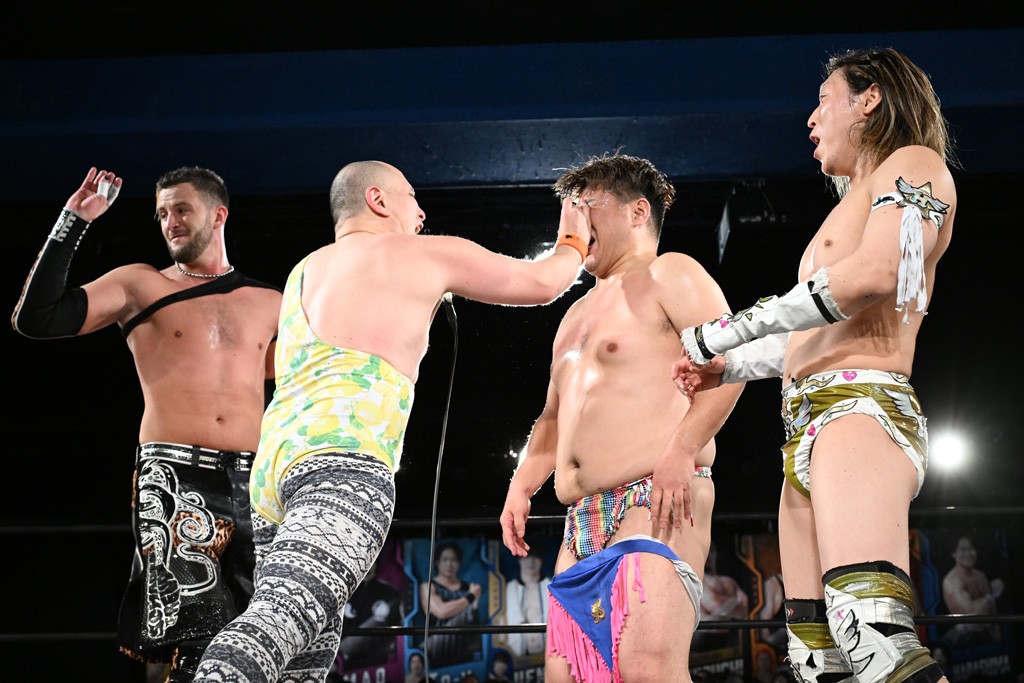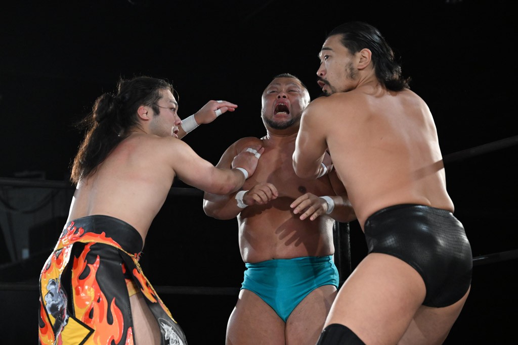 この日のセミファイナルでF-SWAGは瑠希也とのトリオで、MAO、KANON、須見和馬組と対戦。F-SWAGは連係が冴えわたり、須見を攻め込んだ。KANONはラリアットで2人まとめて吹っ飛ばせば、MAOはガイアに旋風脚を叩き込んで対抗。ガイアがノータッチのトペコン・ヒーロでS.L.C.を場外に完全排除。最後はF-SWAGが合体技のF-DRIVE Ⅱを須見に見舞い、政岡がカバーして3カウントを奪取した。