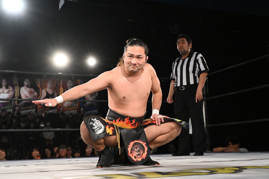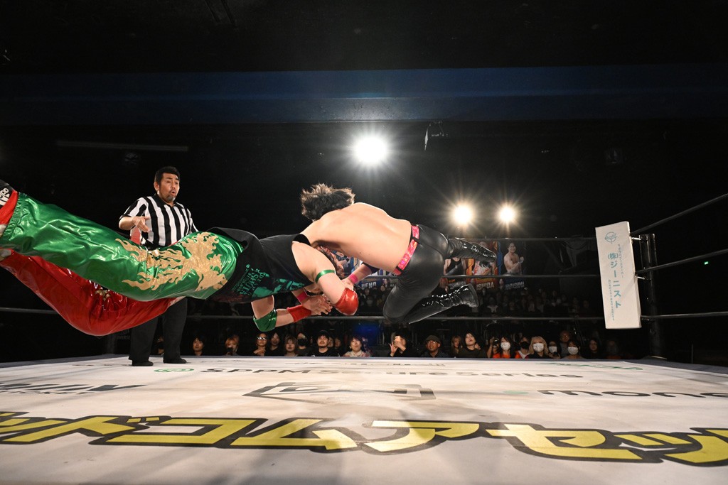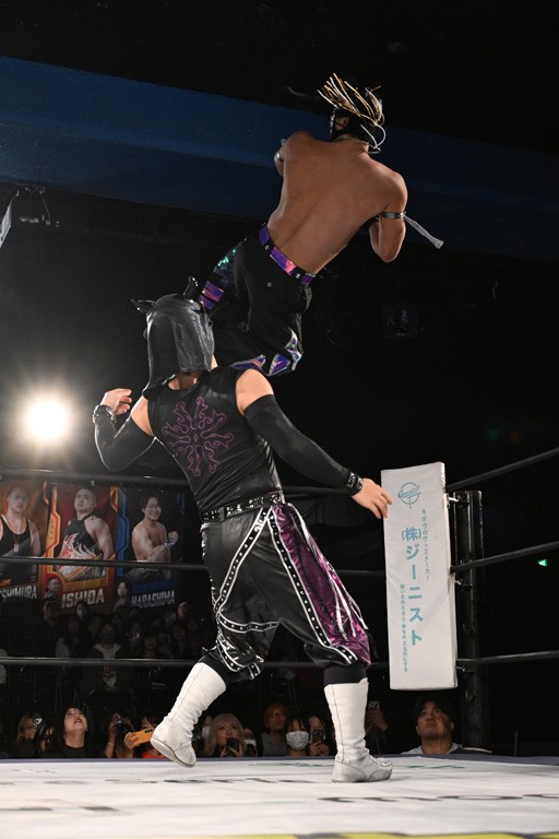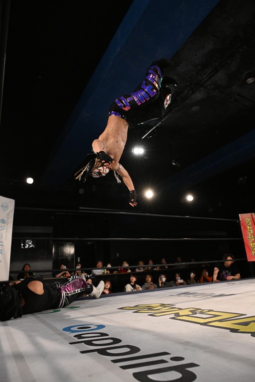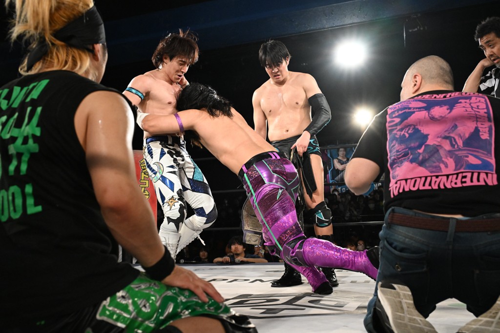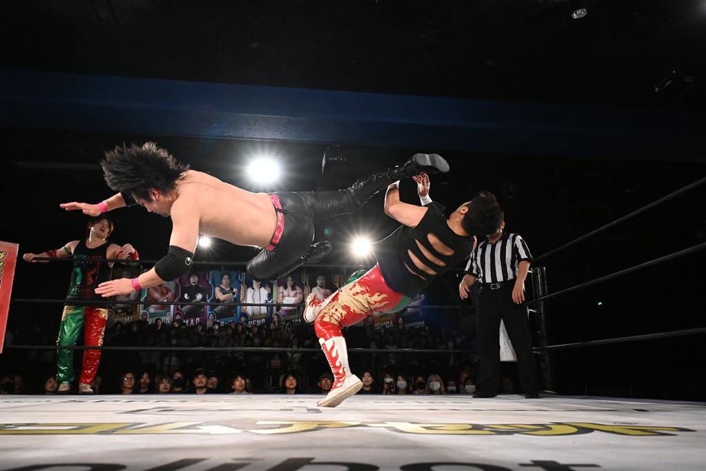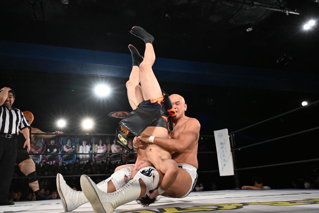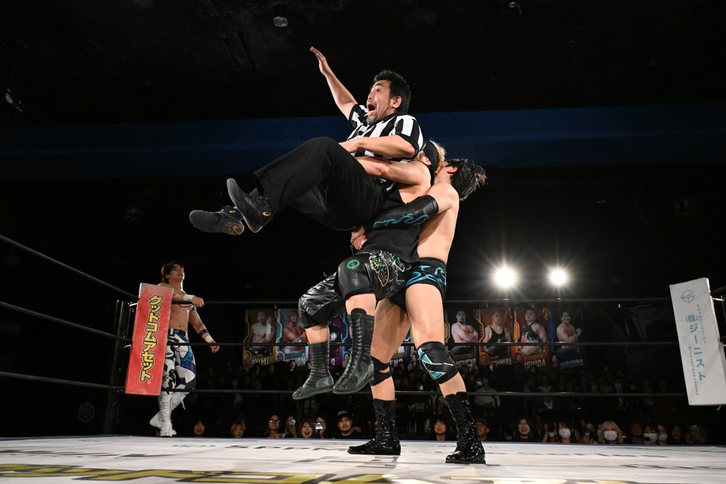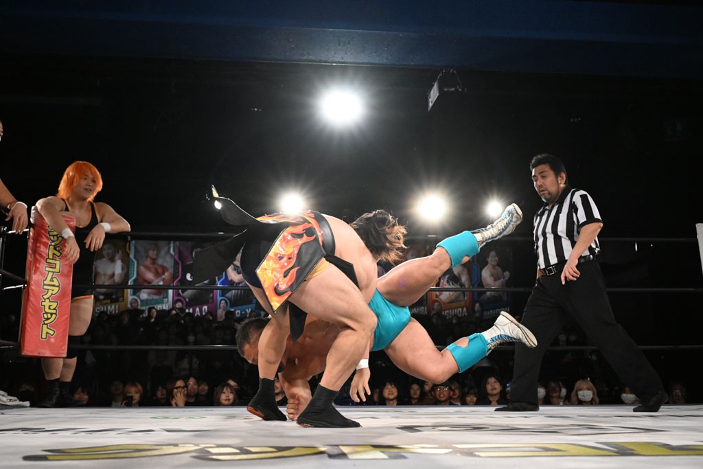 この日のセミファイナルでF-SWAGは瑠希也とのトリオで、MAO、KANON、須見和馬組と対戦。F-SWAGは連係が冴えわたり、須見を攻め込んだ。KANONはラリアットで2人まとめて吹っ飛ばせば、MAOはガイアに旋風脚を叩き込んで対抗。ガイアがノータッチのトペコン・ヒーロでS.L.C.を場外に完全排除。最後はF-SWAGが合体技のF-DRIVE Ⅱを須見に見舞い、政岡がカバーして3カウントを奪取した。
