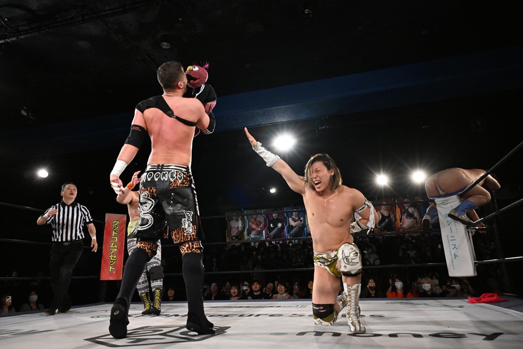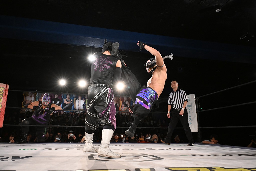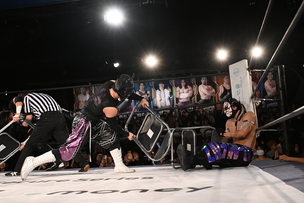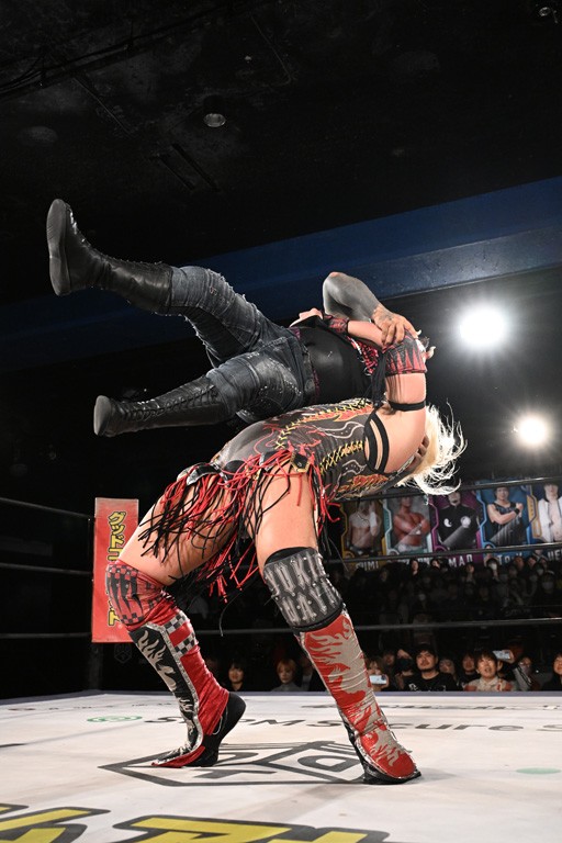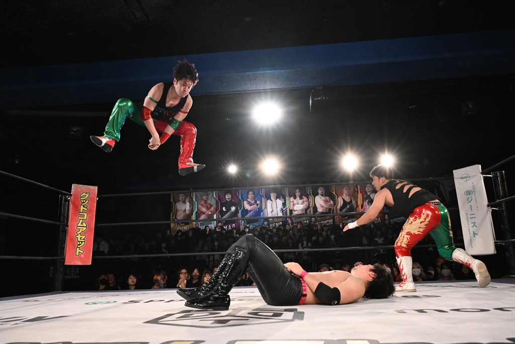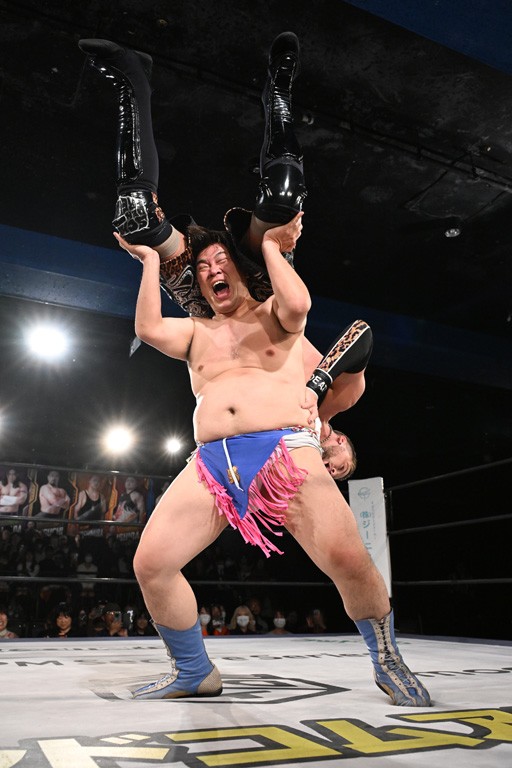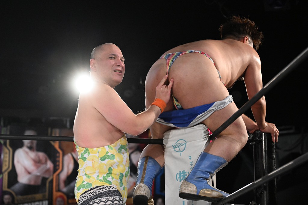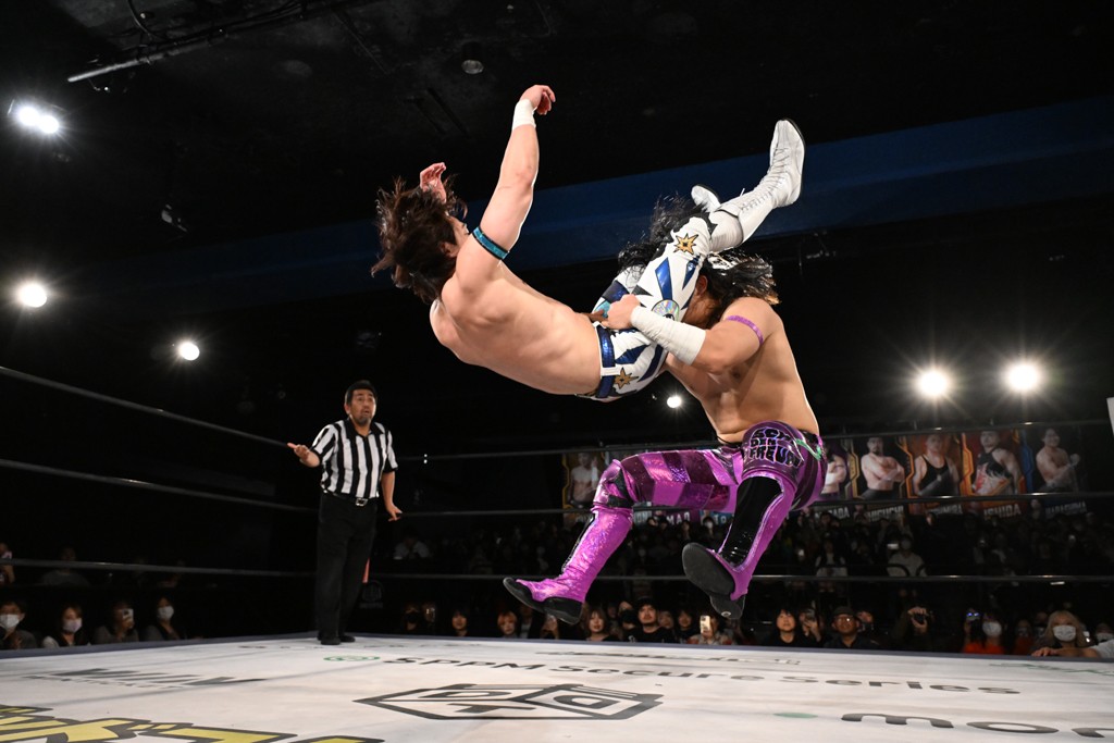 この日のセミファイナルでF-SWAGは瑠希也とのトリオで、MAO、KANON、須見和馬組と対戦。F-SWAGは連係が冴えわたり、須見を攻め込んだ。KANONはラリアットで2人まとめて吹っ飛ばせば、MAOはガイアに旋風脚を叩き込んで対抗。ガイアがノータッチのトペコン・ヒーロでS.L.C.を場外に完全排除。最後はF-SWAGが合体技のF-DRIVE Ⅱを須見に見舞い、政岡がカバーして3カウントを奪取した。