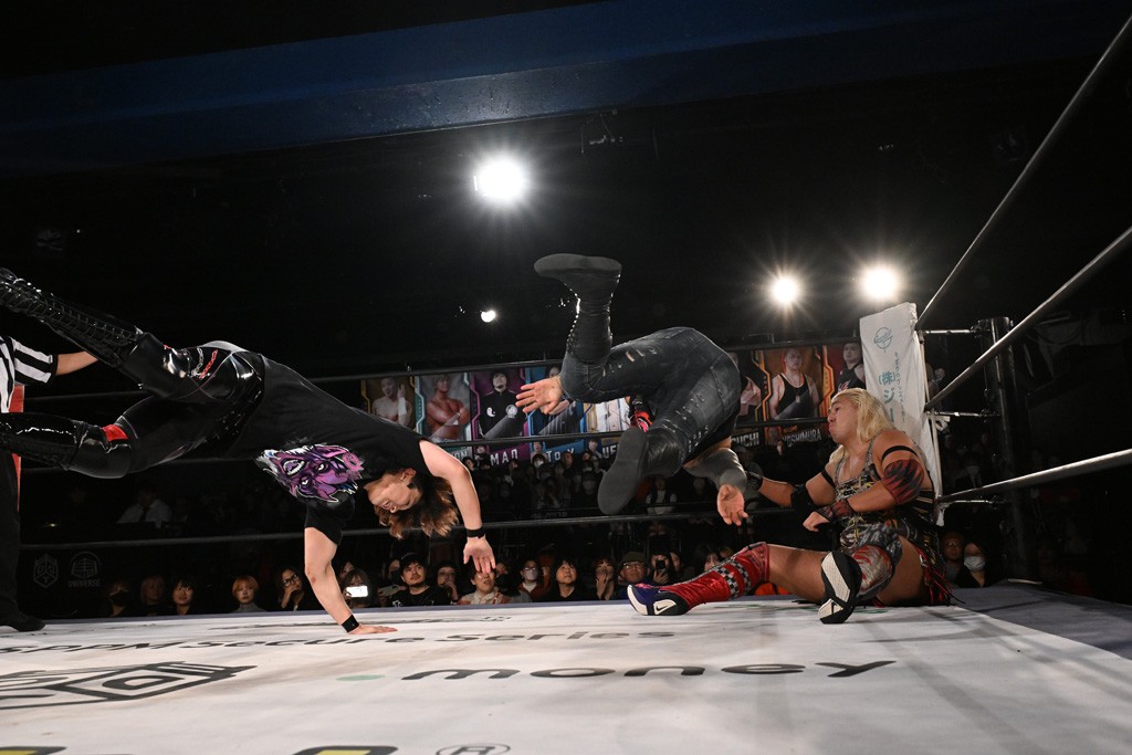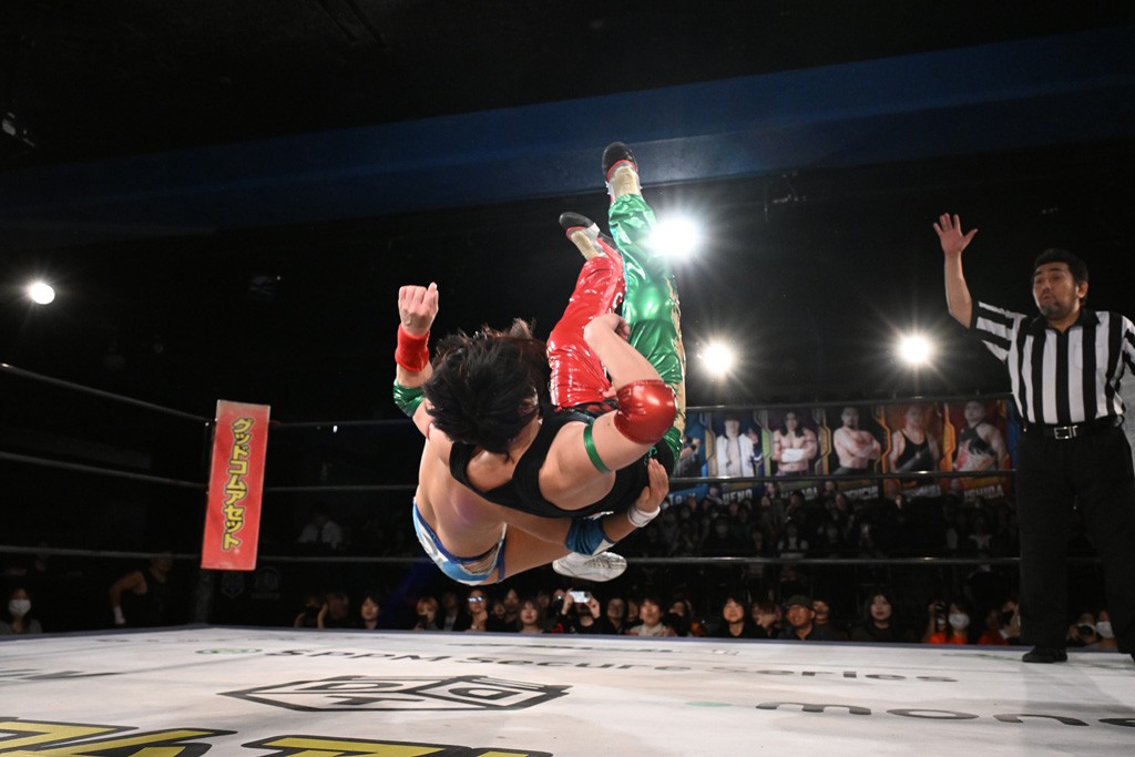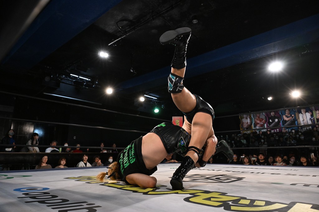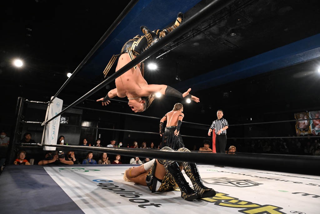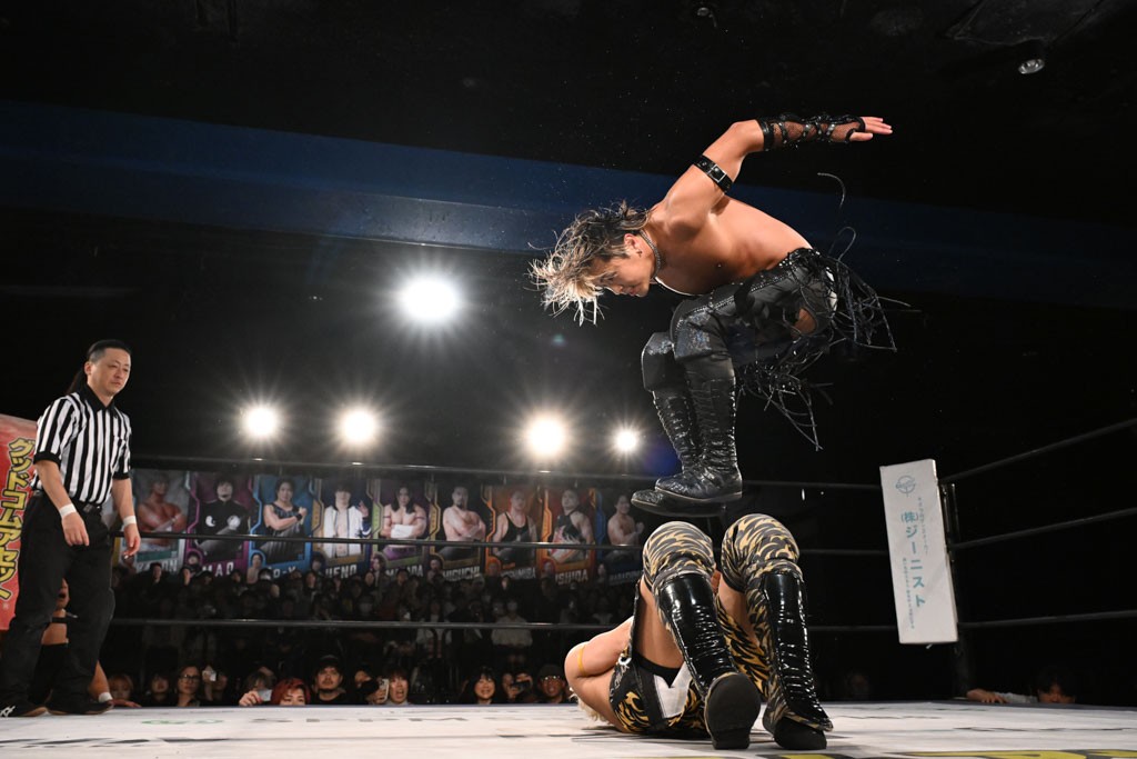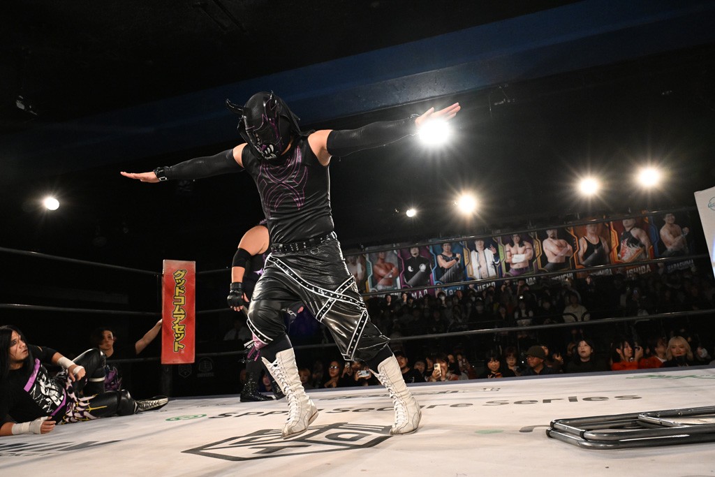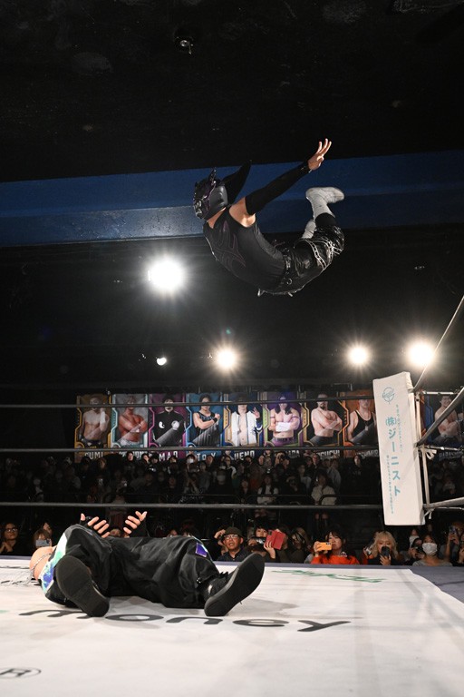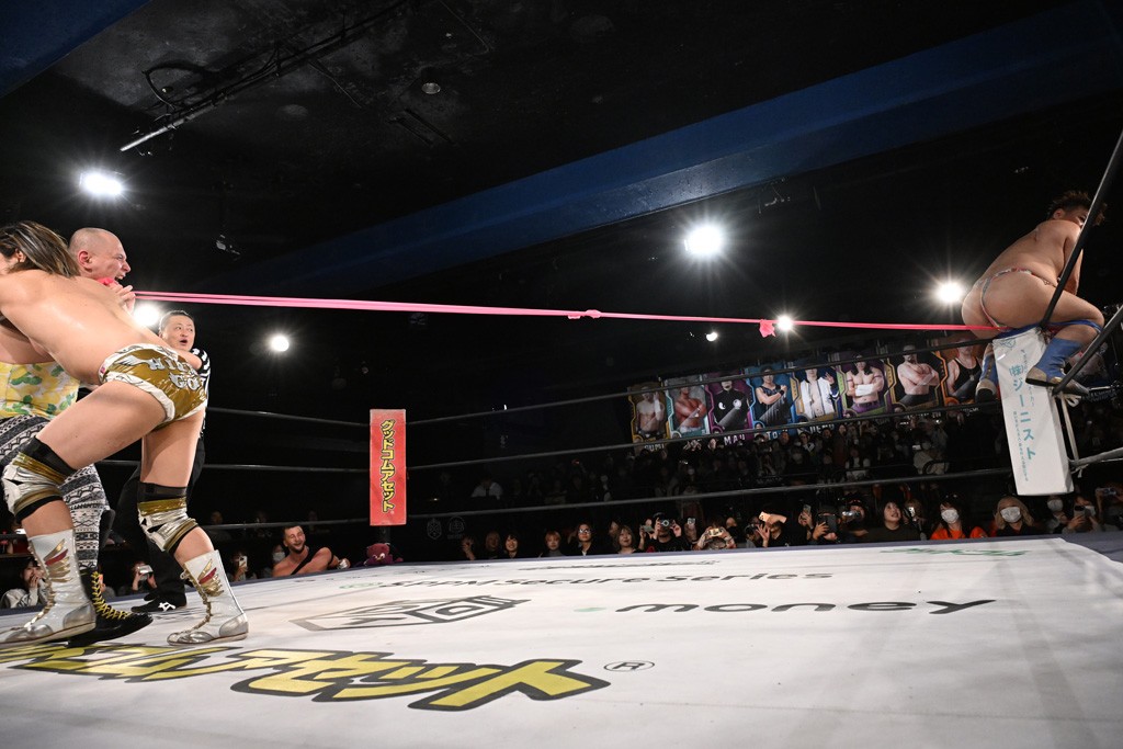 この日のセミファイナルでF-SWAGは瑠希也とのトリオで、MAO、KANON、須見和馬組と対戦。F-SWAGは連係が冴えわたり、須見を攻め込んだ。KANONはラリアットで2人まとめて吹っ飛ばせば、MAOはガイアに旋風脚を叩き込んで対抗。ガイアがノータッチのトペコン・ヒーロでS.L.C.を場外に完全排除。最後はF-SWAGが合体技のF-DRIVE Ⅱを須見に見舞い、政岡がカバーして3カウントを奪取した。