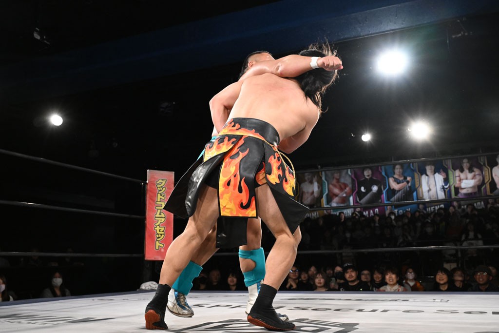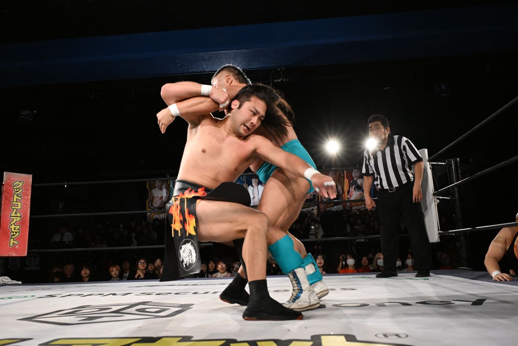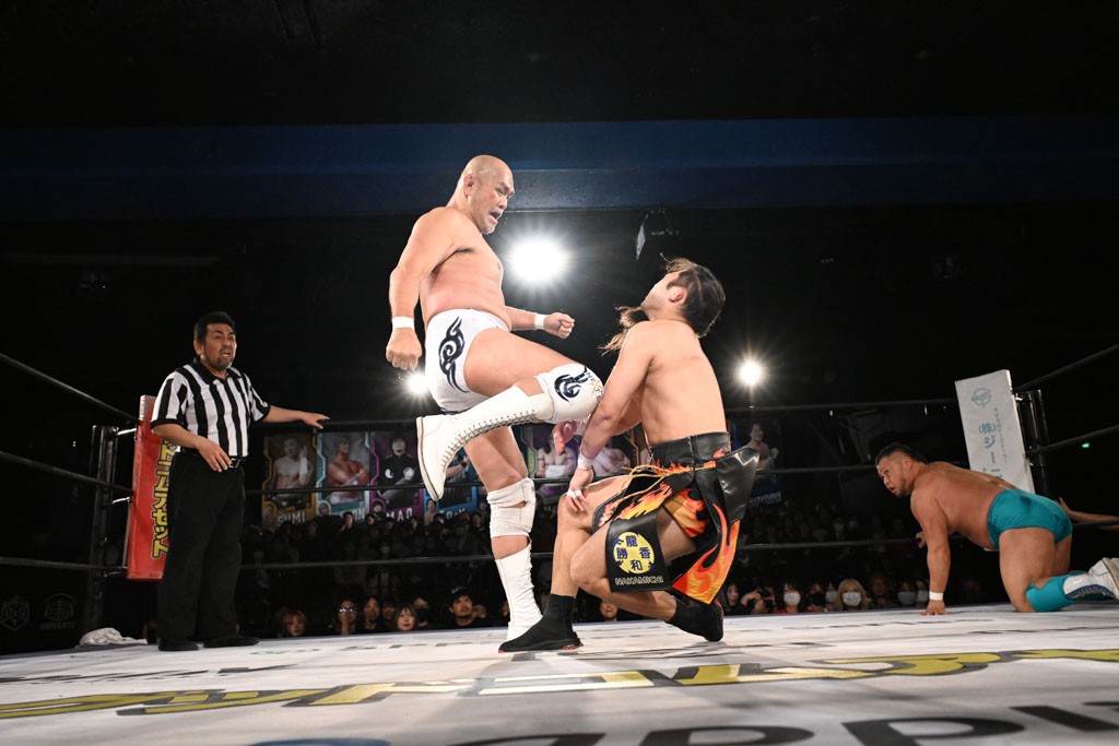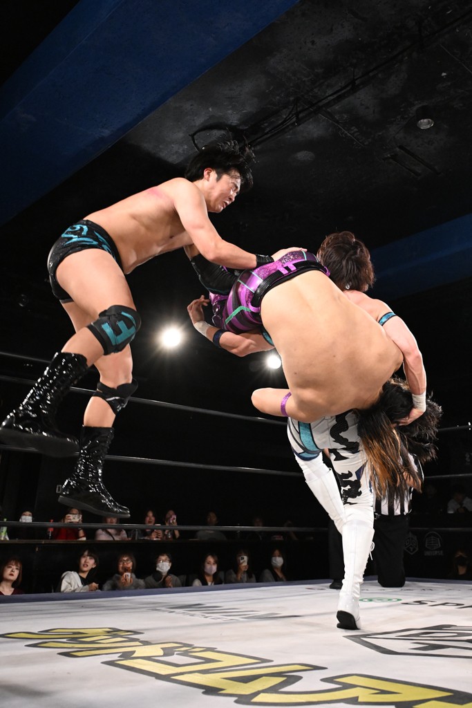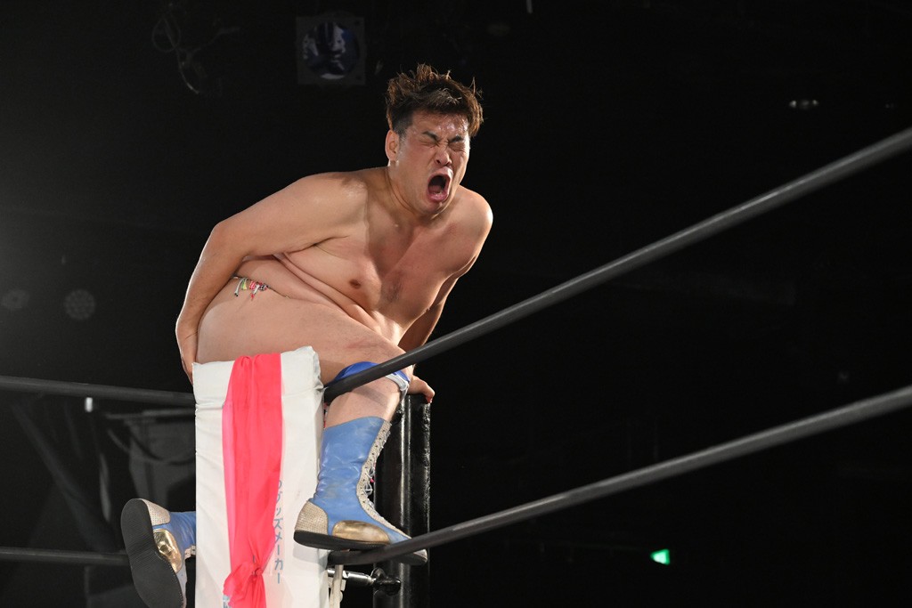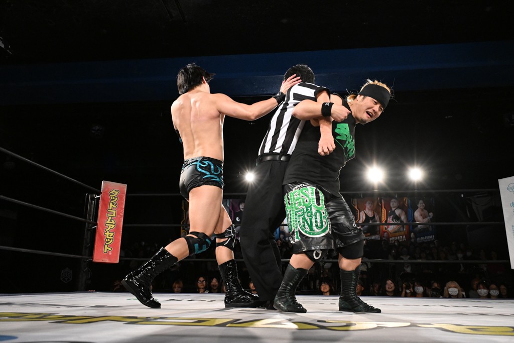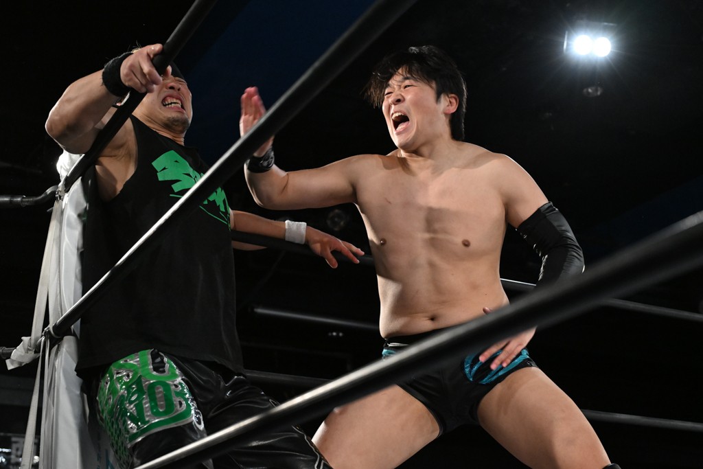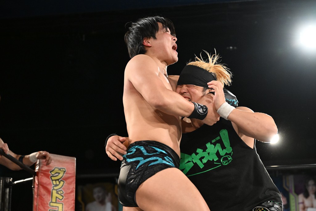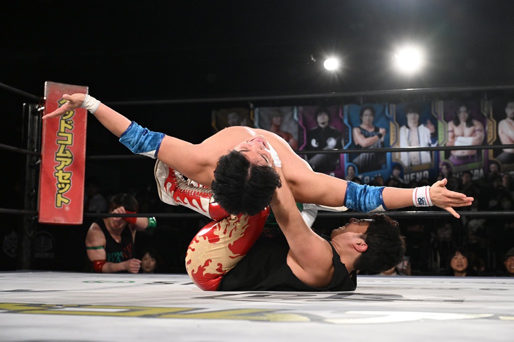 この日のメインイベントで、上野はTo-yとのコンビで正田&ヤス・ウラノと対戦。To-yがウラノにマシンガンチョップを叩き込めば、ウラノはTo-yの背中をかきむしる。正田は気迫をみなぎらせて、上野とエルボーのラリー、ラリアット相打ち。ミドルキック連打、張り手もぶちかます。上野が投げ捨てジャーマンを見舞えば、正田も同じ技で返す。正田が上野にジャーマン・スープレックス・ホールドもカウント2。上野は正田にフロッグスプラッシュ、スタンド式シャイニング・ウィザードも2カウントで返した。上野は飛びついてBlackout Sleeperで絞め上げると、正田が気を失ってレフェリーストップ。試合後、意識を取り戻した正田は猛然と上野に突っかかっていくも、パートナー、セコンド陣が制止した。