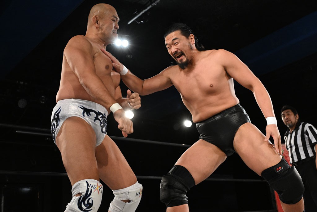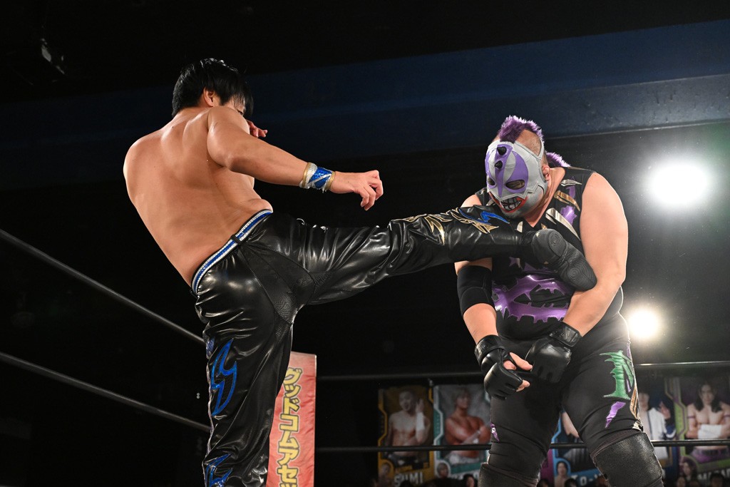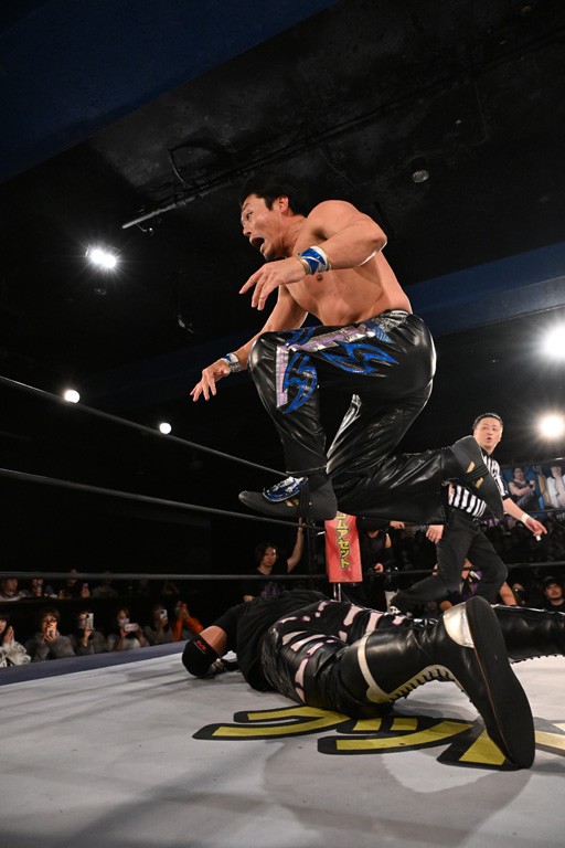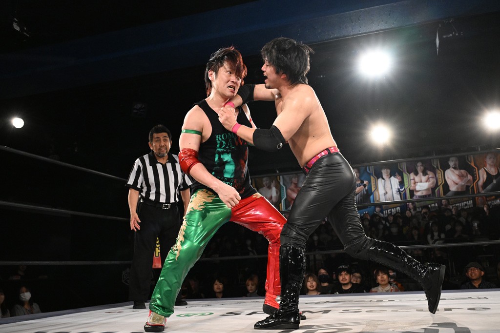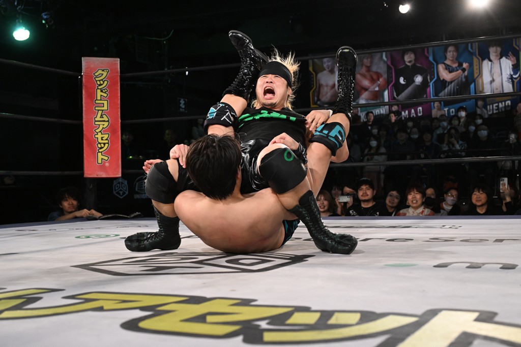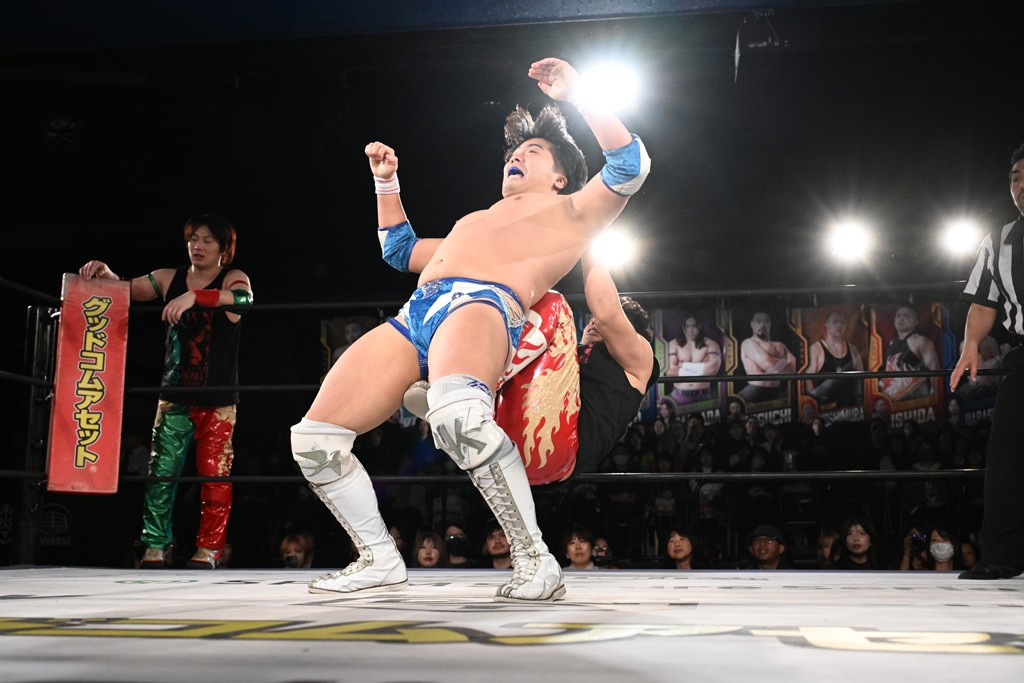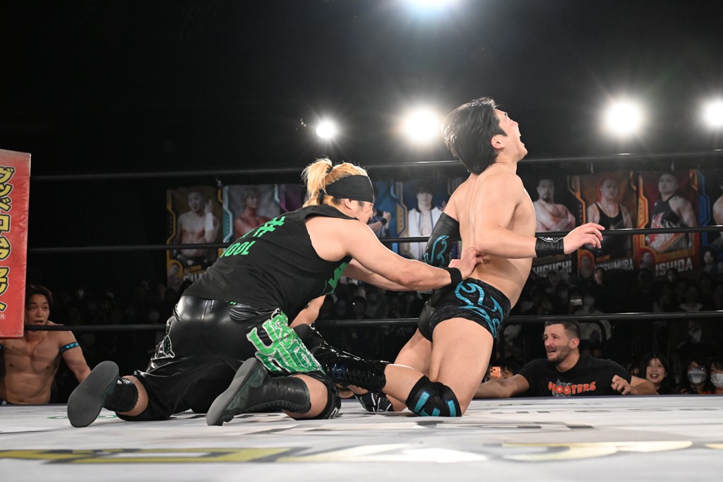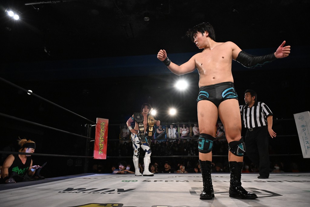 この日のメインイベントで、上野はTo-yとのコンビで正田&ヤス・ウラノと対戦。To-yがウラノにマシンガンチョップを叩き込めば、ウラノはTo-yの背中をかきむしる。正田は気迫をみなぎらせて、上野とエルボーのラリー、ラリアット相打ち。ミドルキック連打、張り手もぶちかます。上野が投げ捨てジャーマンを見舞えば、正田も同じ技で返す。正田が上野にジャーマン・スープレックス・ホールドもカウント2。上野は正田にフロッグスプラッシュ、スタンド式シャイニング・ウィザードも2カウントで返した。上野は飛びついてBlackout Sleeperで絞め上げると、正田が気を失ってレフェリーストップ。試合後、意識を取り戻した正田は猛然と上野に突っかかっていくも、パートナー、セコンド陣が制止した。