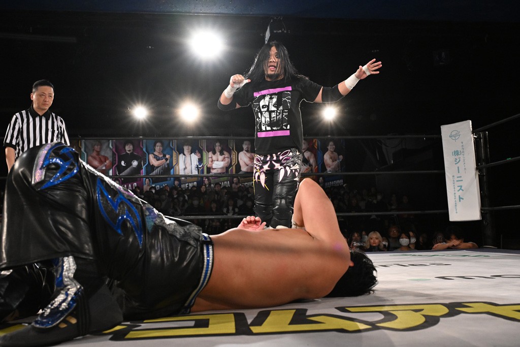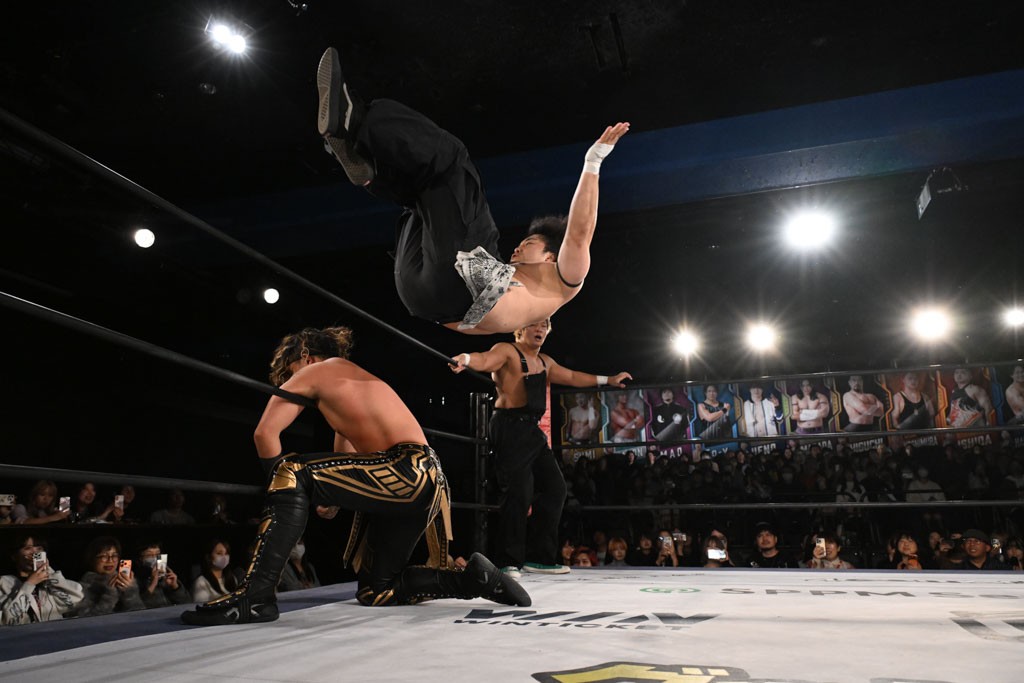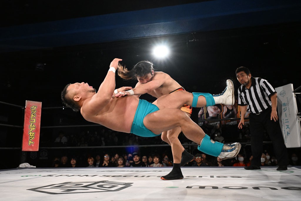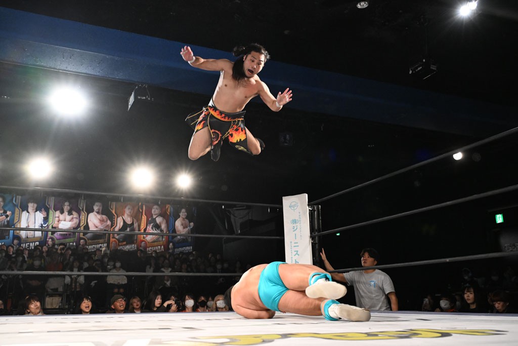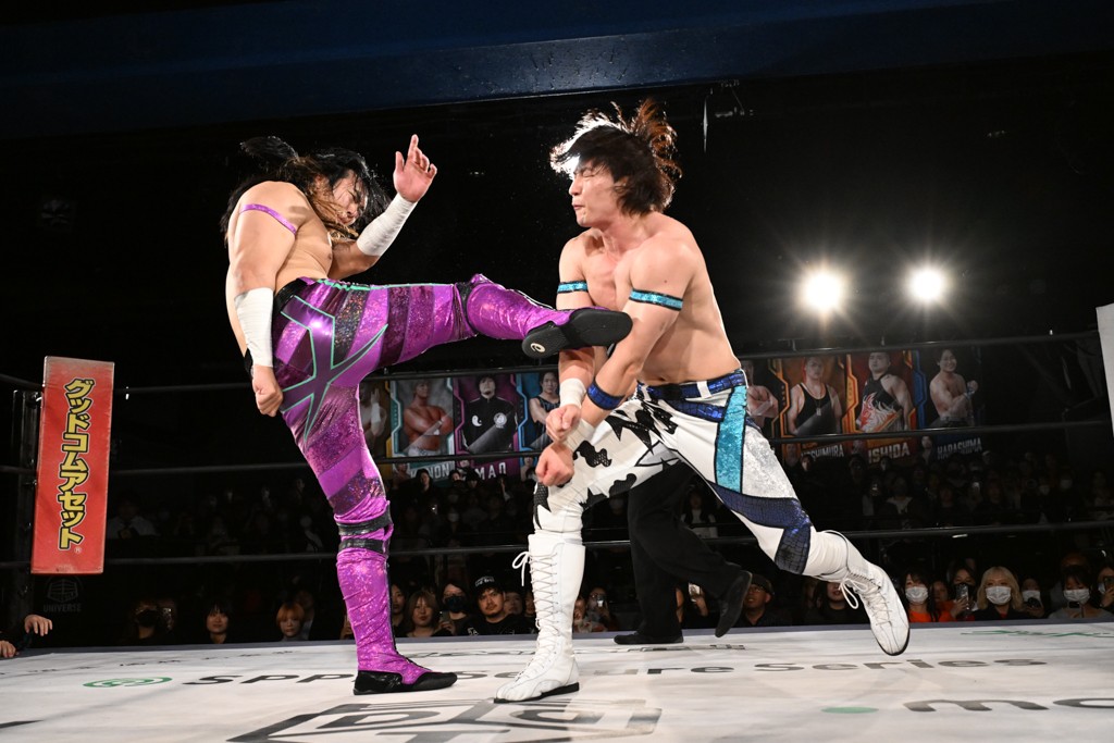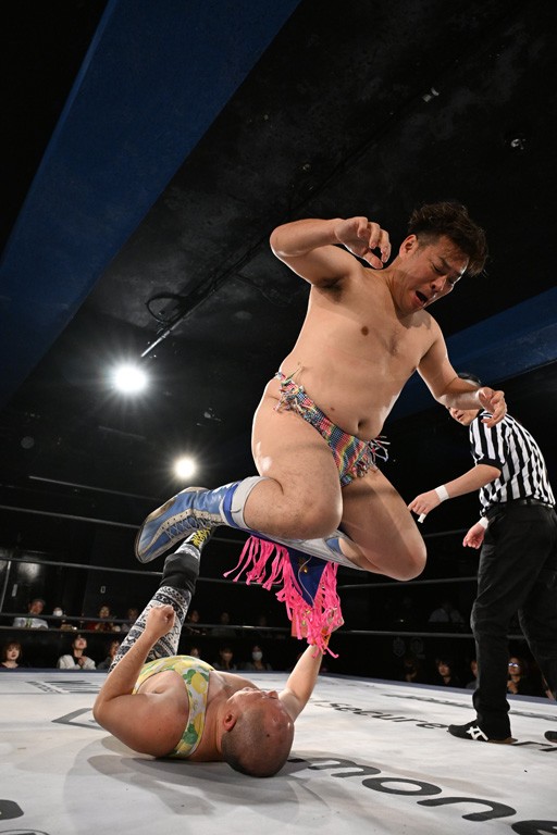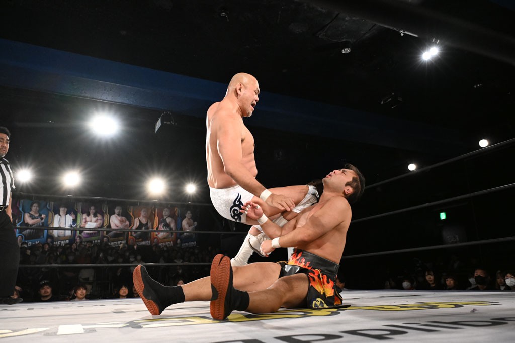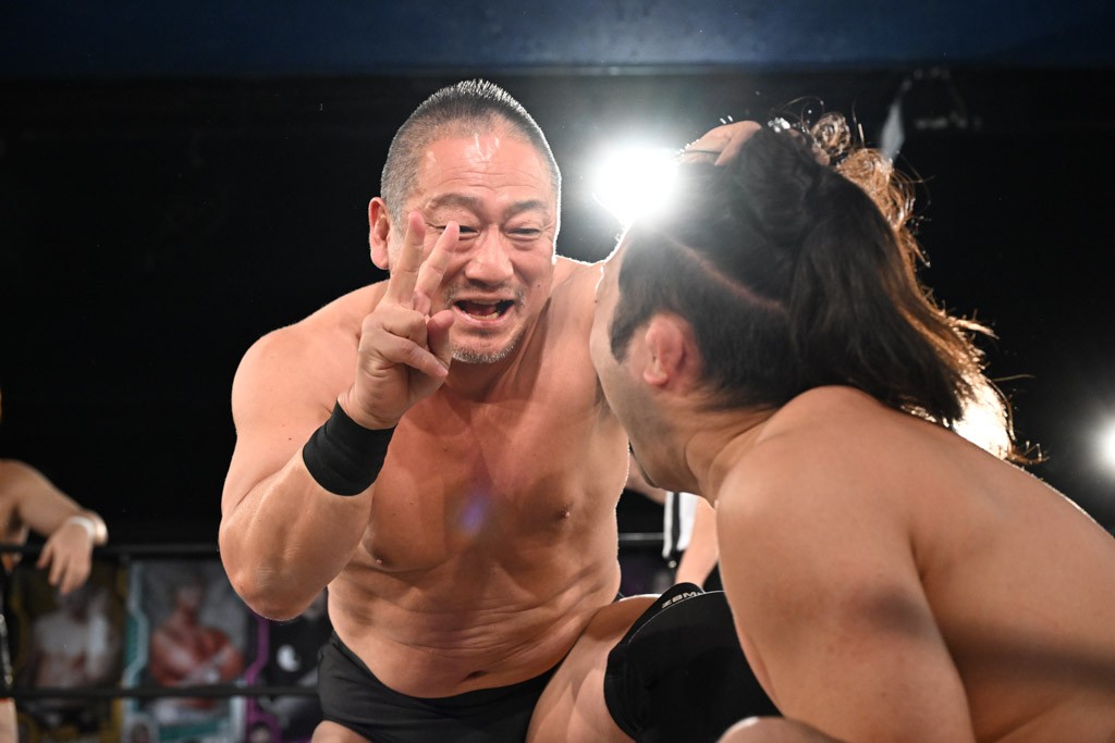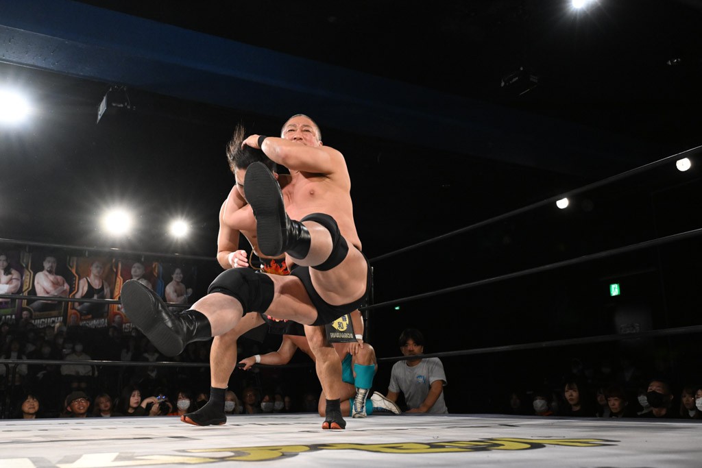 この日のメインイベントで、上野はTo-yとのコンビで正田&ヤス・ウラノと対戦。To-yがウラノにマシンガンチョップを叩き込めば、ウラノはTo-yの背中をかきむしる。正田は気迫をみなぎらせて、上野とエルボーのラリー、ラリアット相打ち。ミドルキック連打、張り手もぶちかます。上野が投げ捨てジャーマンを見舞えば、正田も同じ技で返す。正田が上野にジャーマン・スープレックス・ホールドもカウント2。上野は正田にフロッグスプラッシュ、スタンド式シャイニング・ウィザードも2カウントで返した。上野は飛びついてBlackout Sleeperで絞め上げると、正田が気を失ってレフェリーストップ。試合後、意識を取り戻した正田は猛然と上野に突っかかっていくも、パートナー、セコンド陣が制止した。