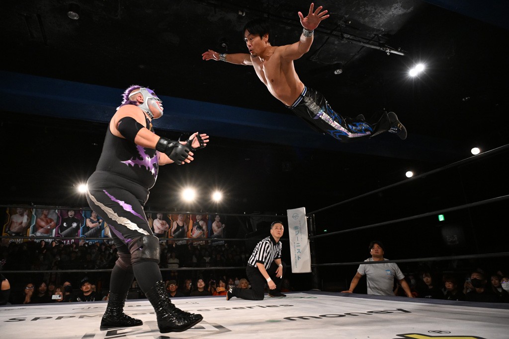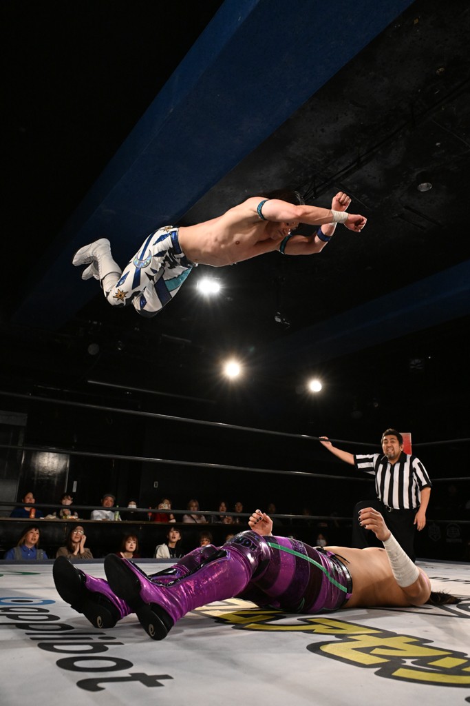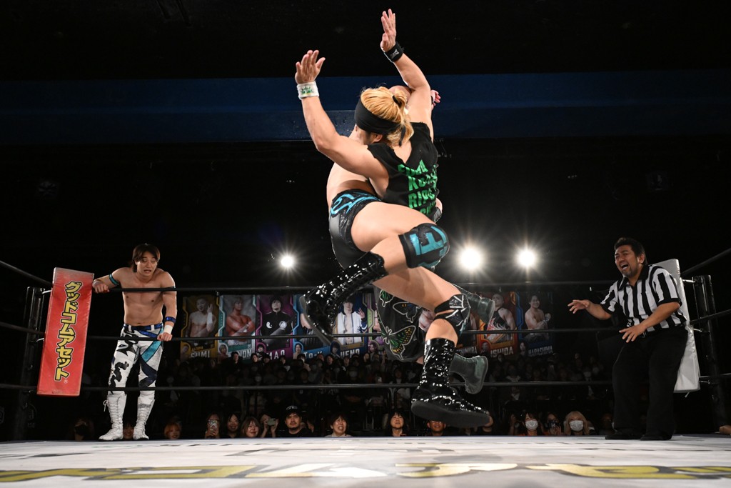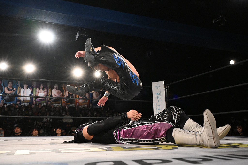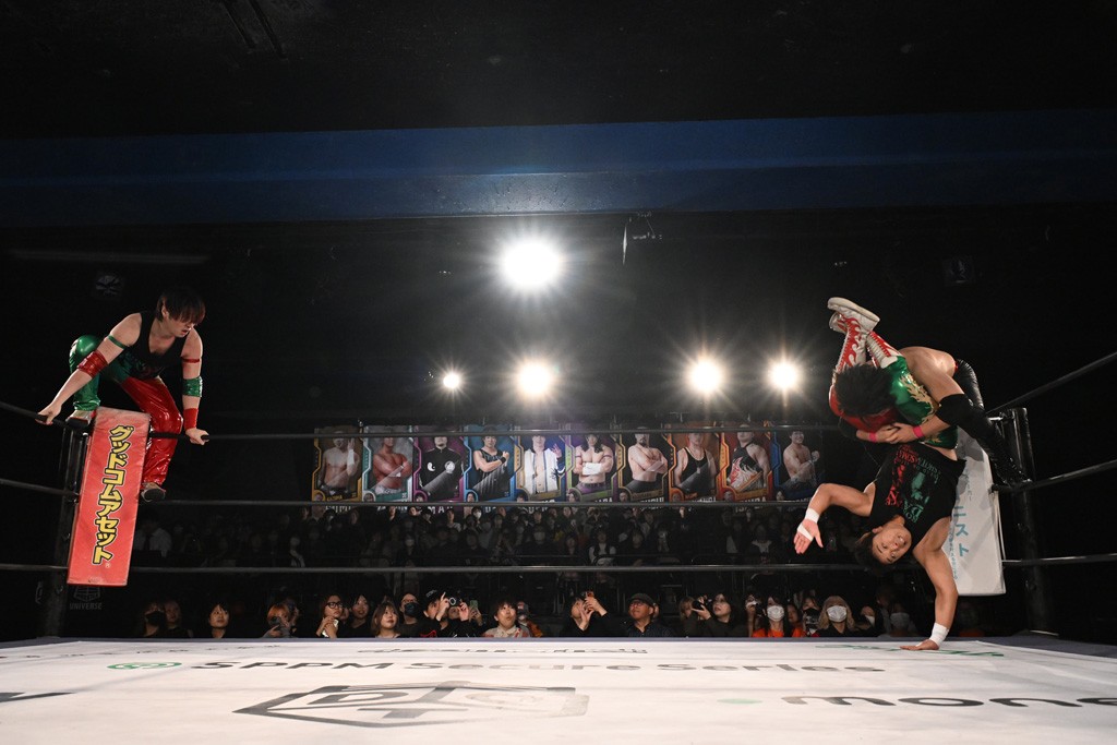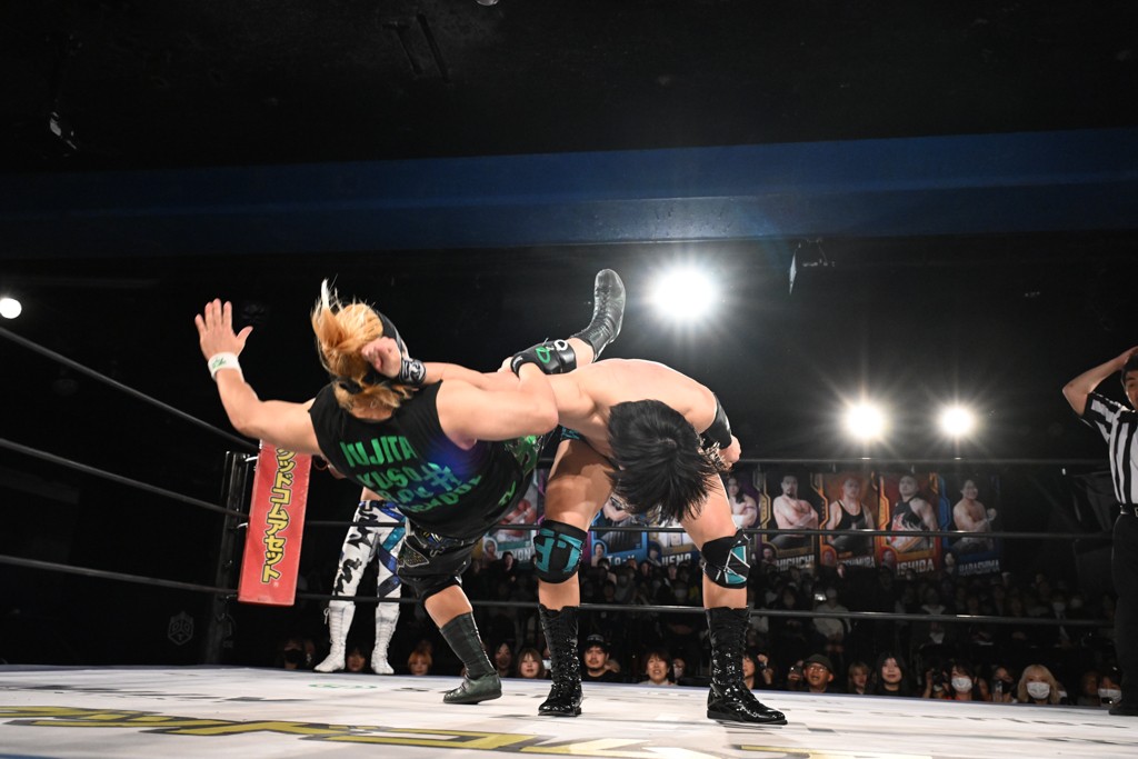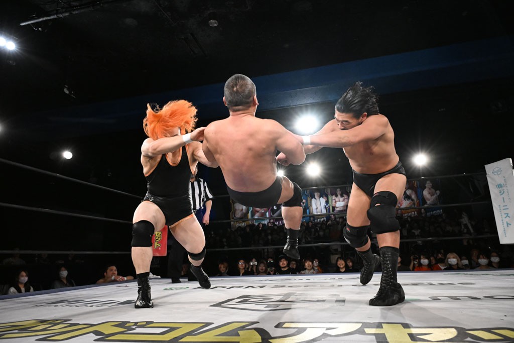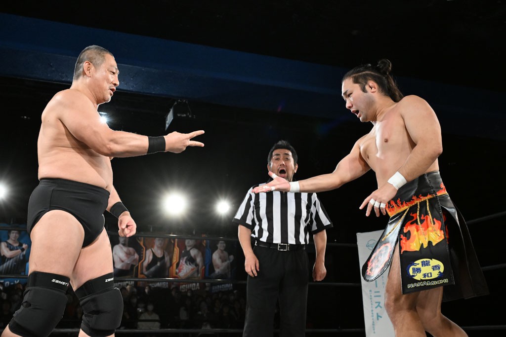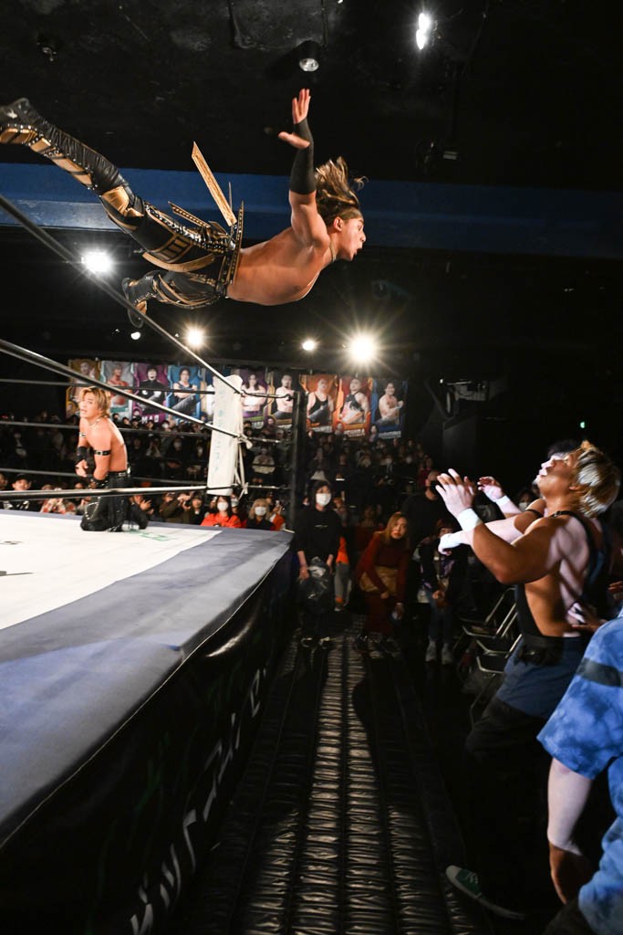 この日のメインイベントで、上野はTo-yとのコンビで正田&ヤス・ウラノと対戦。To-yがウラノにマシンガンチョップを叩き込めば、ウラノはTo-yの背中をかきむしる。正田は気迫をみなぎらせて、上野とエルボーのラリー、ラリアット相打ち。ミドルキック連打、張り手もぶちかます。上野が投げ捨てジャーマンを見舞えば、正田も同じ技で返す。正田が上野にジャーマン・スープレックス・ホールドもカウント2。上野は正田にフロッグスプラッシュ、スタンド式シャイニング・ウィザードも2カウントで返した。上野は飛びついてBlackout Sleeperで絞め上げると、正田が気を失ってレフェリーストップ。試合後、意識を取り戻した正田は猛然と上野に突っかかっていくも、パートナー、セコンド陣が制止した。