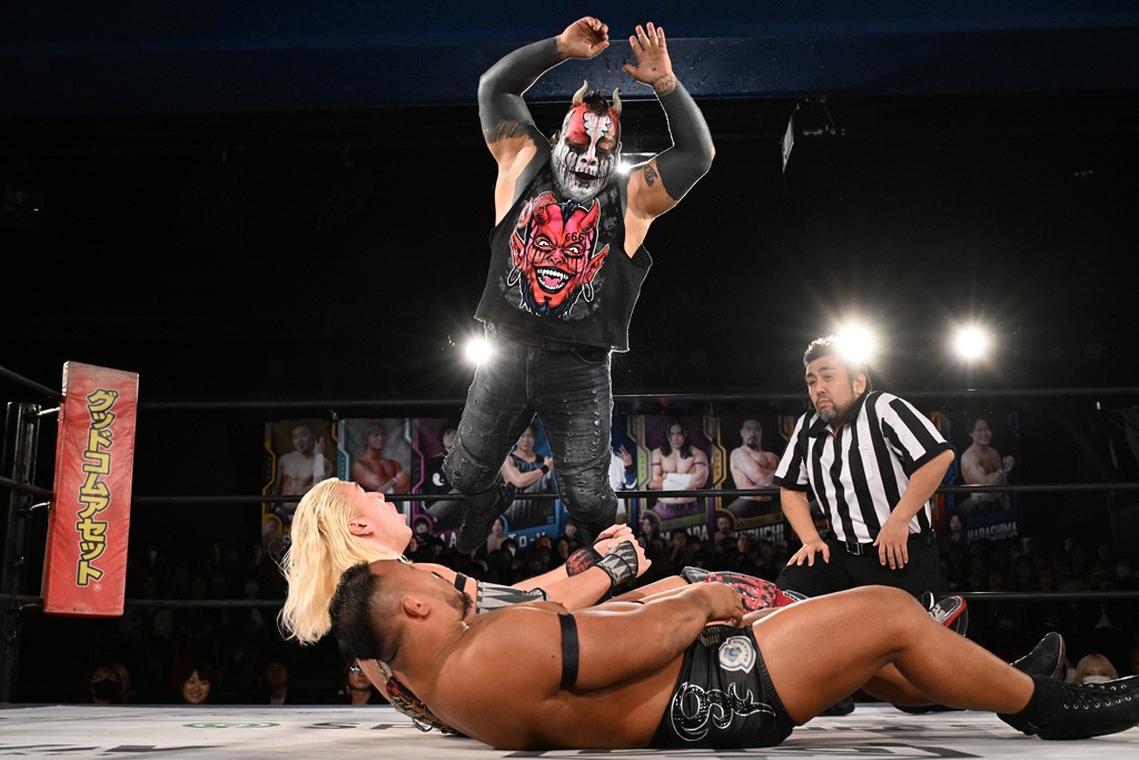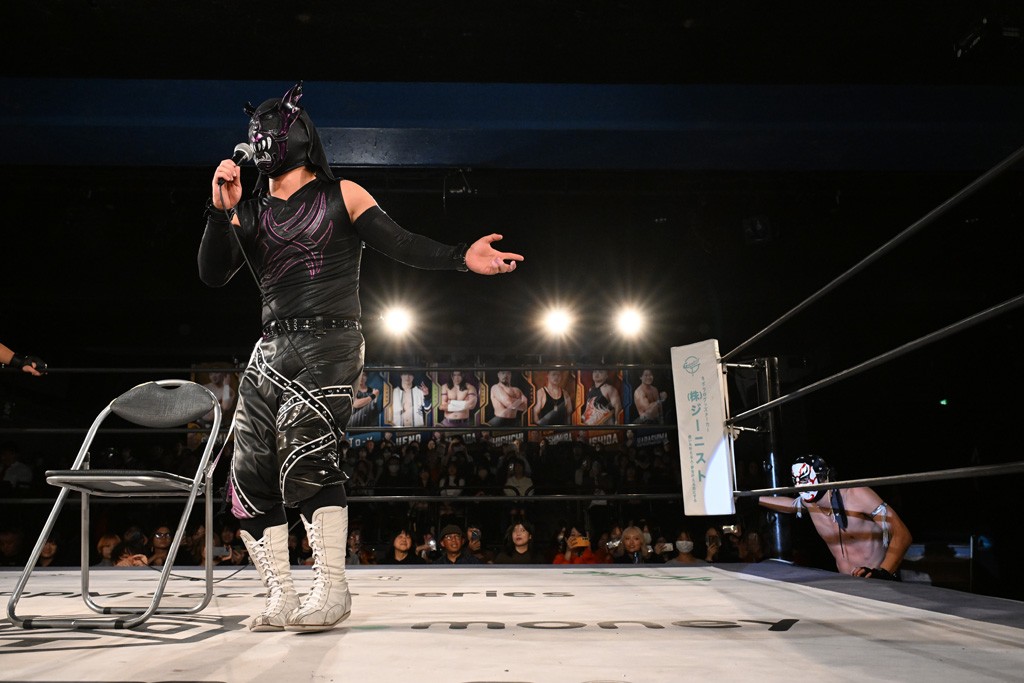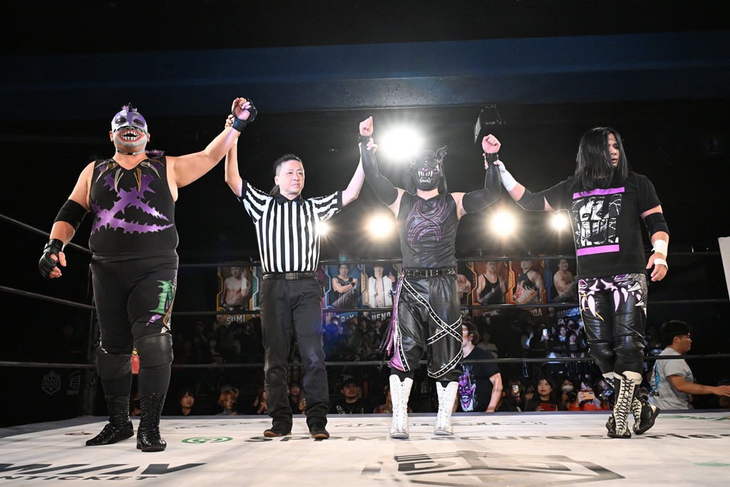 DAMNATION T.Aのイルシオンがダンスパフォーマンス集団「O-MENZ」の隈取に反則ざんまいで勝利し、12・24新宿FACEでの一騎打ちを迫った。