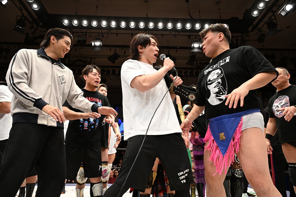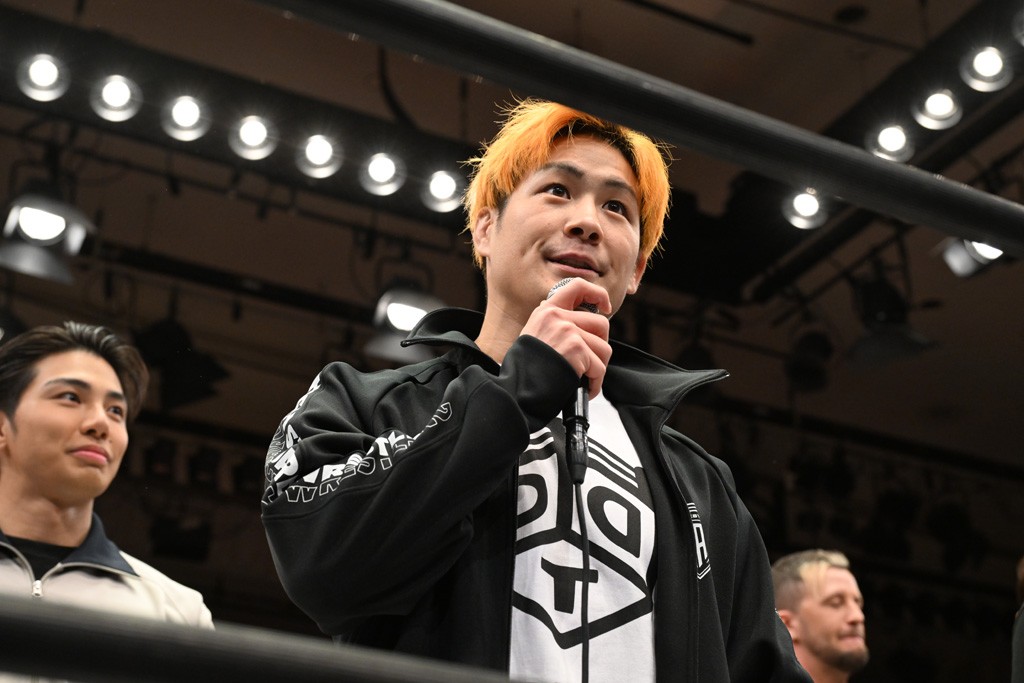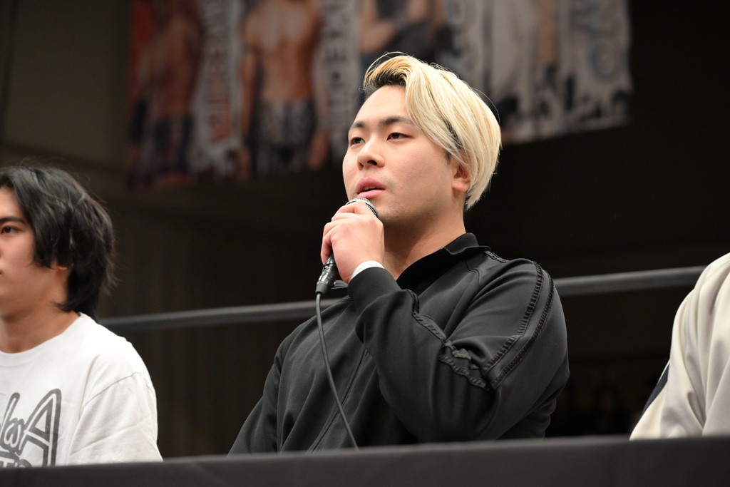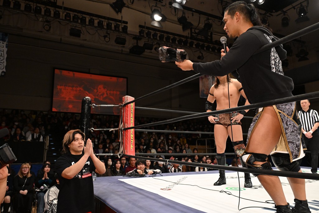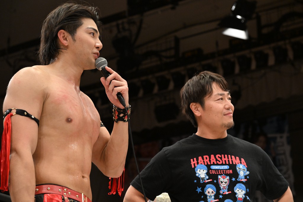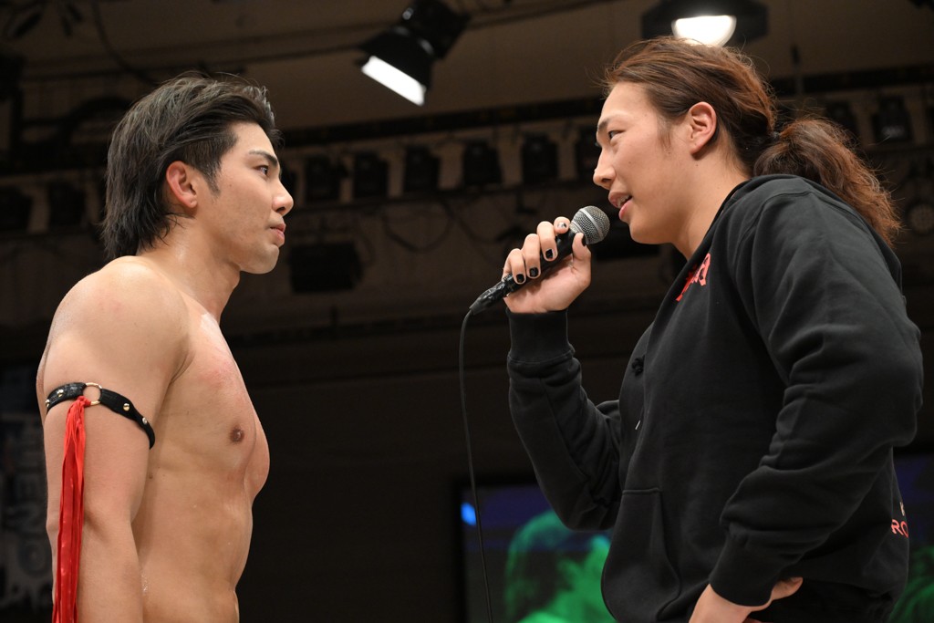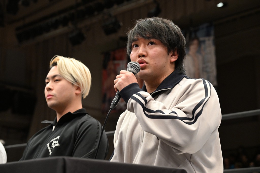 HARASHIMAが「最強で最高の相手。でも大丈夫。僕たちでガッチリやるから。頑張ろう!」と言えば、武知は「新年早々、こんなにビックリする対戦相手だとは思わなかったです。でも、僕はこの1年、覚悟を決めて、このリングに上がると決めてます。一発目にこんなに大尊敬する、お二人から熱い言葉をいただけて正直すごい幸せです。ですが、その幸せな気持ちを胸に、新人ながら全力で暴れて、がむしゃらに勝ちをどん欲に狙っていきます。足元すくわれないようにお気をつけください」と堂々たるマイクで返した。