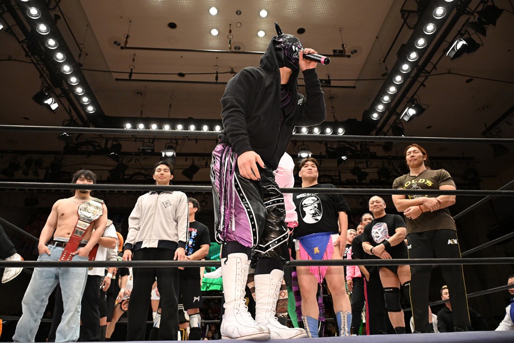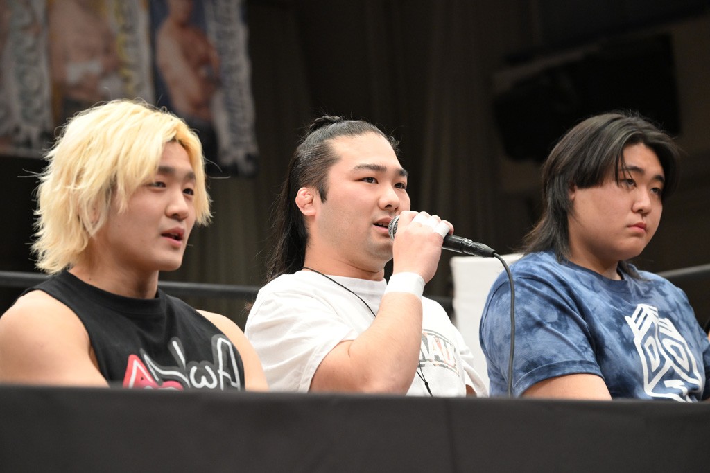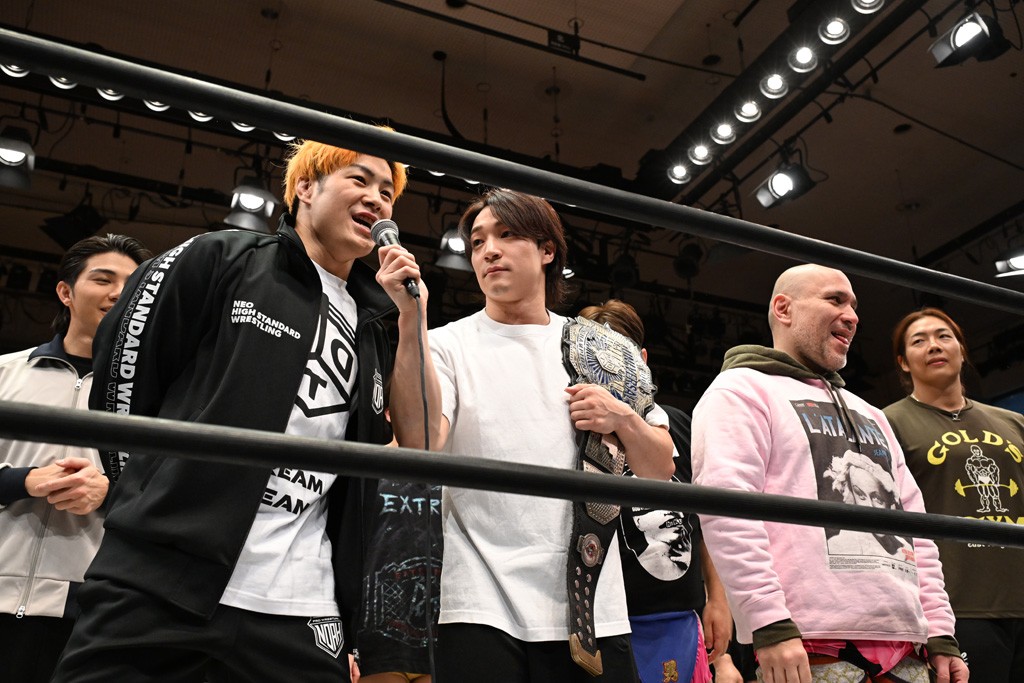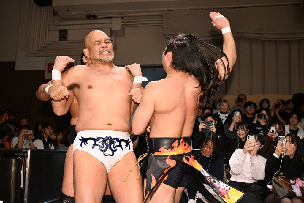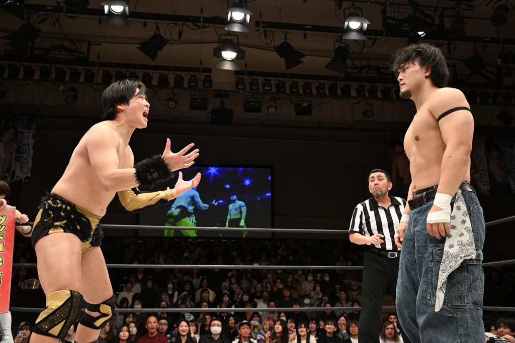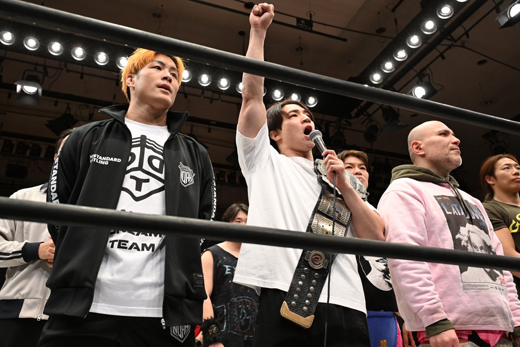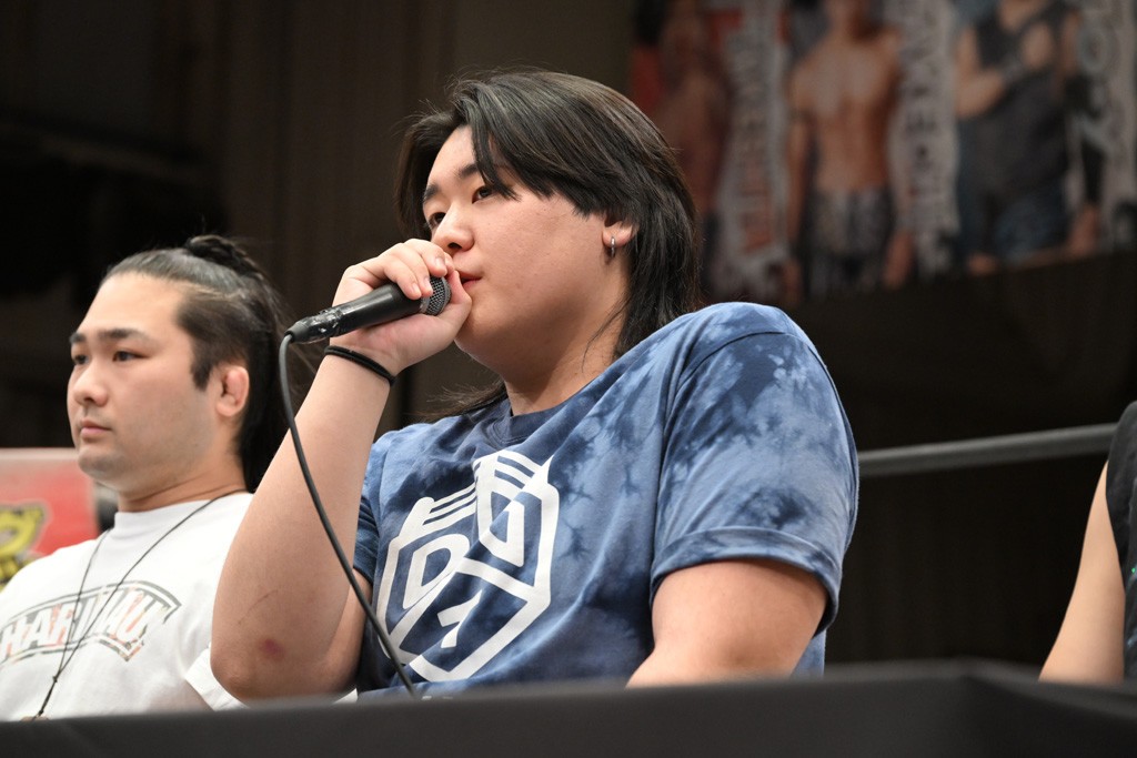 HARASHIMAが「最強で最高の相手。でも大丈夫。僕たちでガッチリやるから。頑張ろう!」と言えば、武知は「新年早々、こんなにビックリする対戦相手だとは思わなかったです。でも、僕はこの1年、覚悟を決めて、このリングに上がると決めてます。一発目にこんなに大尊敬する、お二人から熱い言葉をいただけて正直すごい幸せです。ですが、その幸せな気持ちを胸に、新人ながら全力で暴れて、がむしゃらに勝ちをどん欲に狙っていきます。足元すくわれないようにお気をつけください」と堂々たるマイクで返した。