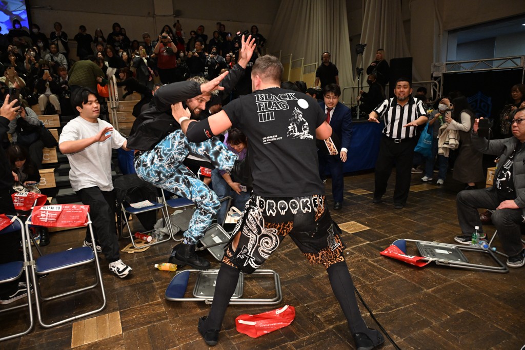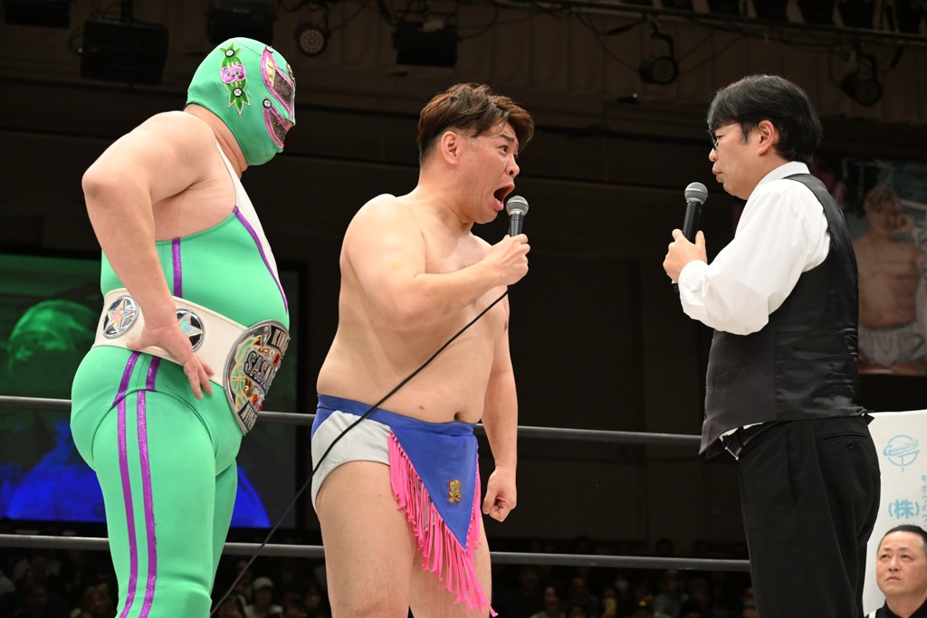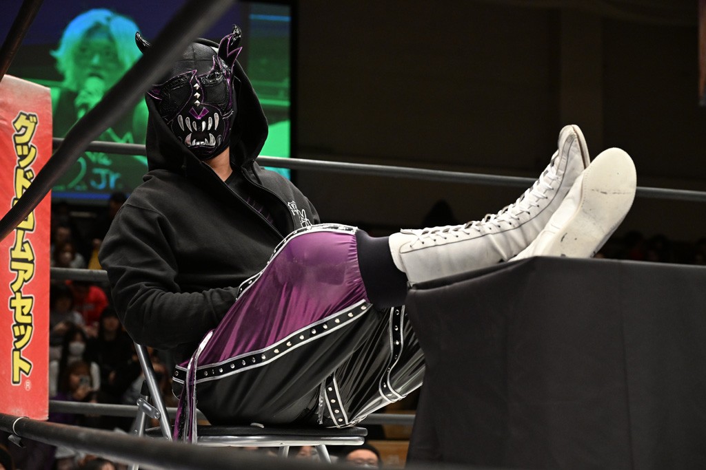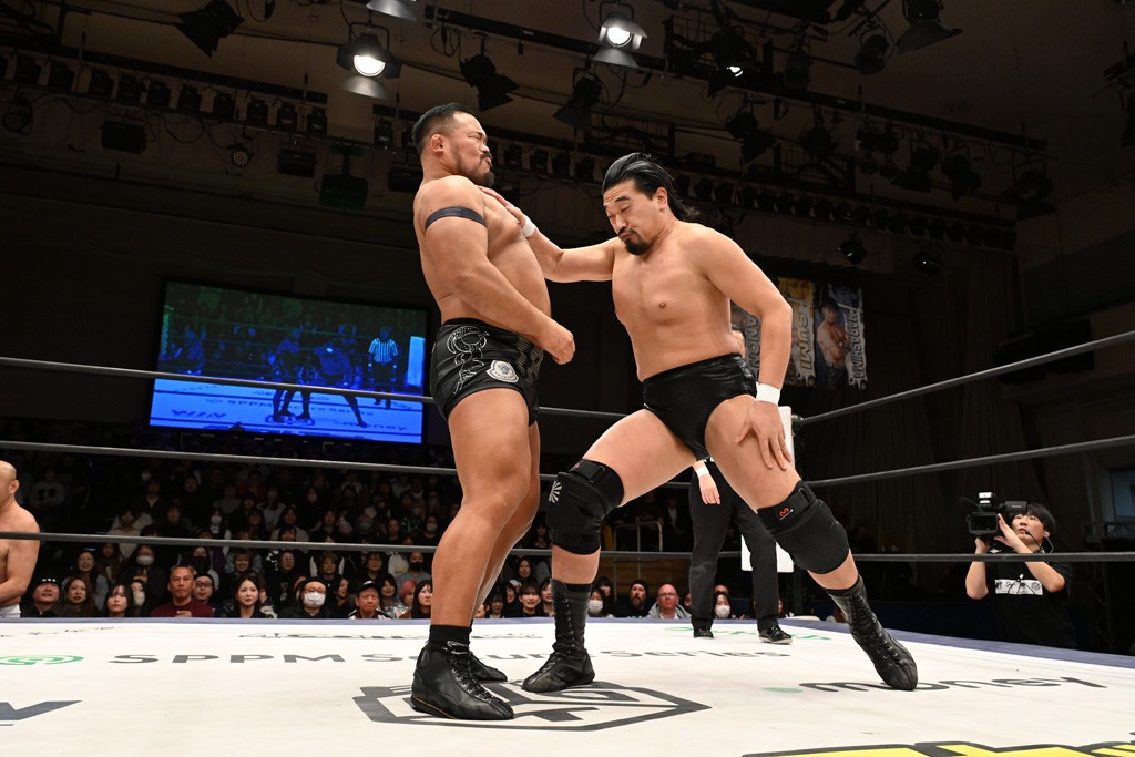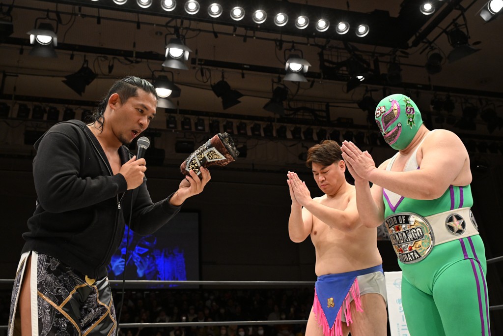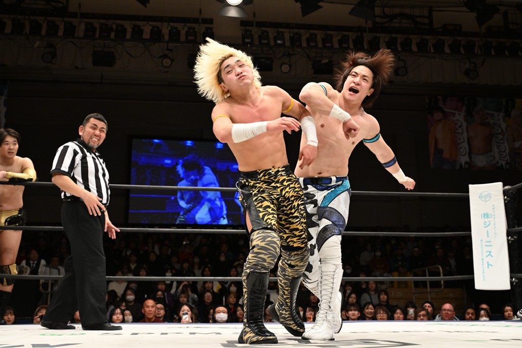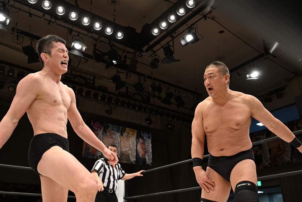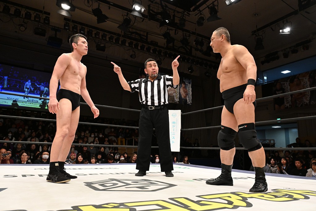 HARASHIMAが「最強で最高の相手。でも大丈夫。僕たちでガッチリやるから。頑張ろう!」と言えば、武知は「新年早々、こんなにビックリする対戦相手だとは思わなかったです。でも、僕はこの1年、覚悟を決めて、このリングに上がると決めてます。一発目にこんなに大尊敬する、お二人から熱い言葉をいただけて正直すごい幸せです。ですが、その幸せな気持ちを胸に、新人ながら全力で暴れて、がむしゃらに勝ちをどん欲に狙っていきます。足元すくわれないようにお気をつけください」と堂々たるマイクで返した。