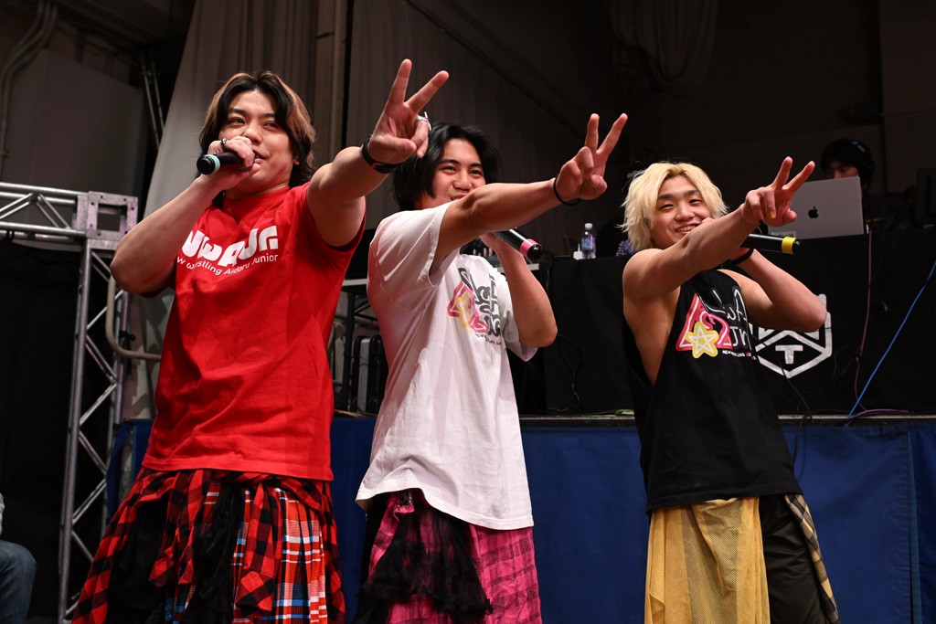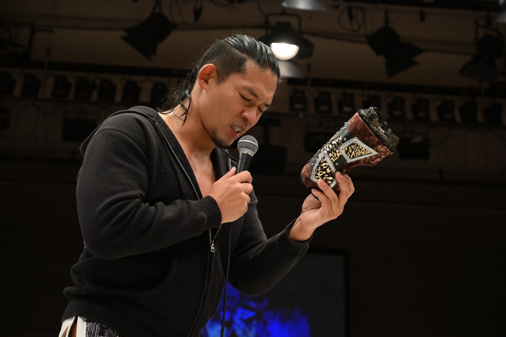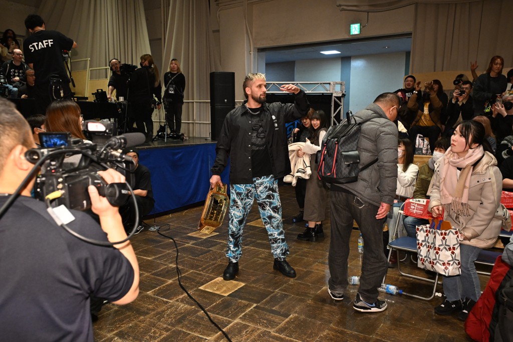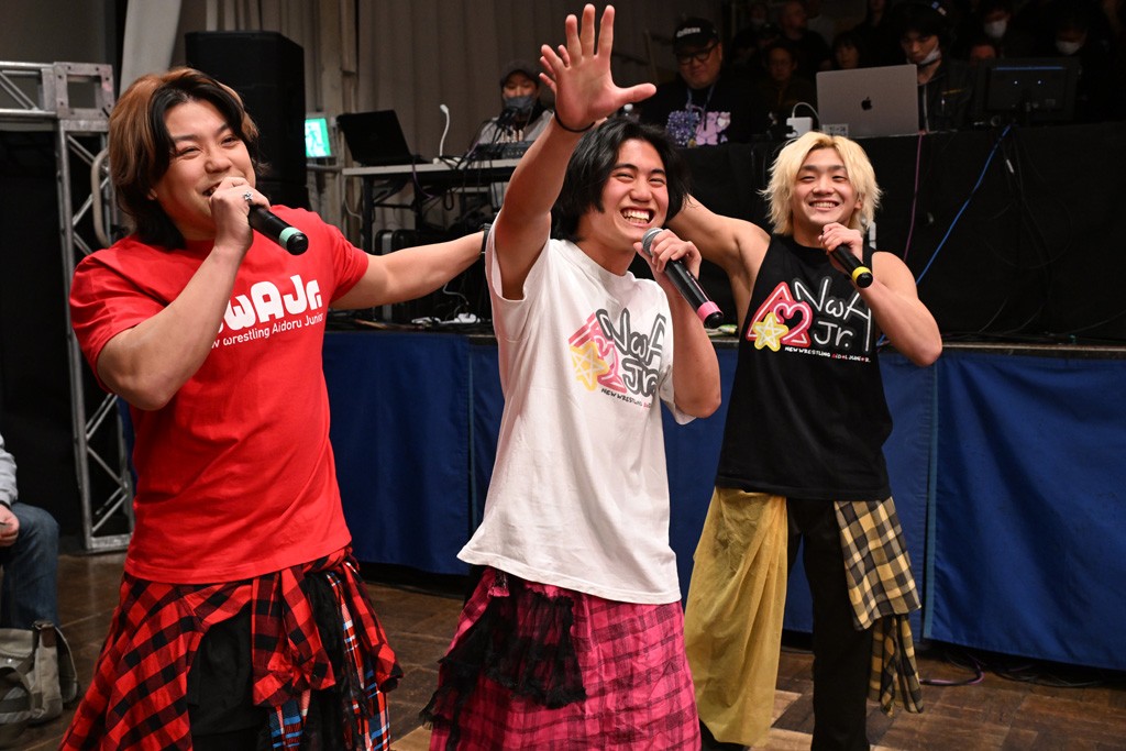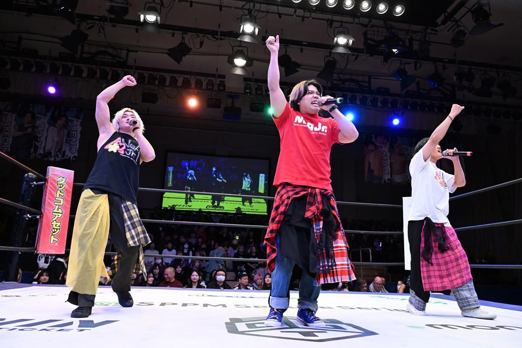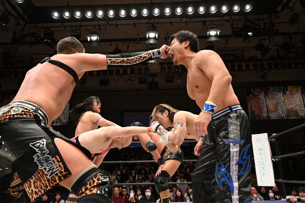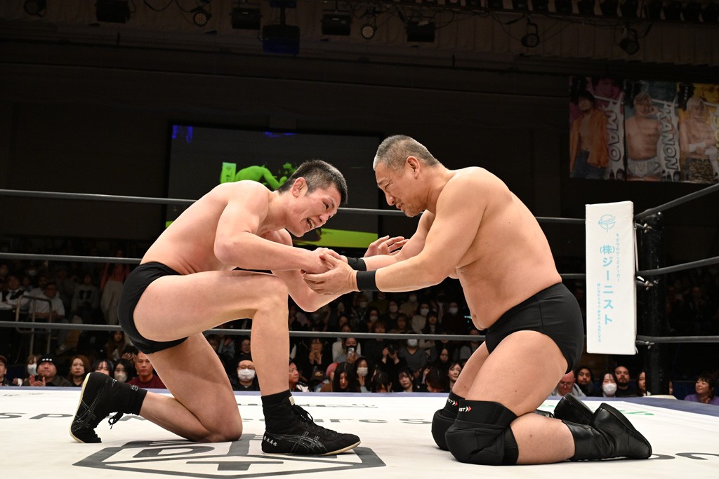 HARASHIMAが「最強で最高の相手。でも大丈夫。僕たちでガッチリやるから。頑張ろう!」と言えば、武知は「新年早々、こんなにビックリする対戦相手だとは思わなかったです。でも、僕はこの1年、覚悟を決めて、このリングに上がると決めてます。一発目にこんなに大尊敬する、お二人から熱い言葉をいただけて正直すごい幸せです。ですが、その幸せな気持ちを胸に、新人ながら全力で暴れて、がむしゃらに勝ちをどん欲に狙っていきます。足元すくわれないようにお気をつけください」と堂々たるマイクで返した。