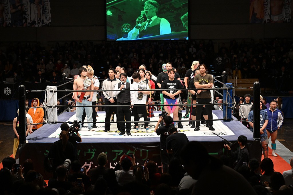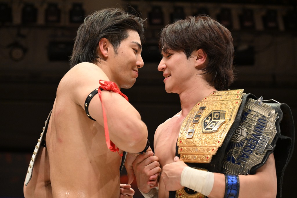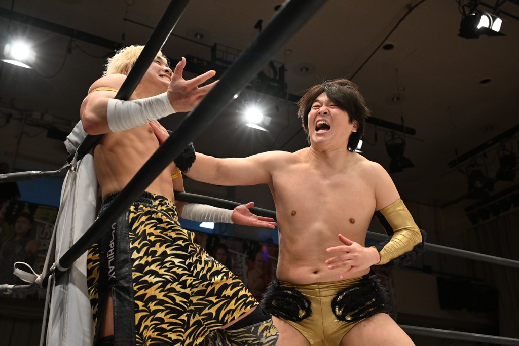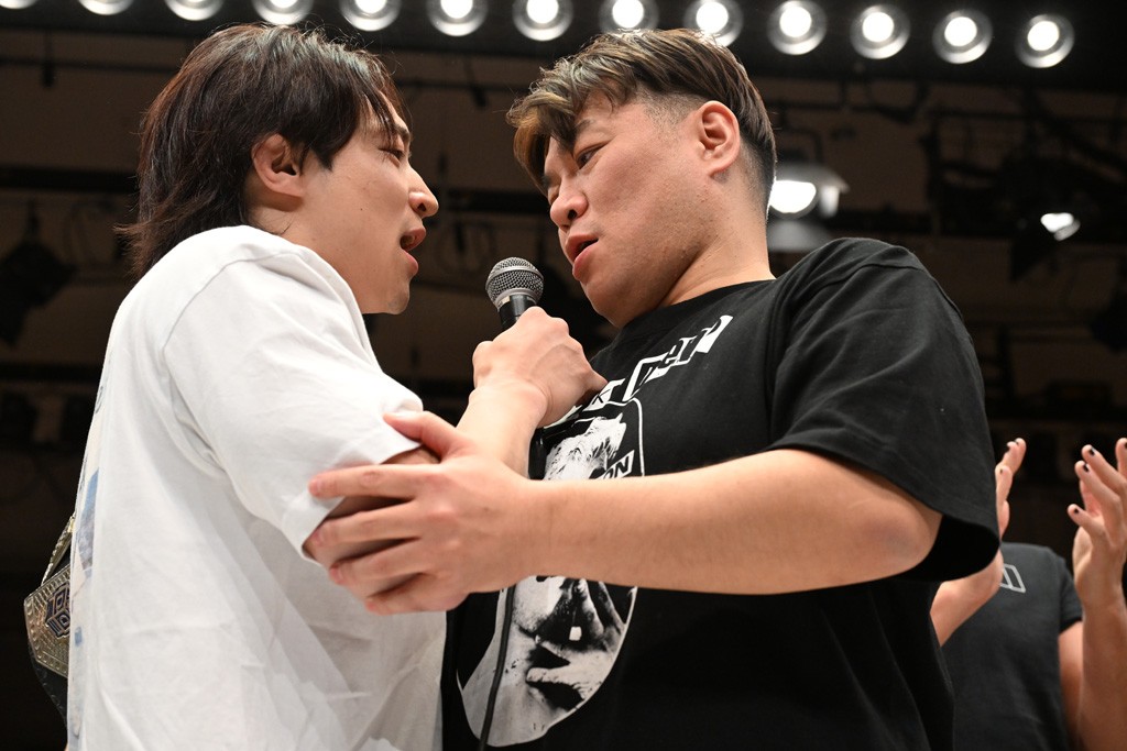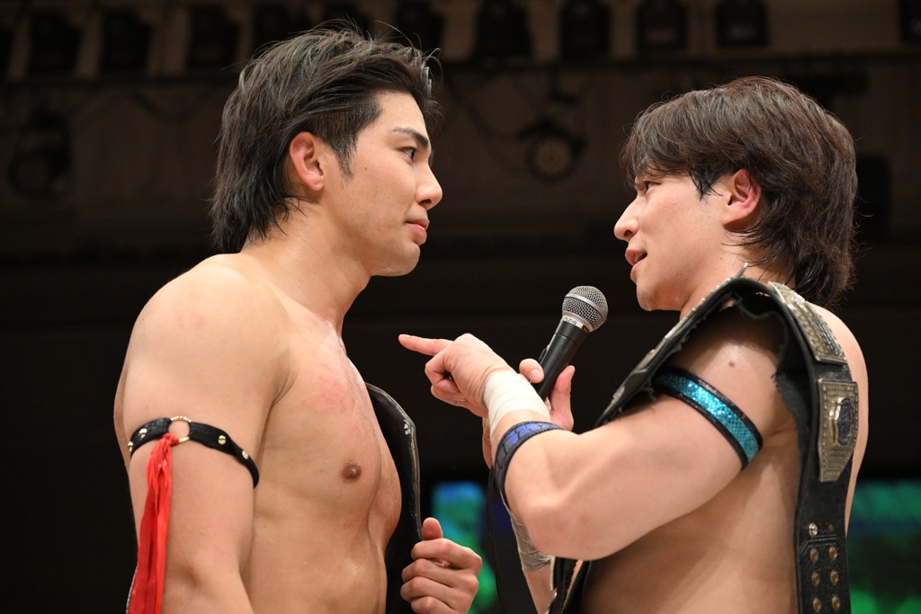 そして、武知は「実はもう1個あるんです。僕が2周年大会をやらせていただきます、2月22日、上野選手、僕のお願いでなんとかシングルをやってもらえないですか?」と、これまで常に隣でサポートしてきた上野との一騎打ちを希望。上野は「いいの? 海青、俺も願ってたよ。そろそろシングルマッチやって、海青のこと、ボコボコにしたいと思ってた」と快諾し、自身初のシングル戦が決まった。