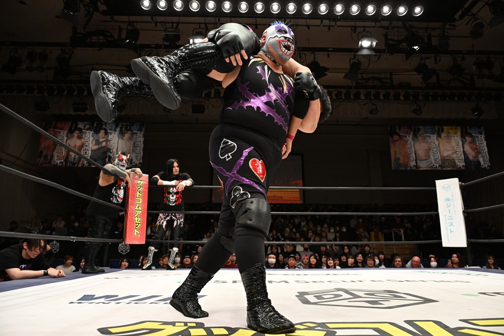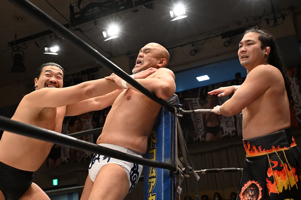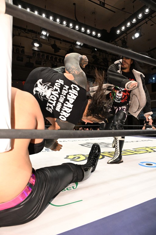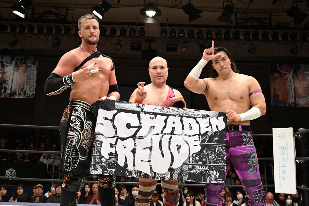SCHADENFREUDE Internationalは2023年11・12両国国技館大会終了後、クリス、高梨将弘、アントーニオ本多、正田壮史の4人が決起して結成され、独自の世界観で活躍してきた。だが、昨年3・20後楽園大会で高梨が首を負傷し長期欠場中。同年12・21後楽園で上野勇希の持つKO-D無差別級王座獲りがならなかった正田が離脱を表明し、今大会が正田のラストマッチとなった。