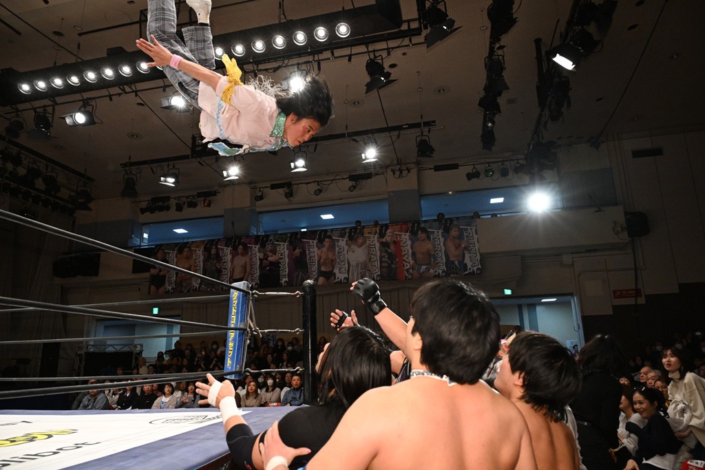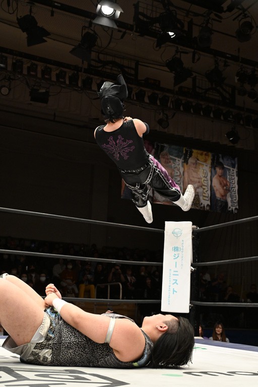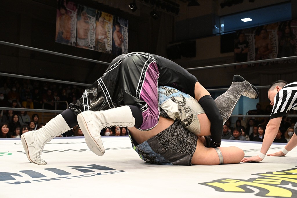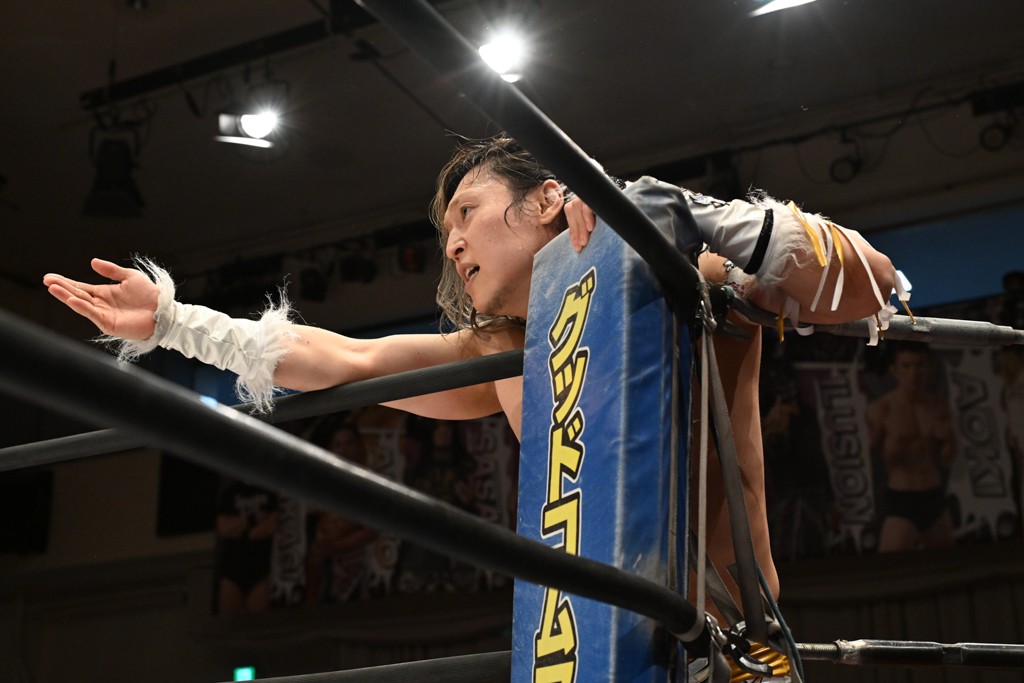 オープニングマッチに出場した宮脇は瑠希也と対戦。コーナーからのプランチャを見舞うと、左腕に集中砲火。瑠希也もエルボー連打で反撃するも、宮脇がドロップキック、ファルコンアロー、サンシャイン・ドライバーでトドメを刺した。